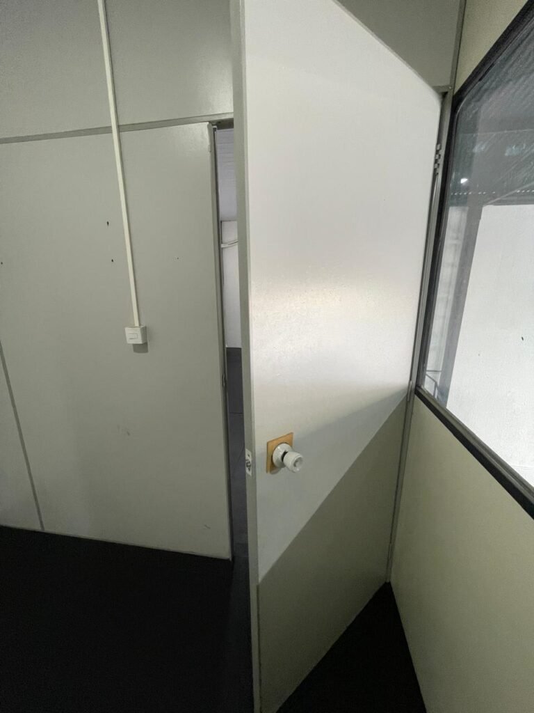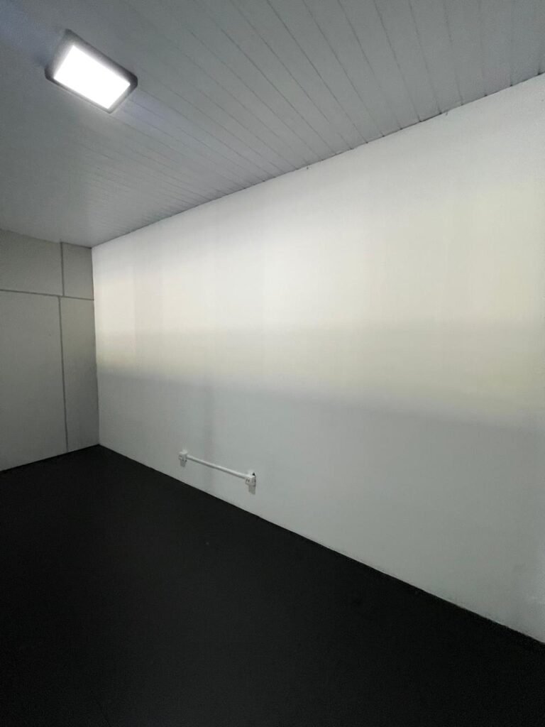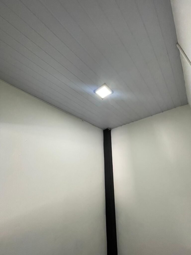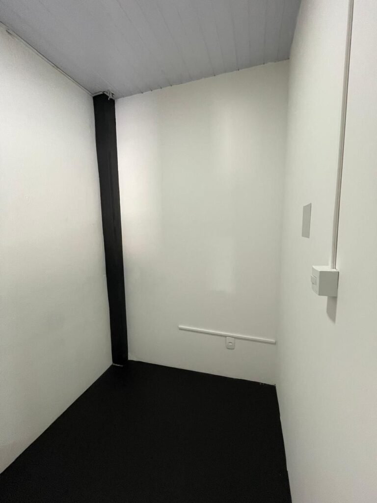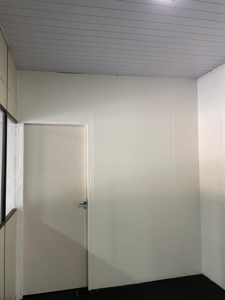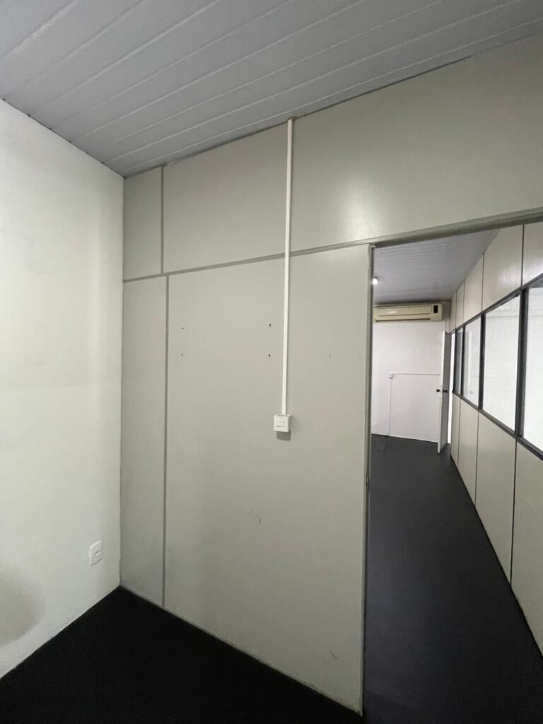 SALA 01-: Porta da divisória naval com pintura na cor preto nova e em ordem, com maçaneta com tranca embutida em ordem, piso de madeira com pintura na cor preta nova e em ordem, paredes com pintura na cor branco neve nova e em ordem, ar condicionado Rheem em ordem, divisória naval com porta cinza, janelas com 04 vidros lisos transparentes em ordem, 01 interruptor de luz, 02 tomadas duplas danificadas, 01 luminária plafon de sobrepor com Led em ordem, teto de PVC na cor branco em ordem.