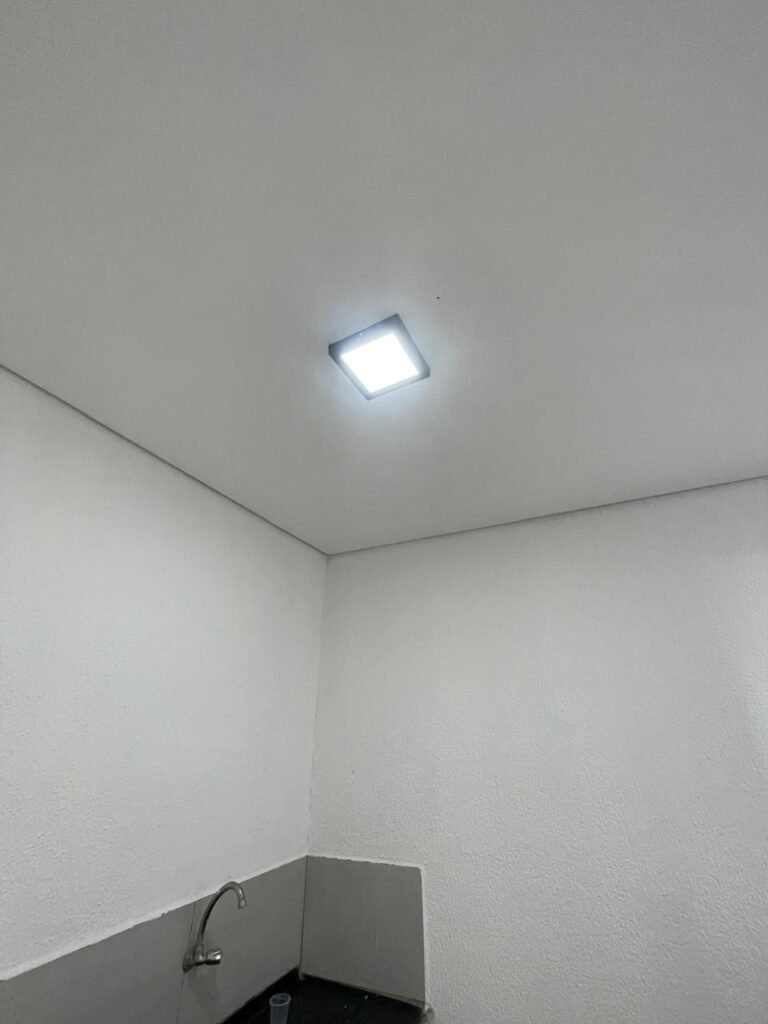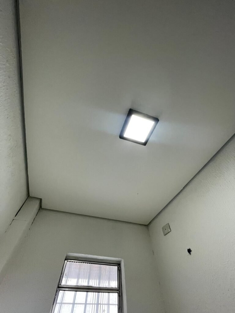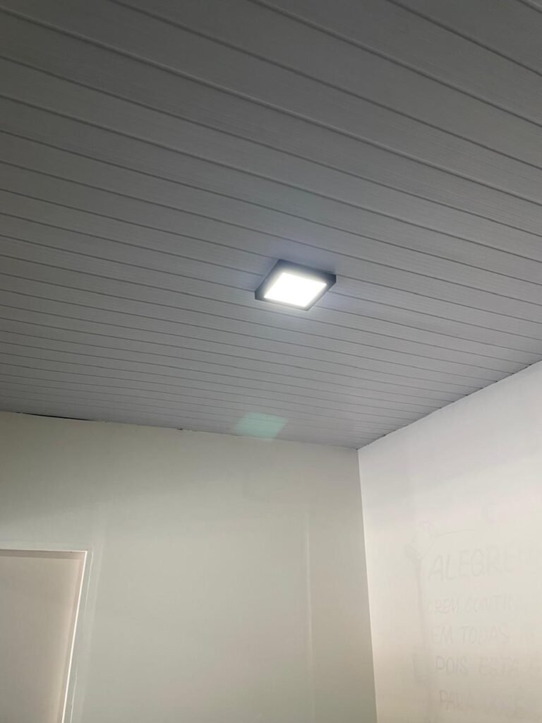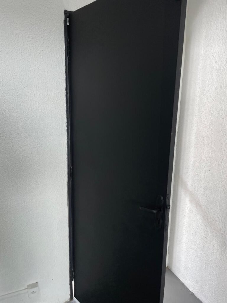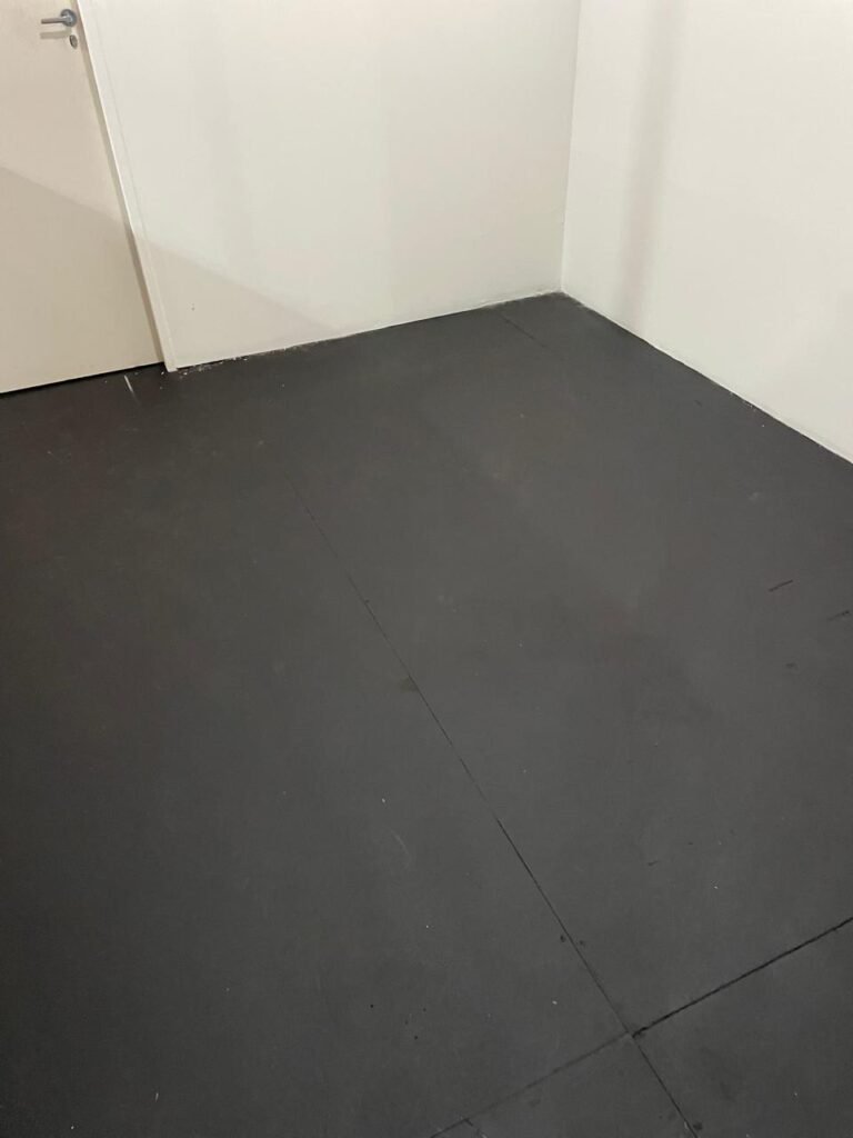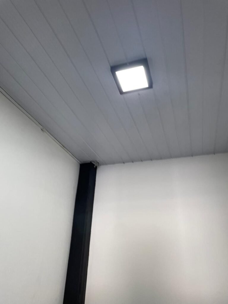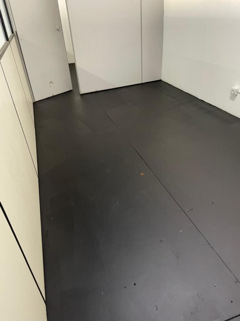 SALA 01-: Porta da divisória naval com pintura na cor preto nova e em ordem, com maçaneta com tranca embutida em ordem, piso de madeira com pintura na cor preta nova e em ordem, paredes com pintura na cor branco neve nova e em ordem, ar condicionado Rheem em ordem, divisória naval com porta cinza, janelas com 04 vidros lisos transparentes em ordem, 01 interruptor de luz, 02 tomadas duplas danificadas, 01 luminária plafon de sobrepor com Led em ordem, teto de PVC na cor branco em ordem.