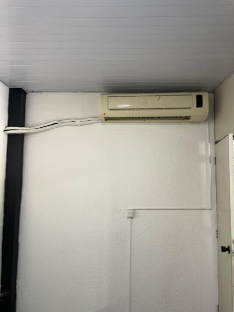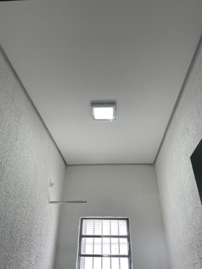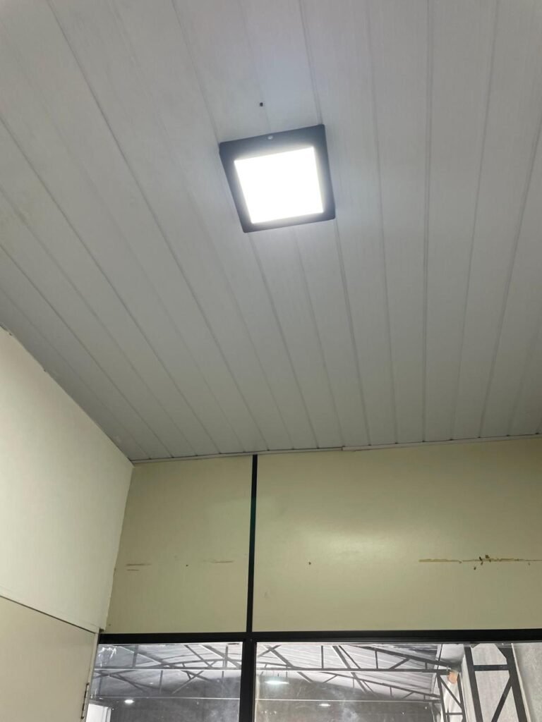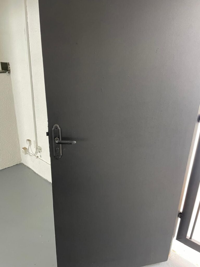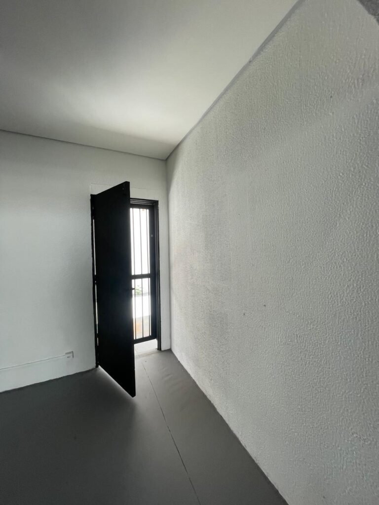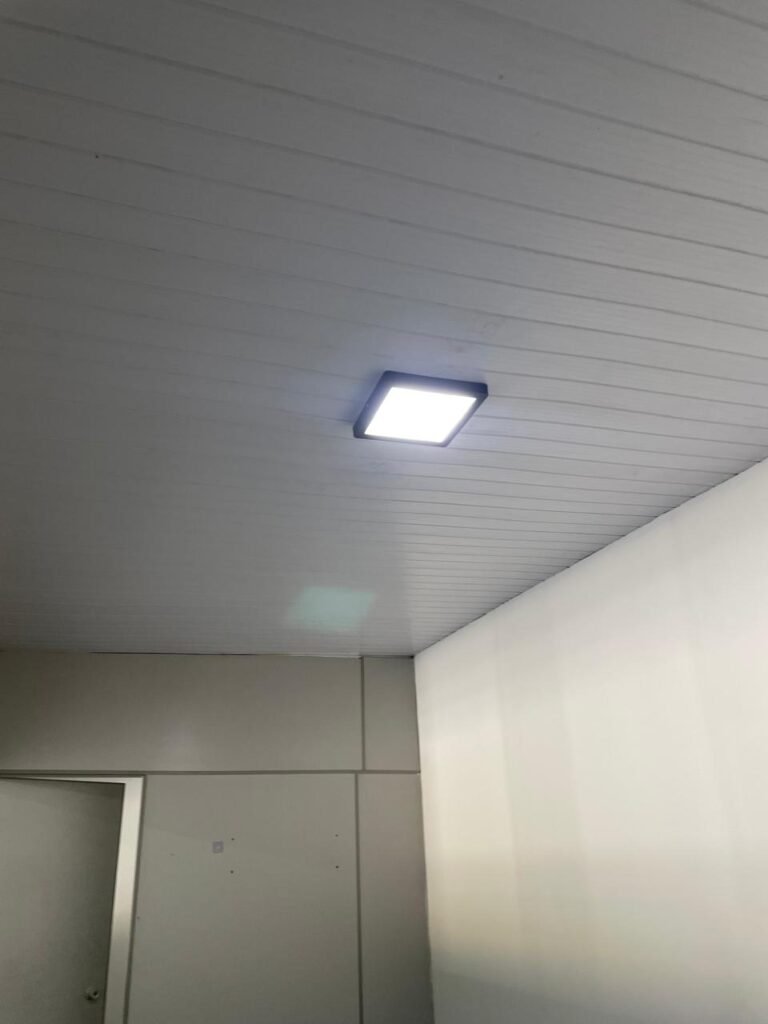SALA 01-: Porta da divisória naval com pintura na cor preto nova e em ordem, com maçaneta com tranca embutida em ordem, piso de madeira com pintura na cor preta nova e em ordem, paredes com pintura na cor branco neve nova e em ordem, ar condicionado Rheem em ordem, divisória naval com porta cinza, janelas com 04 vidros lisos transparentes em ordem, 01 interruptor de luz, 02 tomadas duplas danificadas, 01 luminária plafon de sobrepor com Led em ordem, teto de PVC na cor branco em ordem.