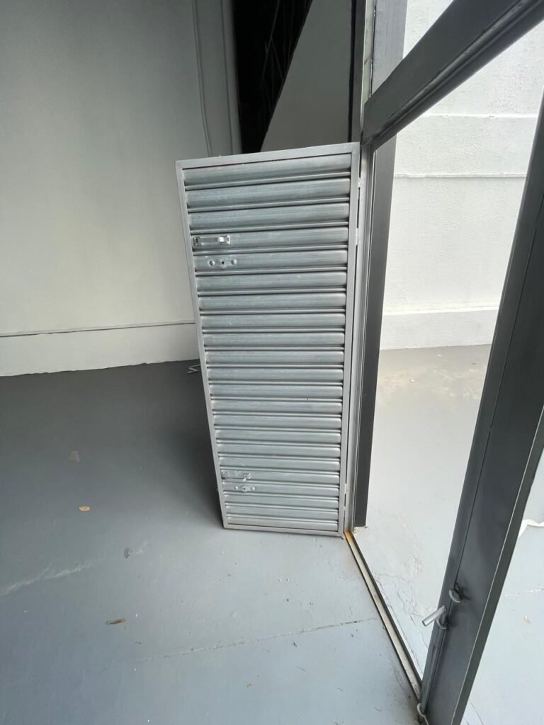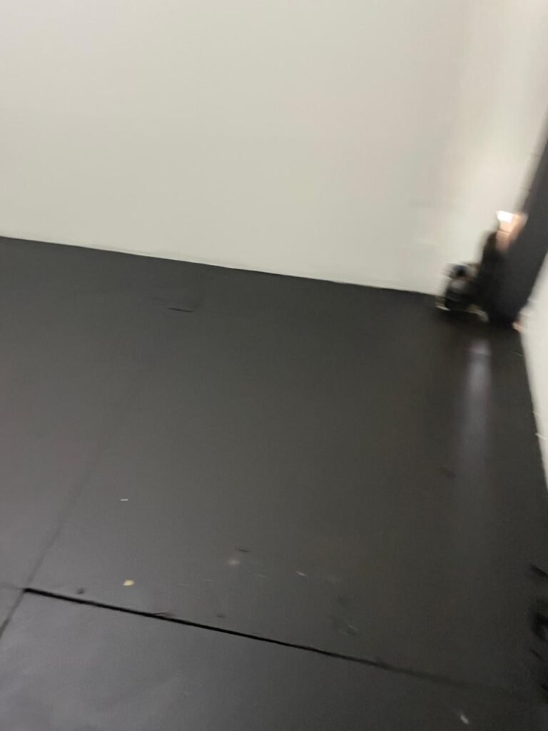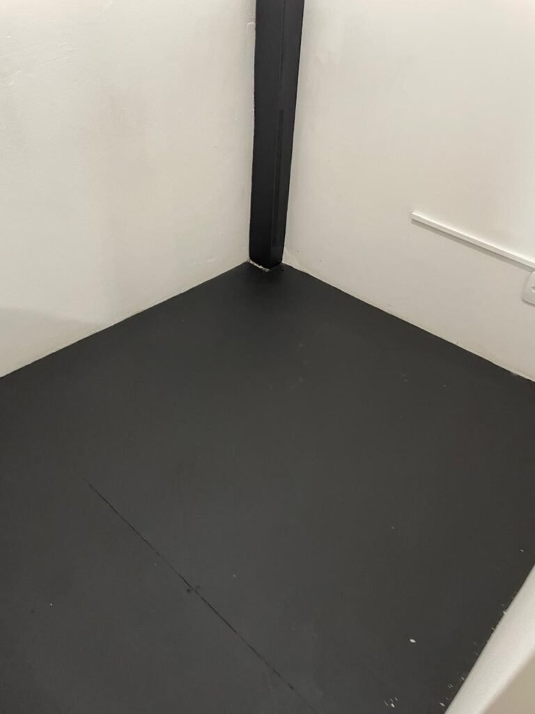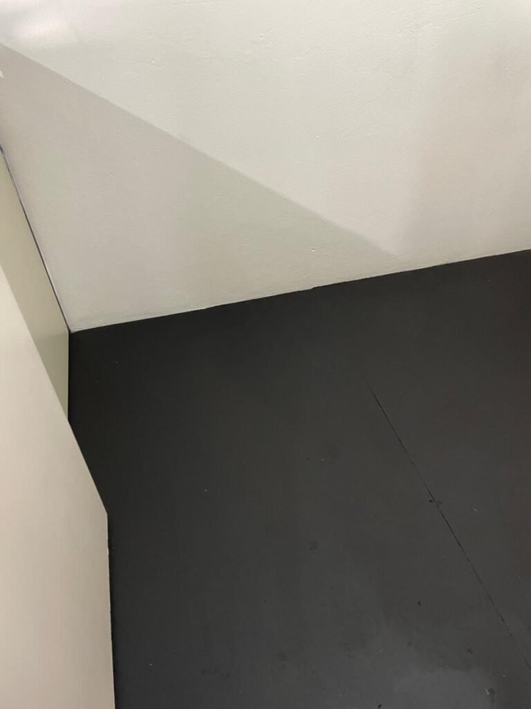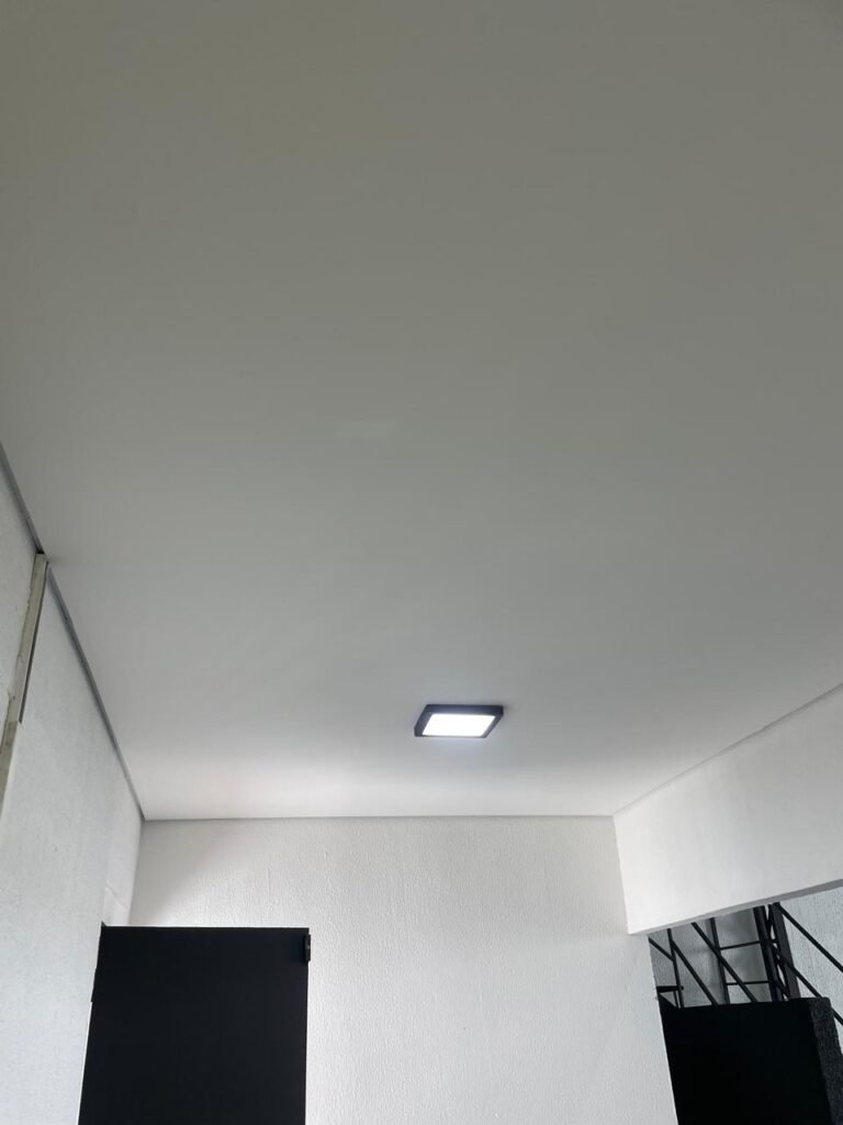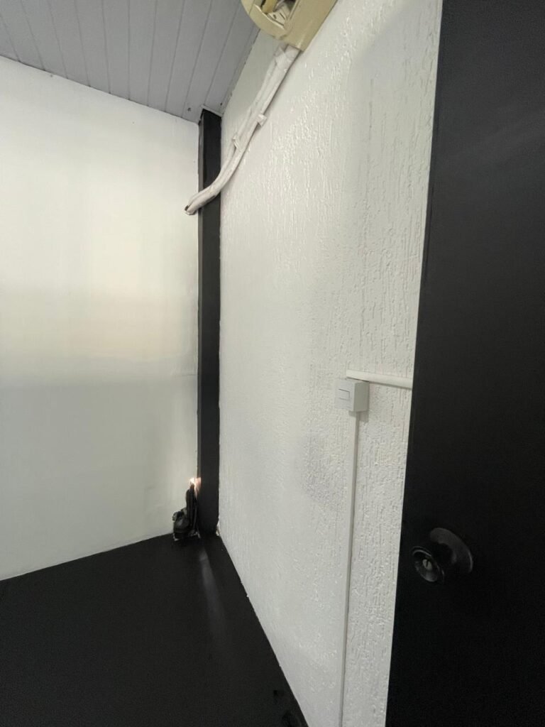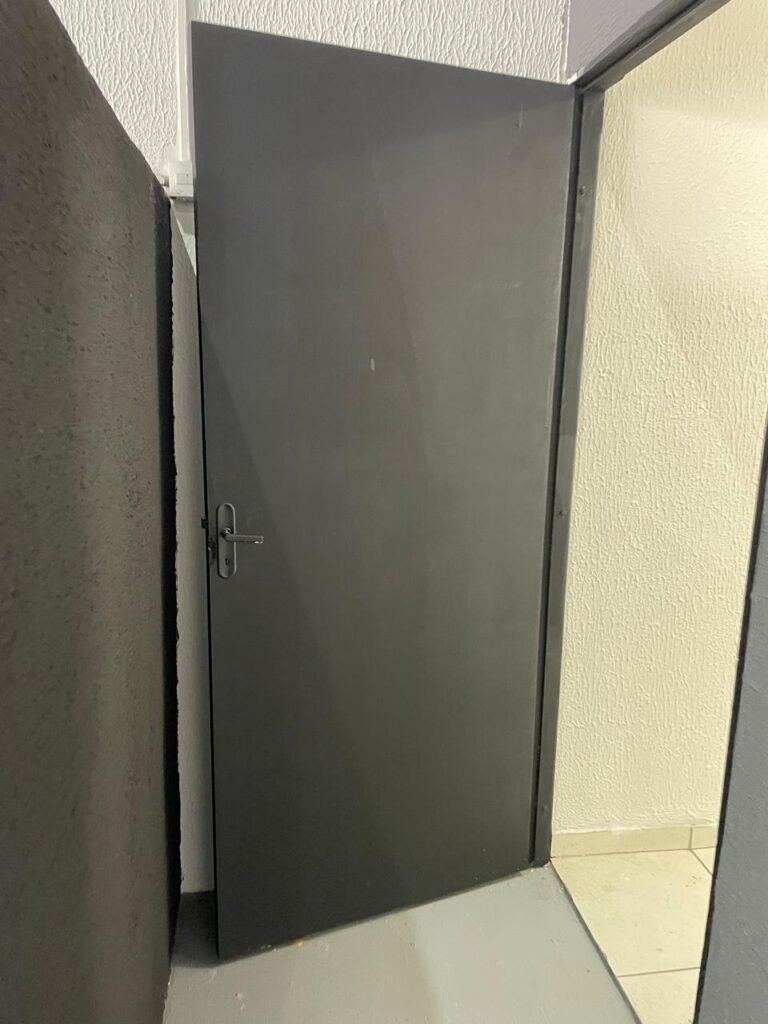 SALA 01-: Porta da divisória naval com pintura na cor preto nova e em ordem, com maçaneta com tranca embutida em ordem, piso de madeira com pintura na cor preta nova e em ordem, paredes com pintura na cor branco neve nova e em ordem, ar condicionado Rheem em ordem, divisória naval com porta cinza, janelas com 04 vidros lisos transparentes em ordem, 01 interruptor de luz, 02 tomadas duplas danificadas, 01 luminária plafon de sobrepor com Led em ordem, teto de PVC na cor branco em ordem.