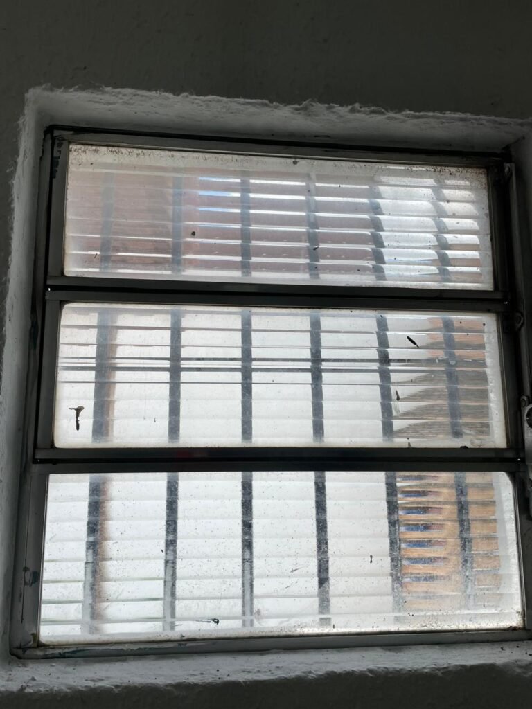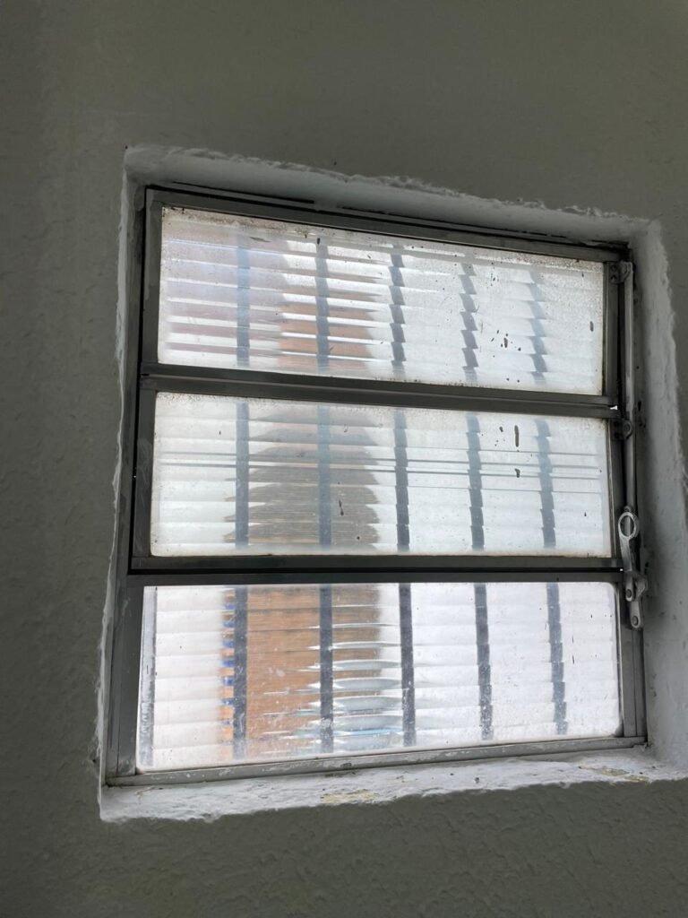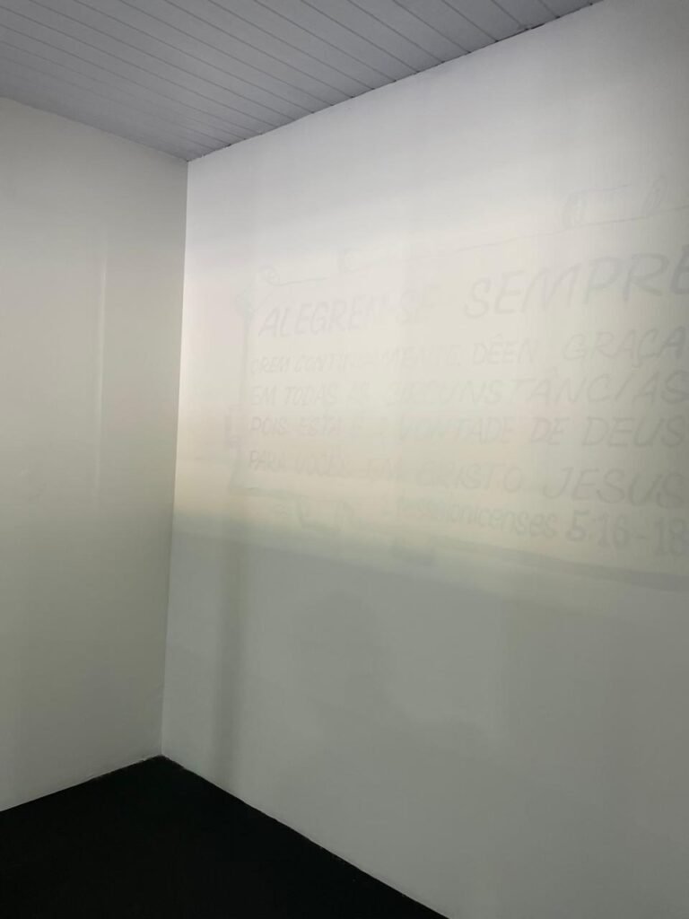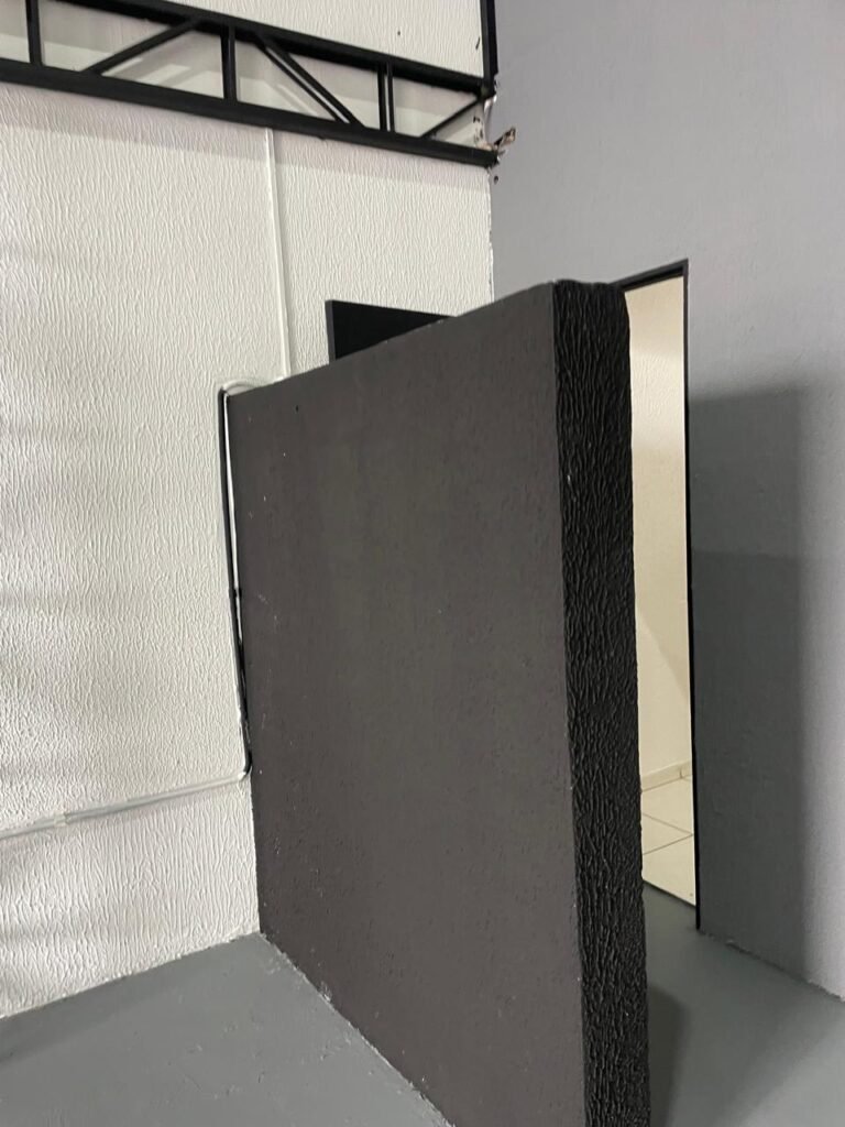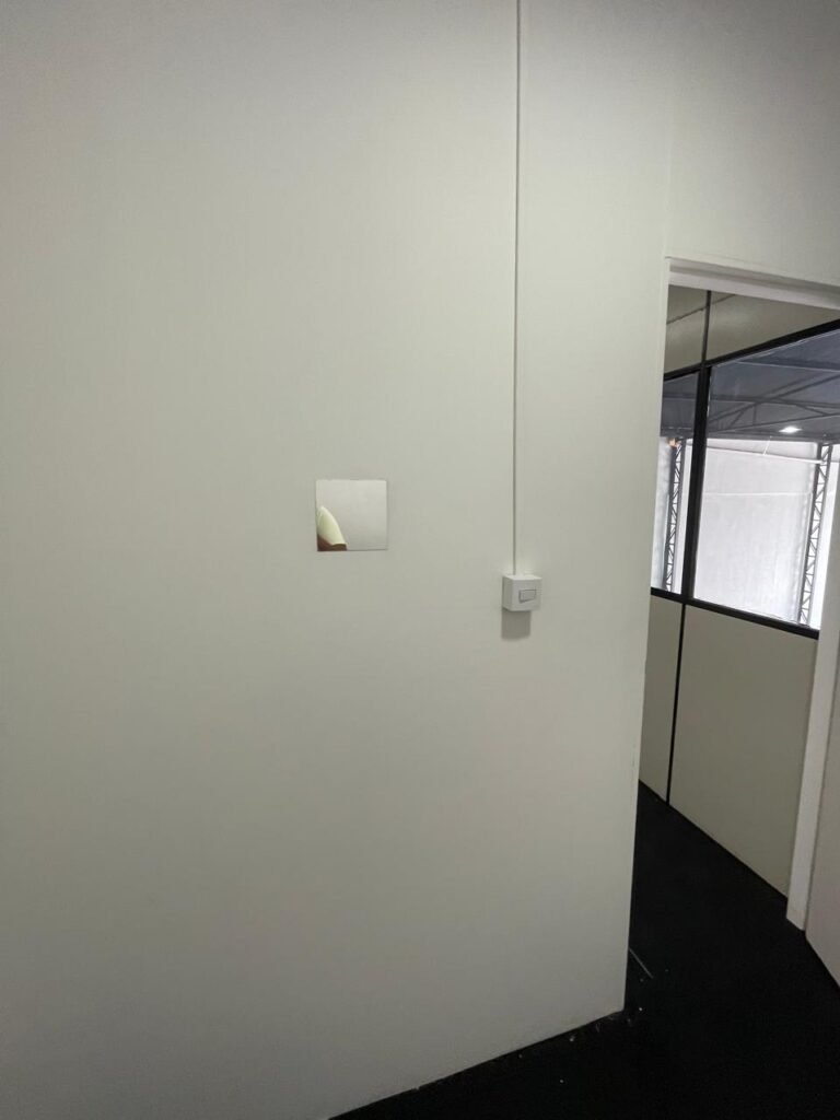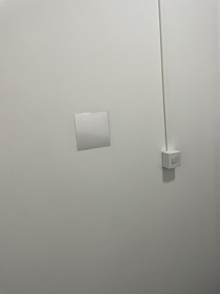 SALA 03-: Porta de madeira com pintura na cor branca com maçaneta solta, piso de madeira na cor preta com saindo lascas, paredes com reboco e pintura na cor branco neve com manchas, divisória naval, janelas com 02 vidros lisos transparentes e com pequenas manchas, 01 furo circular na divisória embaixo das janelas, 01 condulete de fios, 01 espelho de reflexo na parede, 01 tomadas, 01 interruptor de luz em ordem, 01 luminária dupla sem lâmpadas, teto de PVC na cor branco em ordem.
