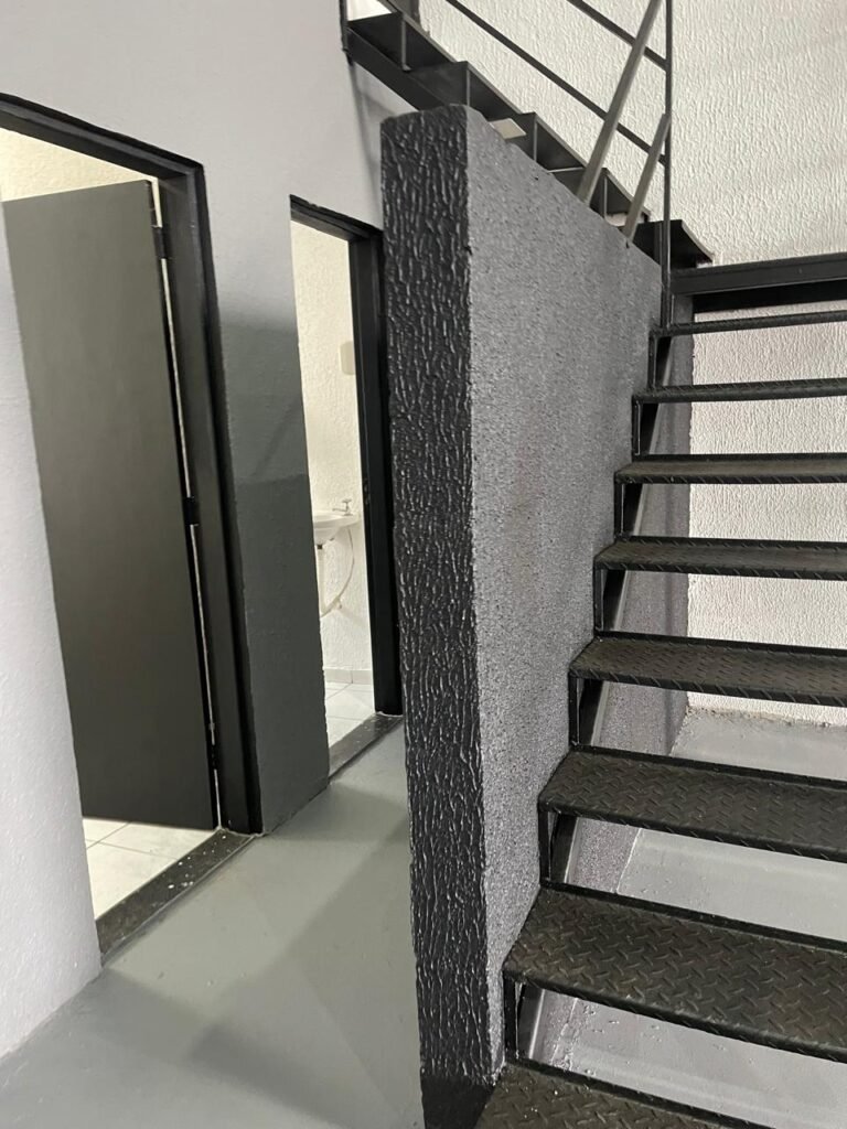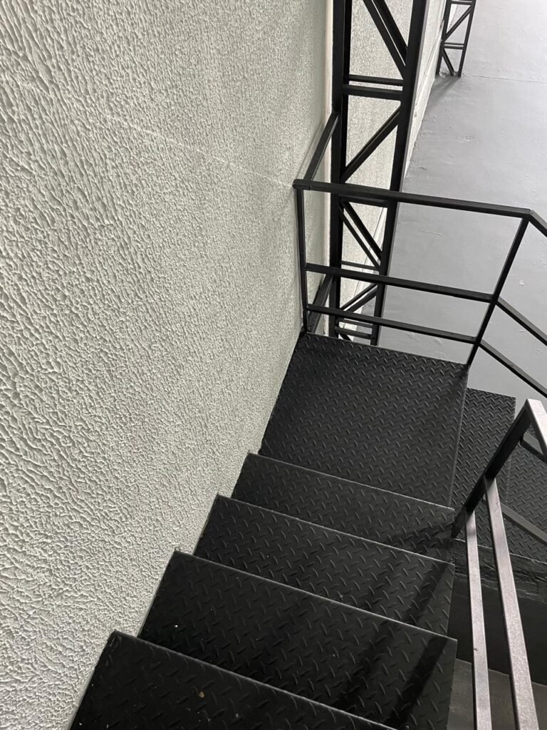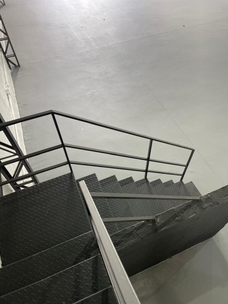 ESCADAS-: Degraus em chapa xadrez com guarda corpo e corrimão de ferro com pintura na cor preto em