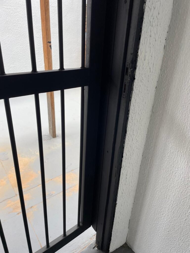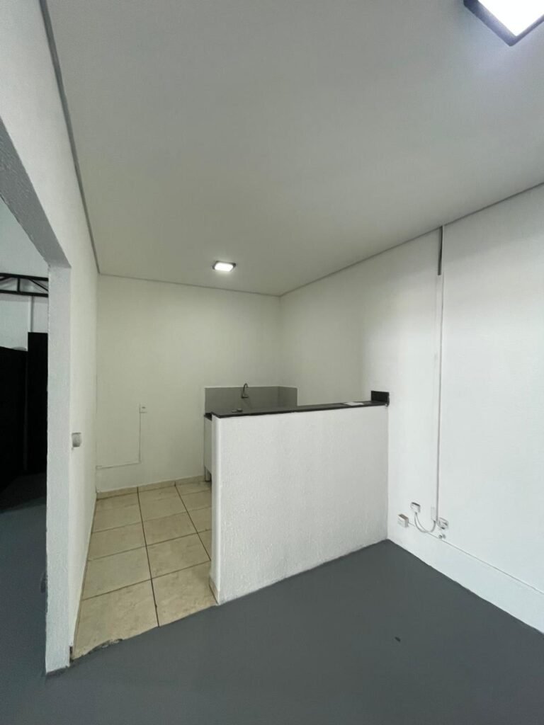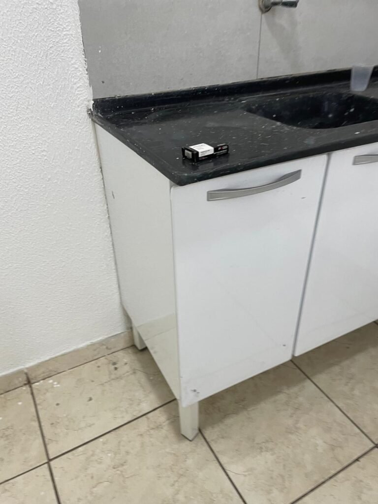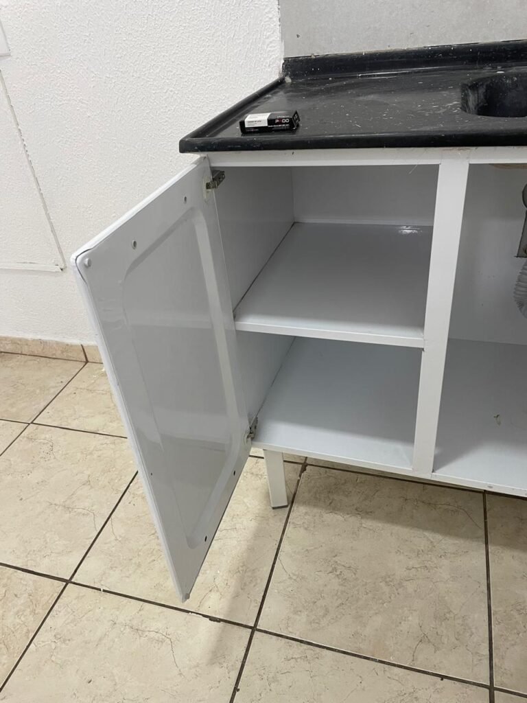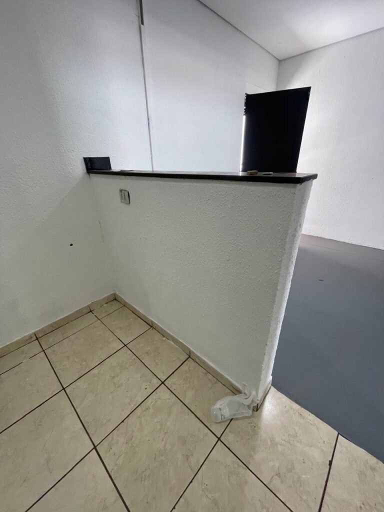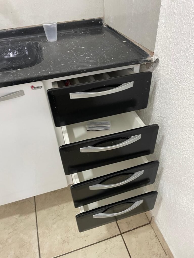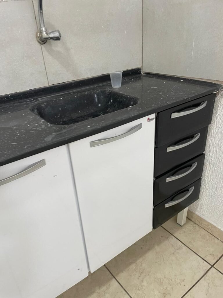 COZINHA-: Piso concreto usinado e polido com pintura acrílica premium na cor cinza nova e em ordem, parte sendo piso cerâmico na cor bege com desgaste natural e restante em ordem, paredes com pintura na cor branco neve nova e em ordem, pia na cor preto em ordem, 01 gabinete marca Romero gabinetes novo e em ordem, 02 portas e 04 gavetas, 06 puxadores em ordem, com 01 torneira em inox com desgaste natural e 01 sifão sanfonado em ordem, 01 porta de madeira com pintura na cor preto nova e em ordem, com maçanetas em ordem e fechadura em ordem, 01 grade de proteção de ferro com 02 fechaduras tetras, com chaves em ordem, 01 interruptor, 02 luminárias plafon de sobrepor com Led em ordem, 04 tomadas em ordem, 02 espelhos de telefone danificados, 01 balcão de alvenaria com pedra na cor preto em ordem.