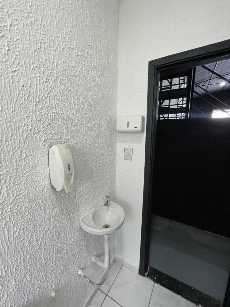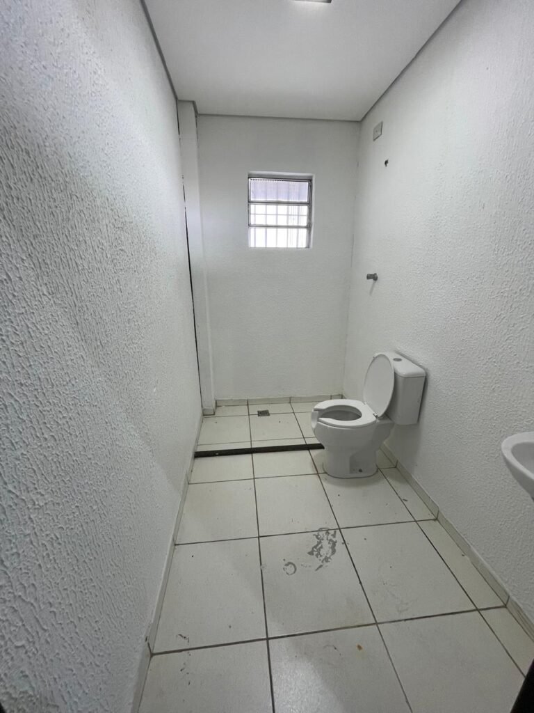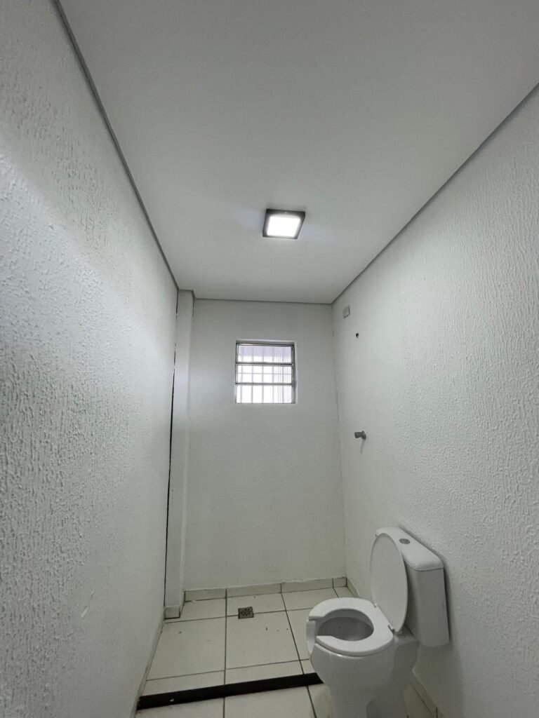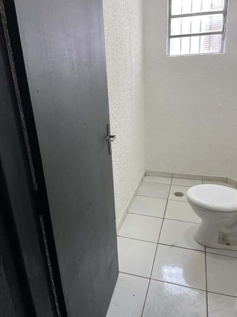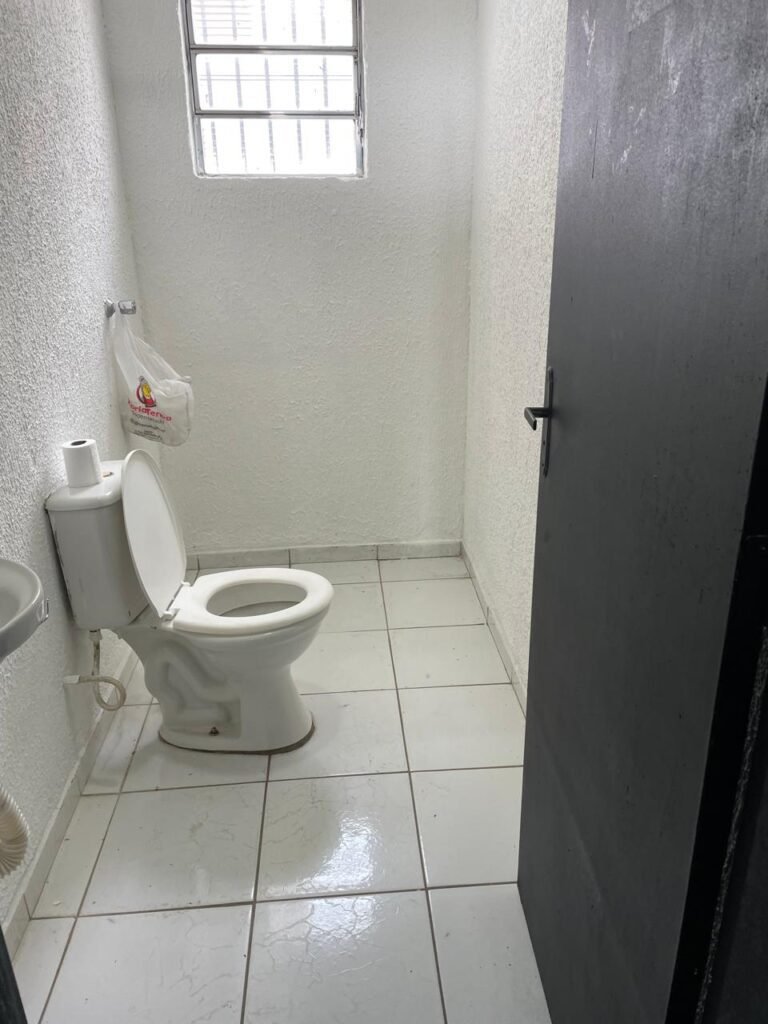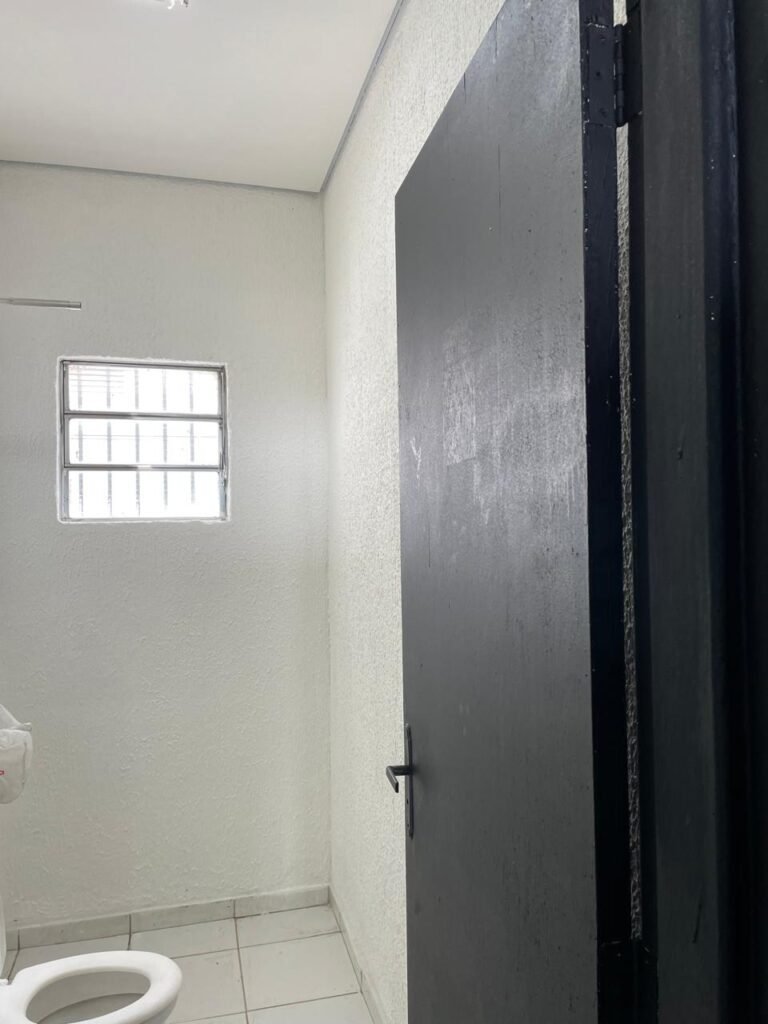 WC/3 FEMININO-: Piso frio cerâmica cor branco sendo 02 deles com trincos, ralo em ordem, parede com pintura na cor branca em ordem, 03 parafusos na parede, teto de gesso com pintura na cor branco neve nova e em ordem, conjunto vaso sanitário e caixa acoplada de descarga e tampa de plástico na cor branca em ordem, 01 pia cerâmica branca sifão sanfonado em ordem, 01 vitrô em ordem, porta de madeira com pintura na cor preto nova e em ordem, maçanetas em ordem com acabamento solto, fechaduras em ordem, 01 interruptor em ordem, 01 luminária plafon de sobrepor com Led em ordem, 01 suporte de papel higiênico em ordem, 01 suporte para sabonete liquido, 01 suporte de papel de mão, 01 canopla em inox, 01 chuveiro Lorenzetti.