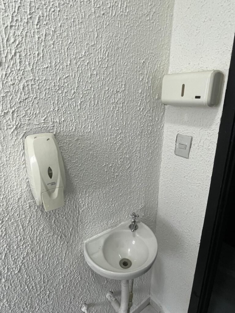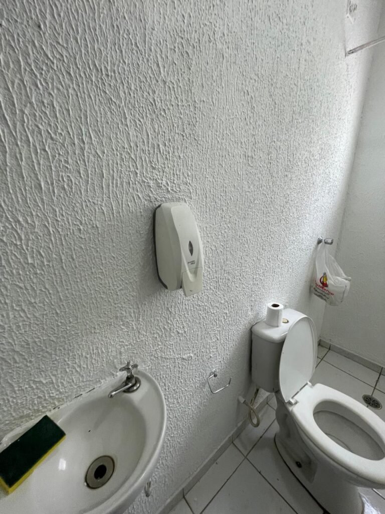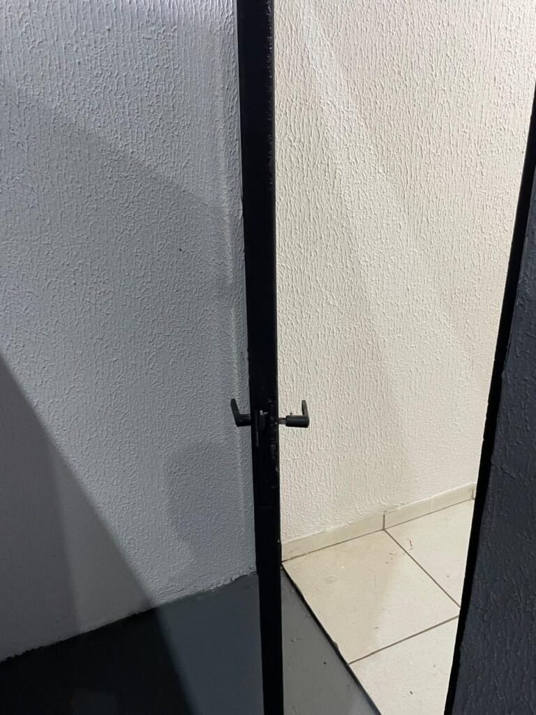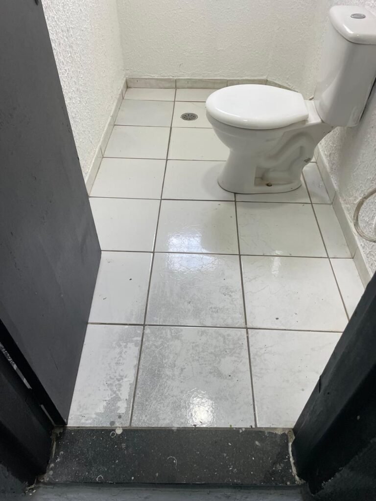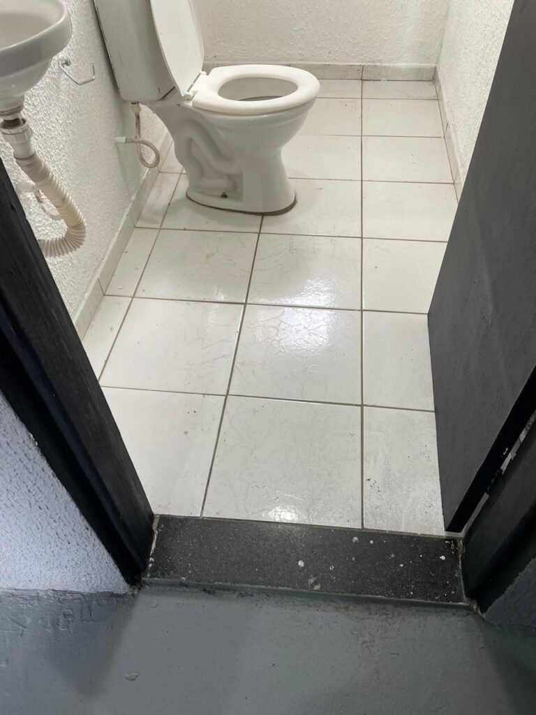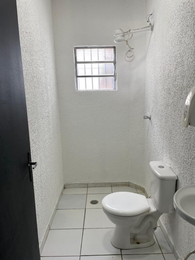 WC/3 FEMININO-: Piso frio cerâmica cor branco sendo 02 deles com trincos, ralo em ordem, parede com pintura na cor branca em ordem, 03 parafusos na parede, teto de gesso com pintura na cor branco neve nova e em ordem, conjunto vaso sanitário e caixa acoplada de descarga e tampa de plástico na cor branca em ordem, 01 pia cerâmica branca sifão sanfonado em ordem, 01 vitrô em ordem, porta de madeira com pintura na cor preto nova e em ordem, maçanetas em ordem com acabamento solto, fechaduras em ordem, 01 interruptor em ordem, 01 luminária plafon de sobrepor com Led em ordem, 01 suporte de papel higiênico em ordem, 01 suporte para sabonete liquido, 01 suporte de papel de mão, 01 canopla em inox, 01 chuveiro Lorenzetti.