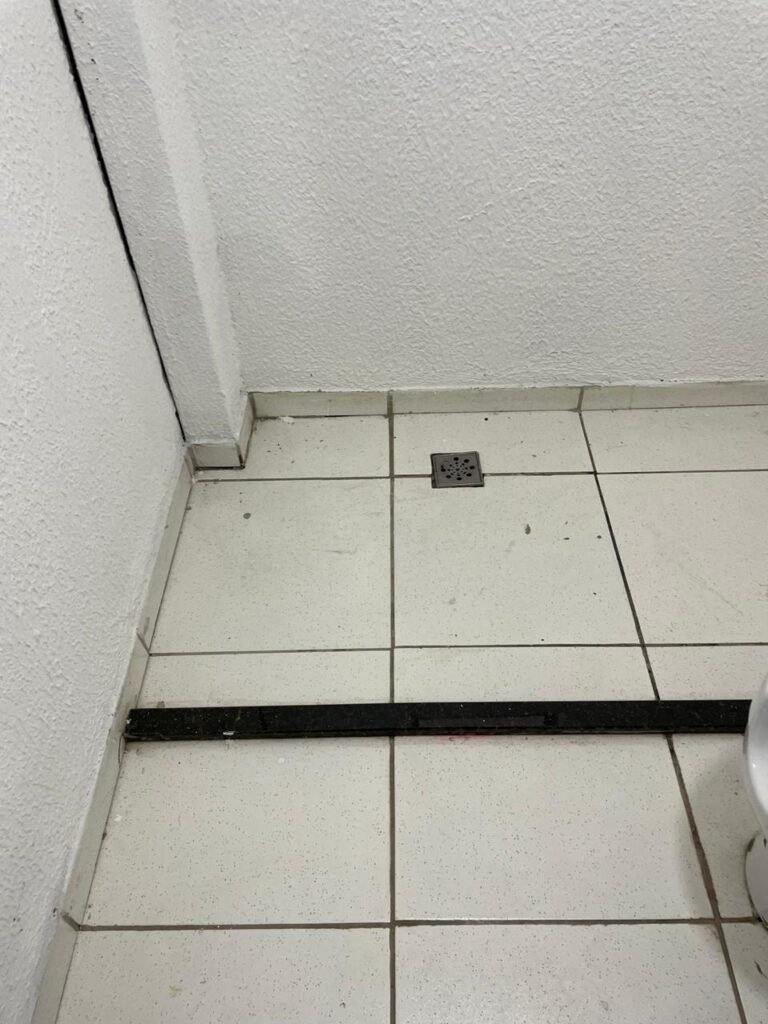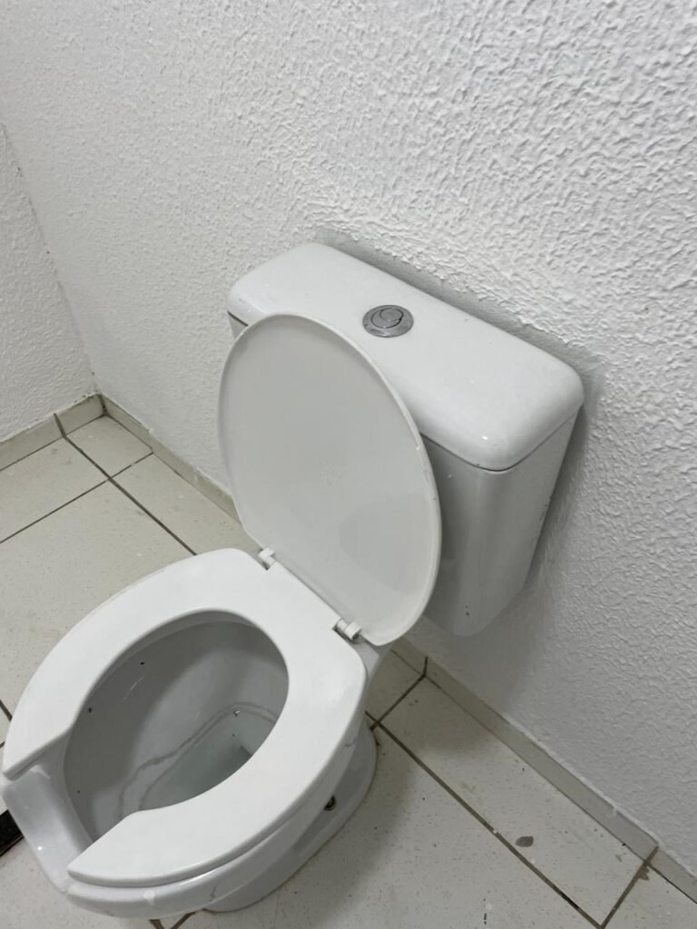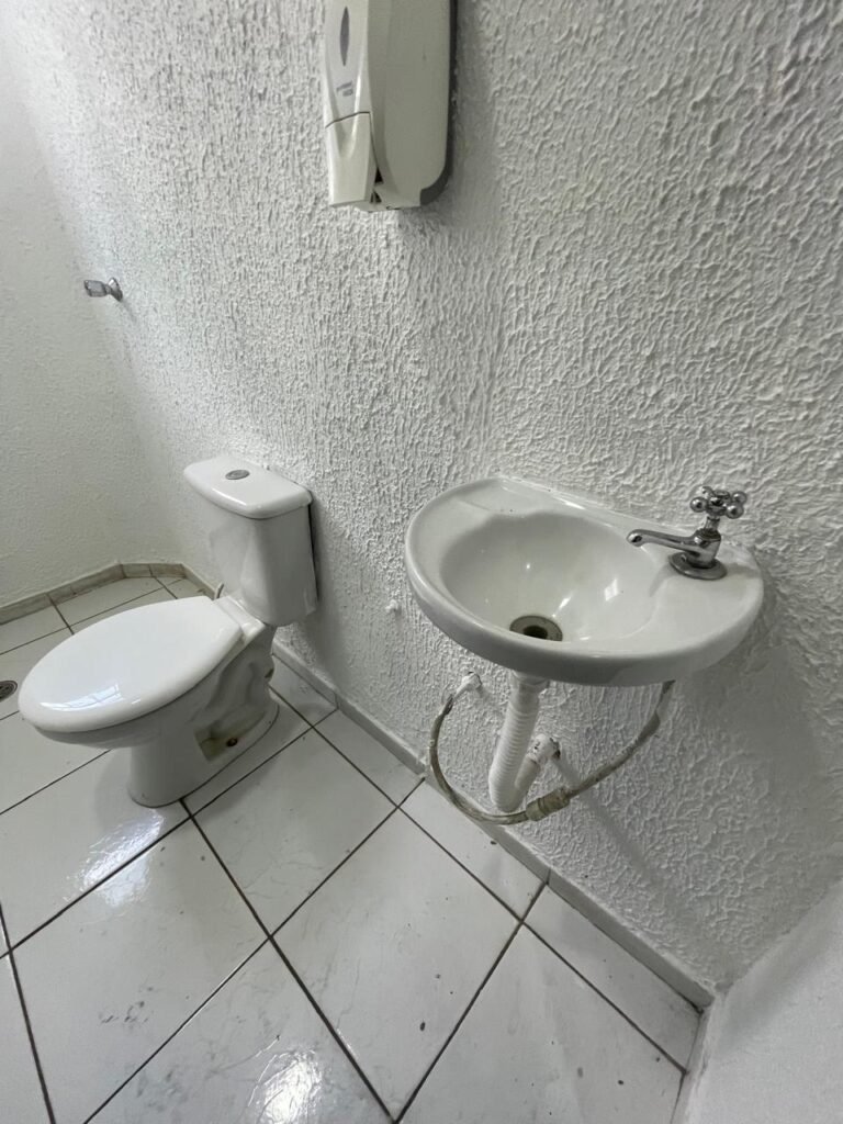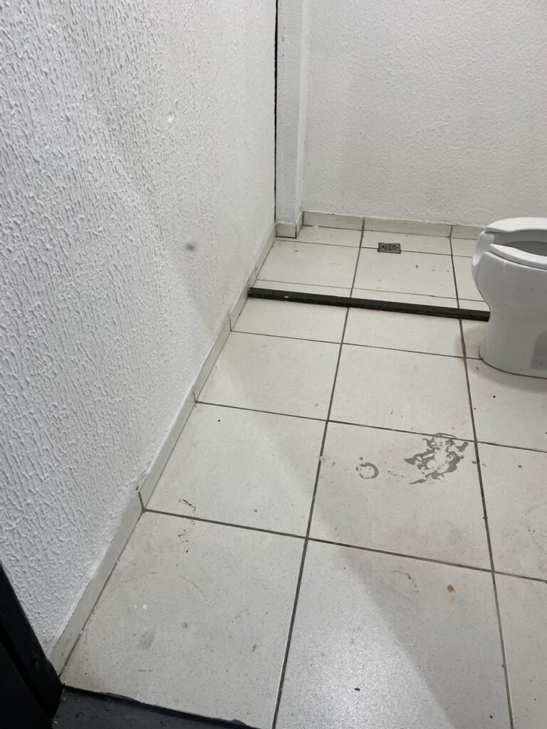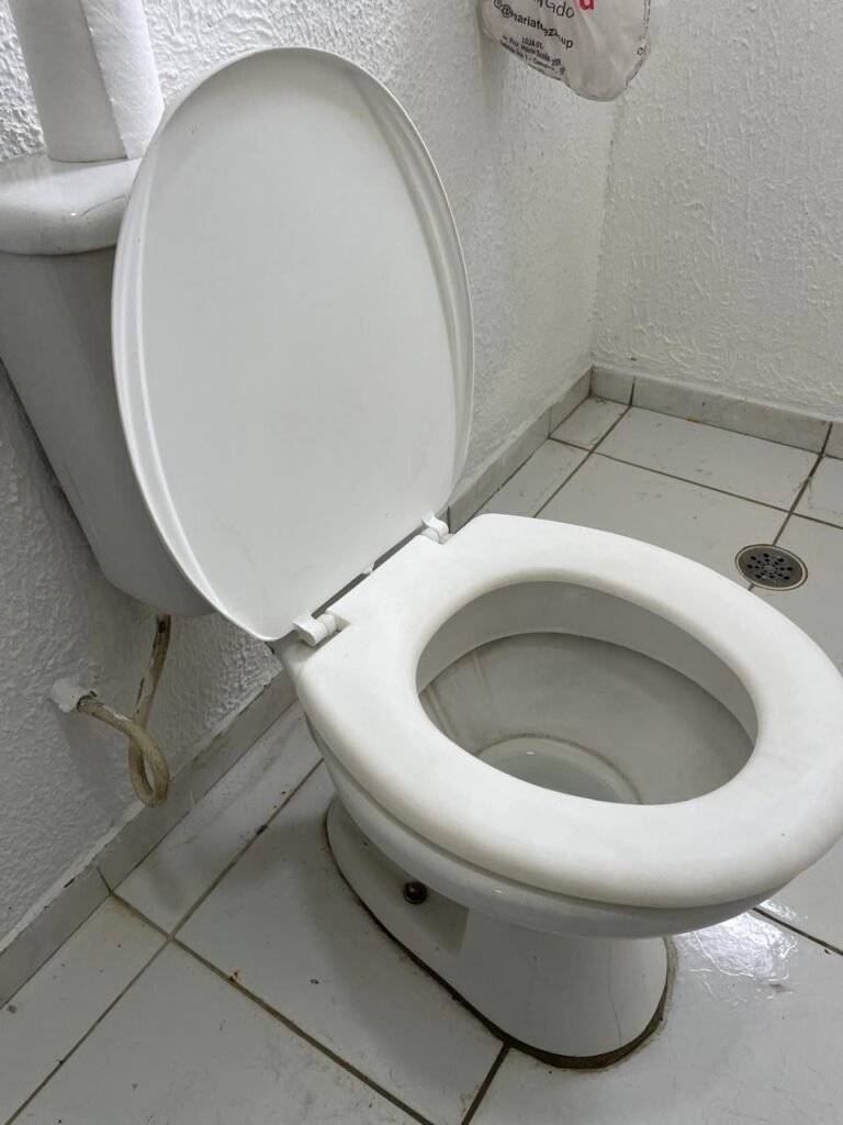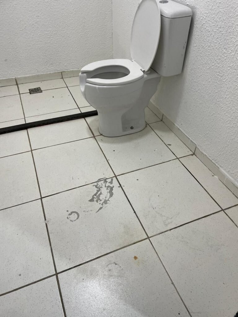 WC/3 FEMININO-: Piso frio cerâmica cor branco sendo 02 deles com trincos, ralo em ordem, parede com pintura na cor branca em ordem, 03 parafusos na parede, teto de gesso com pintura na cor branco neve nova e em ordem, conjunto vaso sanitário e caixa acoplada de descarga e tampa de plástico na cor branca em ordem, 01 pia cerâmica branca sifão sanfonado em ordem, 01 vitrô em ordem, porta de madeira com pintura na cor preto nova e em ordem, maçanetas em ordem com acabamento solto, fechaduras em ordem, 01 interruptor em ordem, 01 luminária plafon de sobrepor com Led em ordem, 01 suporte de papel higiênico em ordem, 01 suporte para sabonete liquido, 01 suporte de papel de mão, 01 canopla em inox, 01 chuveiro Lorenzetti.
