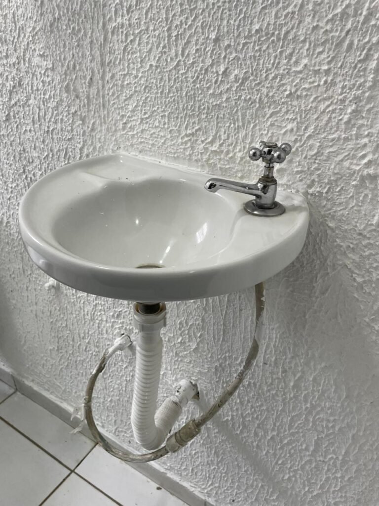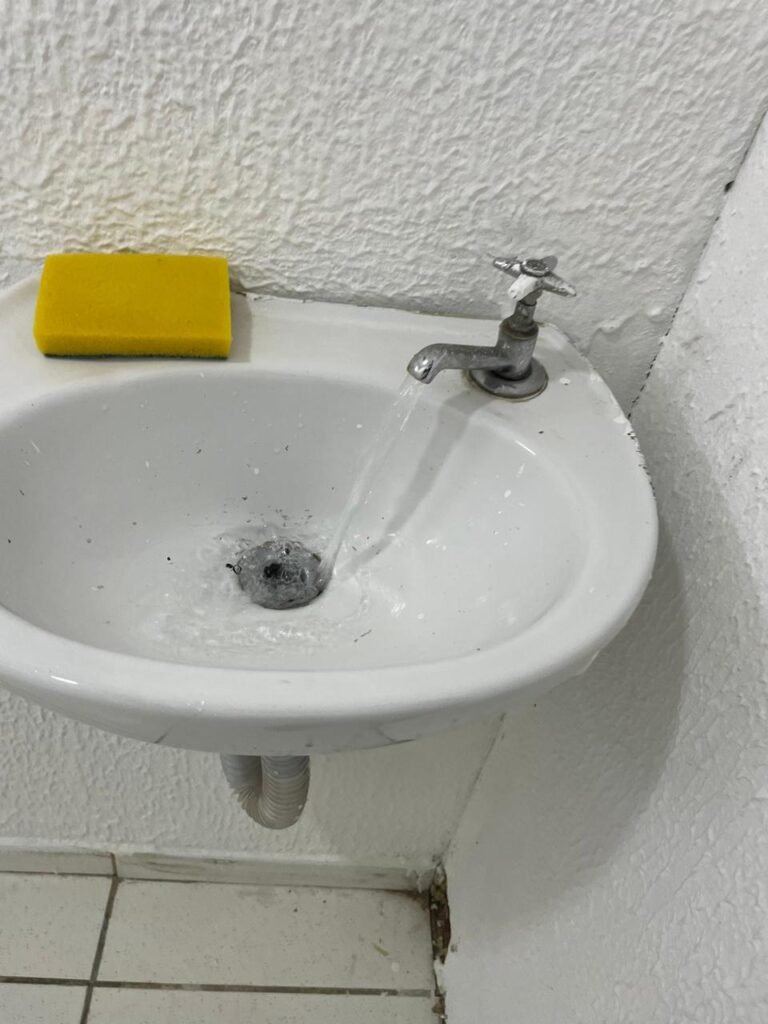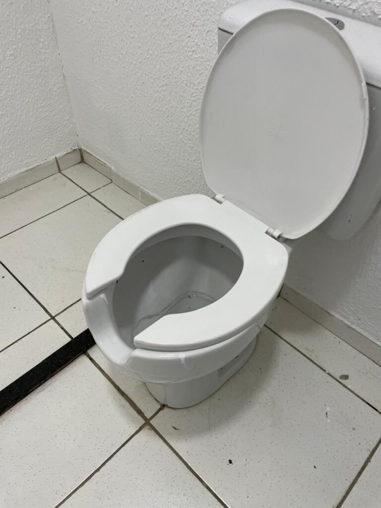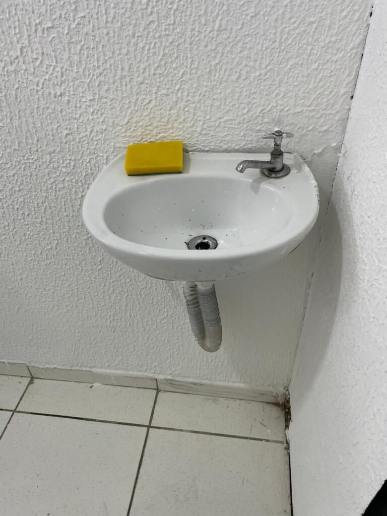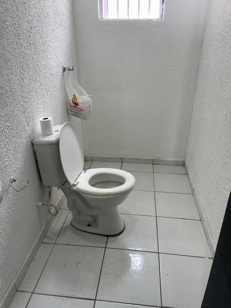 WC/1 ACESSIBILIDADE-: Piso frio cerâmica cor branco, ralo em ordem, parede com pintura na cor verde com desgaste e manchas, rodapé com piso frio cerâmico branco sendo 02 deles com trincos, conjunto vaso sanitário e caixa acoplada de descarga e tampa de plástico na cor branca em ordem, 01 pedra de mármore retangular preta na divisão do piso do banheiro, 01 pia cerâmica branca sifão sanfonado em ordem, 01 vitrô em ordem, porta de madeira branca em ordem, maçanetas em ordem, fechaduras em ordem, teto branco em ordem, 01 interruptor em ordem, 01 prego na parede, 01 suporte de papel higiênico danificado, 01 registro para chuveiro, 01 lâmpada bulbo danificada.