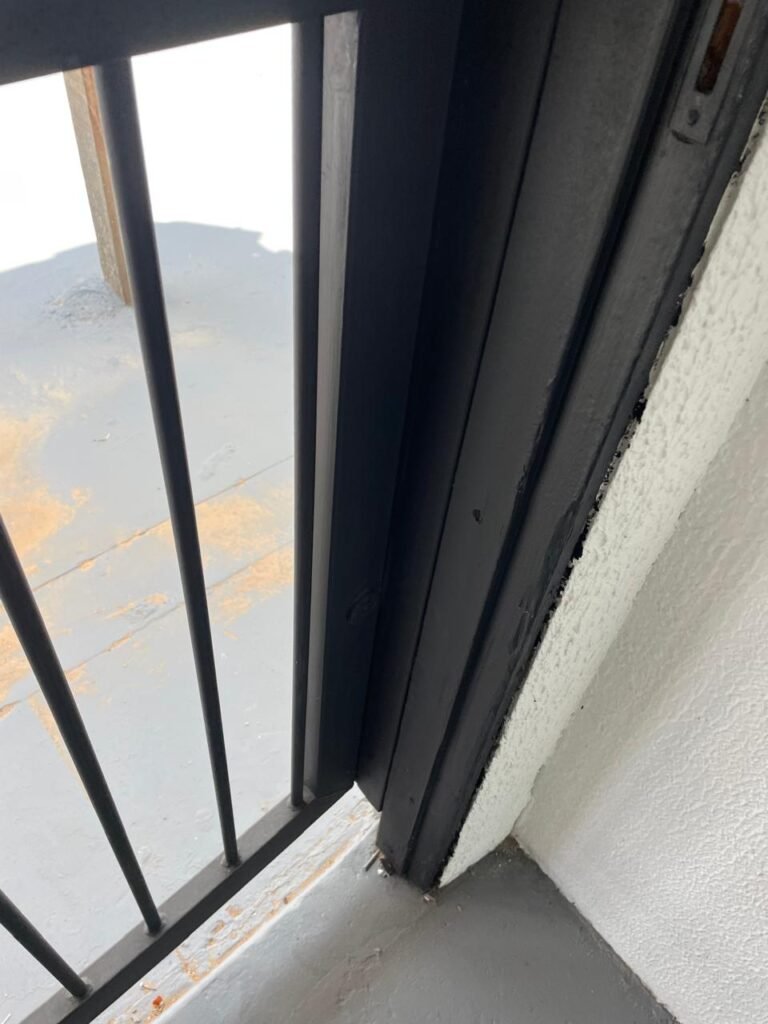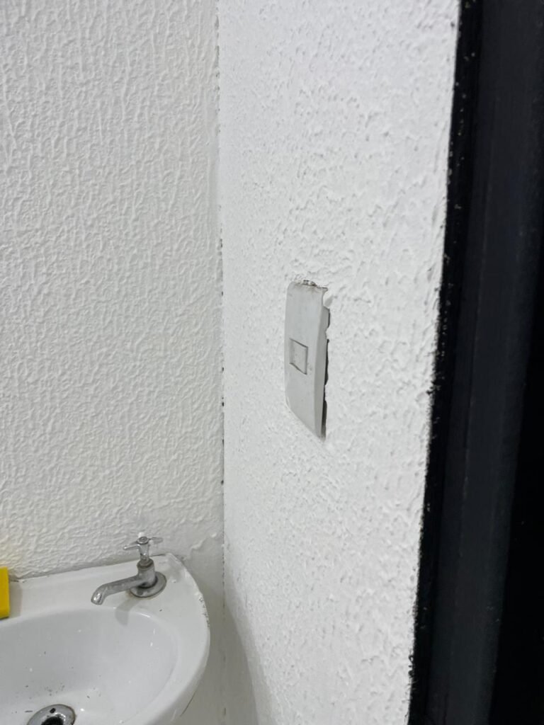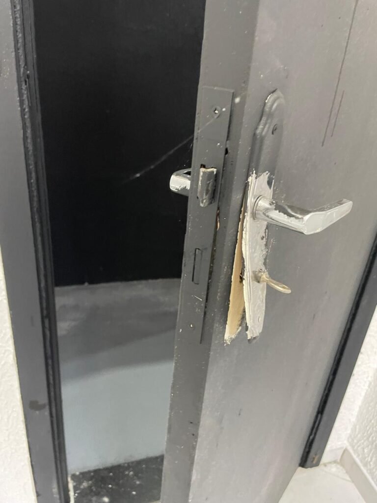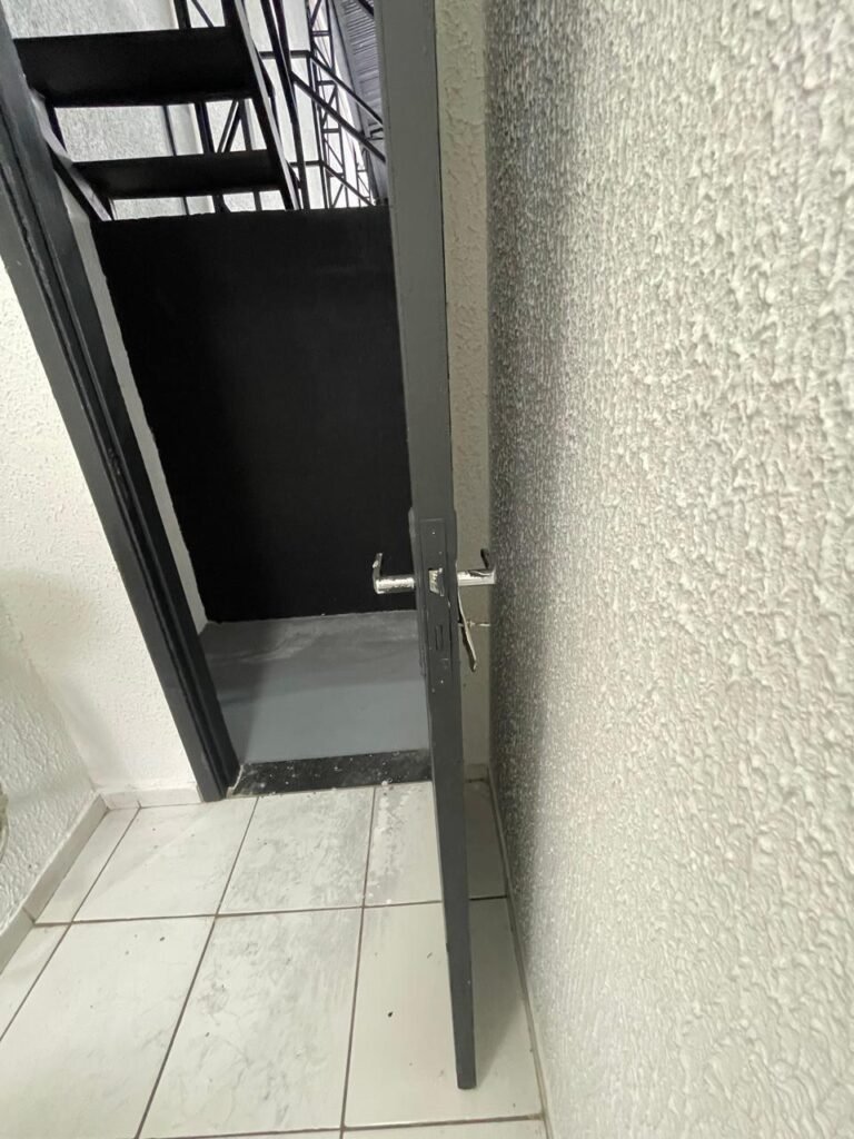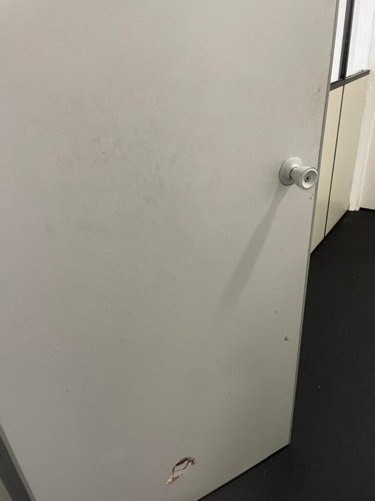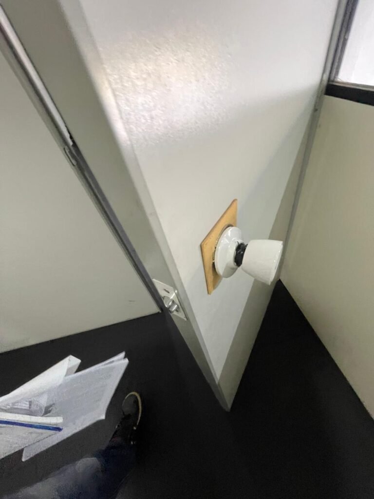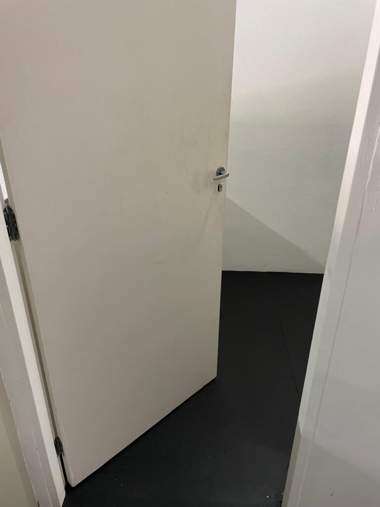 SALA 02-: Porta da divisória naval com maçaneta com tranca embutida e danificada, piso de madeira na cor preta com saindo lascas, paredes com reboco e pintura na cor branco neve com manchas e com grafite, divisória naval com porta cinza, janelas com 03 vidros lisos transparentes em ordem, 01 interruptor de luz com fio exposto, 01 tomadas, 01 luminária plafon de sobrepor com Led em ordem, teto de PVC na cor branco em ordem.