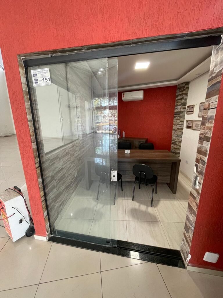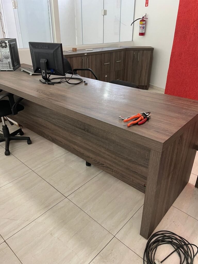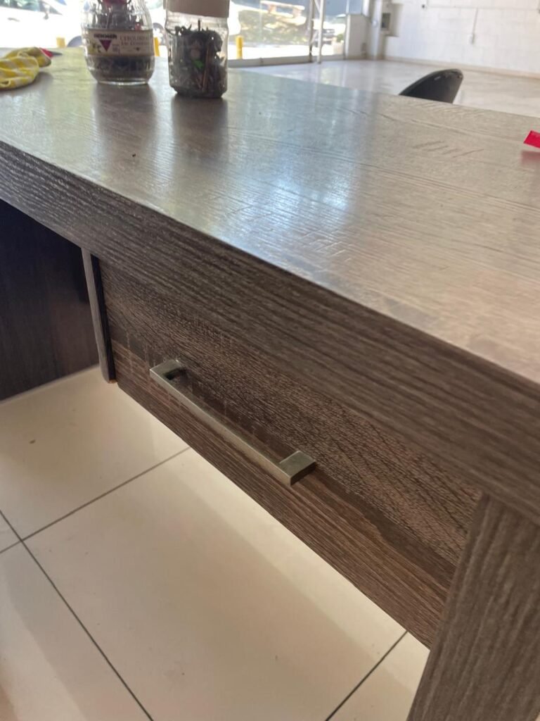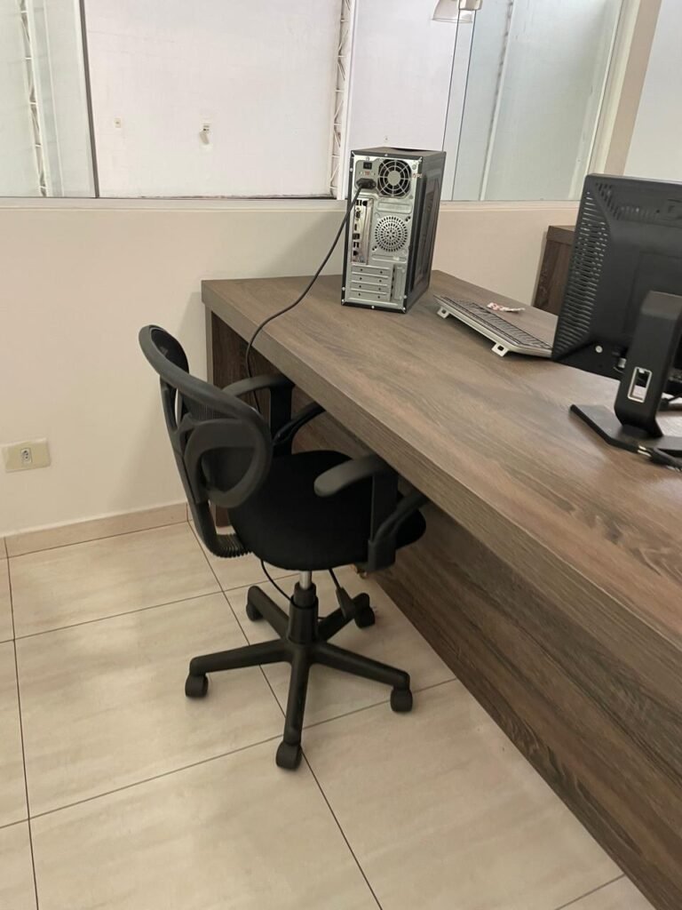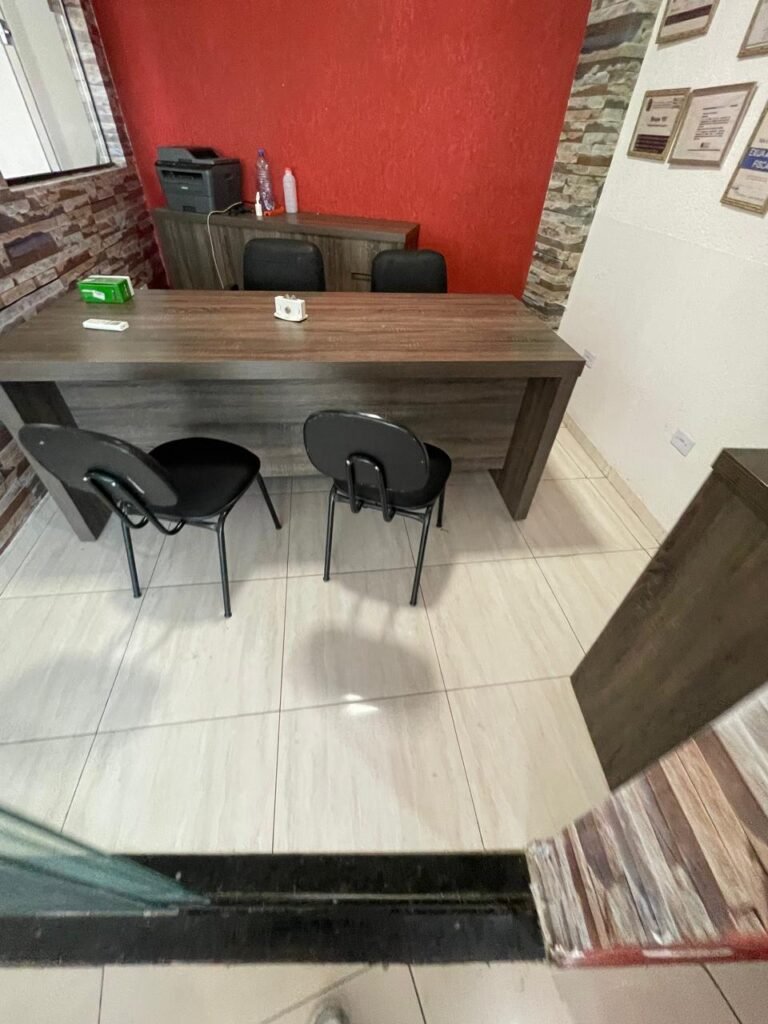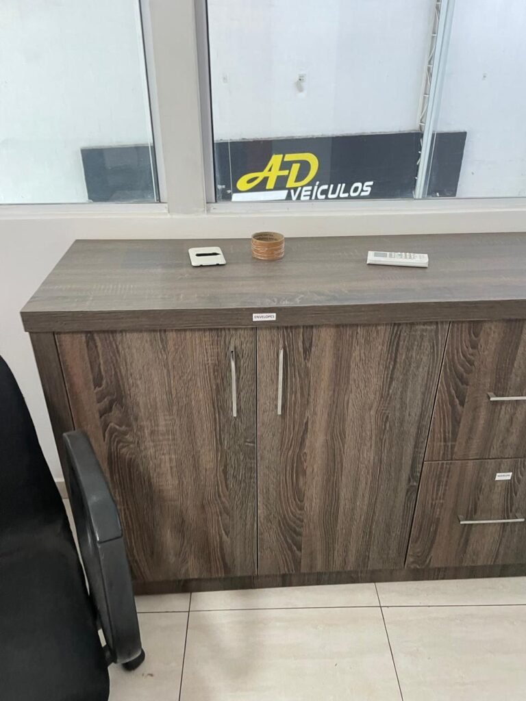 ESCRITÓRIO-: 01 Porta deslizante com vidro temperado em ordem, fechadura marca 3F com desgastes naturais e restante em ordem, 01 vidro temperado fixo em ordem, 02 soleiras de granito cor preto em ordem, pisos e rodapés revestido de pisos frio cerâmicos com desgastes naturais restante em ordem, 02 paredes revestidas de papéis de parede com desgastes naturais, 02 paredes com grafiato, 01 com pintura na cor branco neve e o outro na cor vermelho com desgastes naturais manchas pela extensão e restante em ordem, 07 espelhos de luz sendo eles: 01 com 03 interruptores, 06 com 01 tomada, 02 janelas deslizantes com esquadrias de alumínio em ordem, com 02 vidros temperados em ordem em cada, com 01 fechadura marca Franzmar em ordem em cada, 01 armário de MDF com 02 portas, com 02 puxadores em inox em ordem e com dobradiças em ordem, 01 mesa de MDF com gabinete com acabamento saindo lascas e restante em ordem, contendo 04 gavetas, sendo que 01 delas possui 01 fechadura em ordem e com 02 Chaves, 04 puxadores em inox e corrediças em ordem, 01 gabinete com 04 gaveteiros e 02 portas em ordem, 06 puxadores em inox, corrediças e dobradiças em ordem, 01 ar condicionado marca Springer em ordem, 01 controle remoto marca Springer em ordem, 01 luminária de emergência em ordem, teto com rebaixamento de gesso e pintura na cor branco neve em ordem, 09 esportes de luz não testados, 01 luminária plafon embutida com LED em ordem.