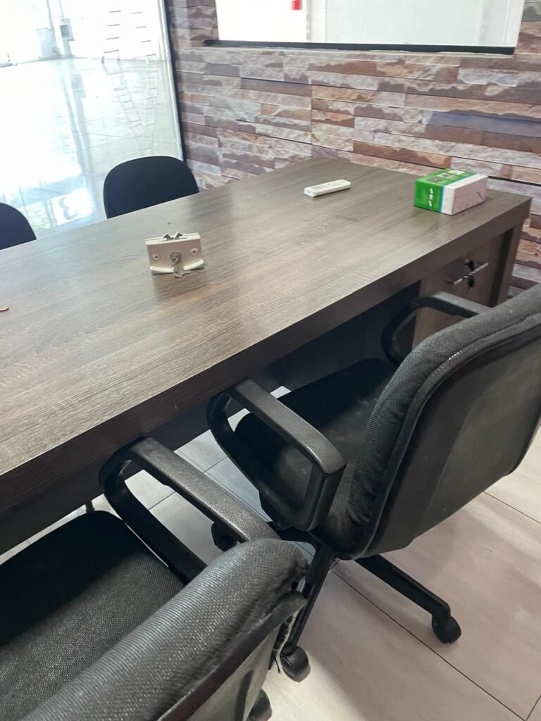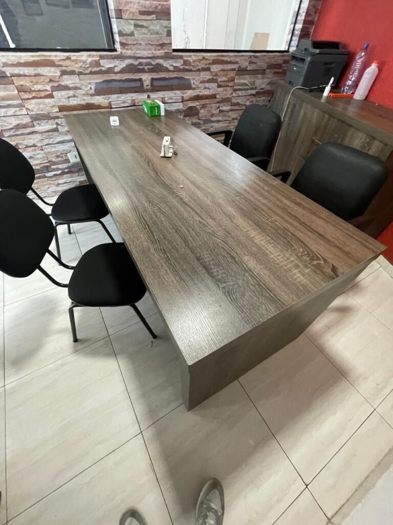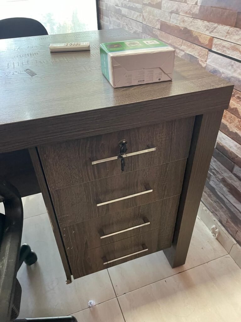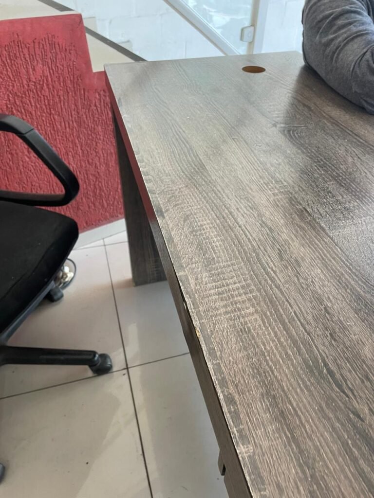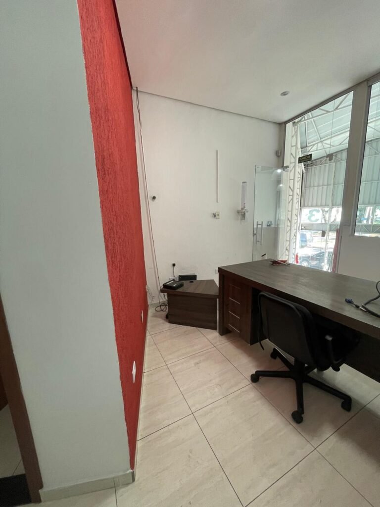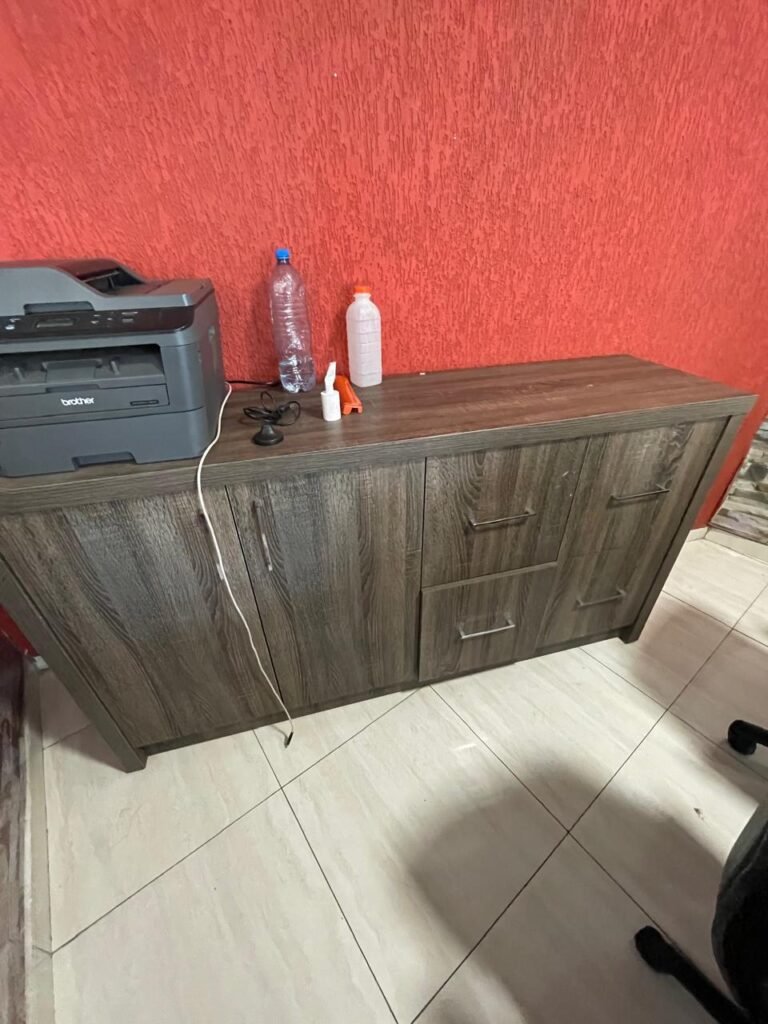 ESCRITÓRIO-: 01 Porta deslizante com vidro temperado em ordem, fechadura marca 3F com desgastes naturais e restante em ordem, 01 vidro temperado fixo em ordem, 02 soleiras de granito cor preto em ordem, pisos e rodapés revestido de pisos frio cerâmicos com desgastes naturais restante em ordem, 02 paredes revestidas de papéis de parede com desgastes naturais, 02 paredes com grafiato, 01 com pintura na cor branco neve e o outro na cor vermelho com desgastes naturais manchas pela extensão e restante em ordem, 07 espelhos de luz sendo eles: 01 com 03 interruptores, 06 com 01 tomada, 02 janelas deslizantes com esquadrias de alumínio em ordem, com 02 vidros temperados em ordem em cada, com 01 fechadura marca Franzmar em ordem em cada, 01 armário de MDF com 02 portas, com 02 puxadores em inox em ordem e com dobradiças em ordem, 01 mesa de MDF com gabinete com acabamento saindo lascas e restante em ordem, contendo 04 gavetas, sendo que 01 delas possui 01 fechadura em ordem e com 02 Chaves, 04 puxadores em inox e corrediças em ordem, 01 gabinete com 04 gaveteiros e 02 portas em ordem, 06 puxadores em inox, corrediças e dobradiças em ordem, 01 ar condicionado marca Springer em ordem, 01 controle remoto marca Springer em ordem, 01 luminária de emergência em ordem, teto com rebaixamento de gesso e pintura na cor branco neve em ordem, 09 esportes de luz não testados, 01 luminária plafon embutida com LED em ordem.