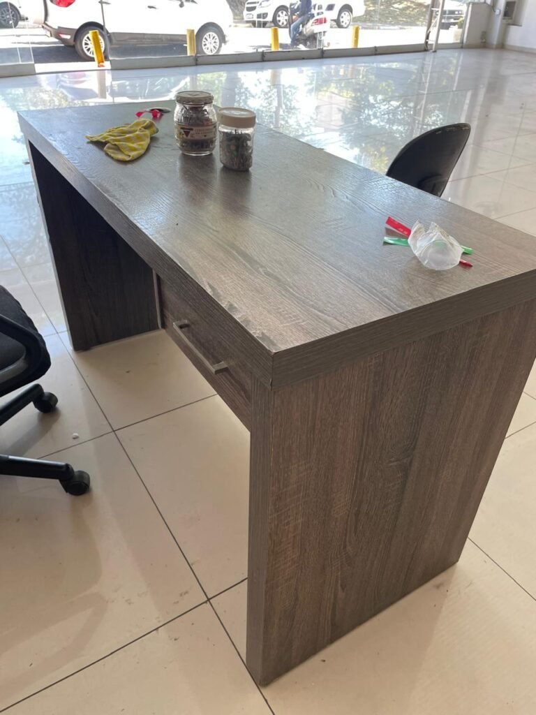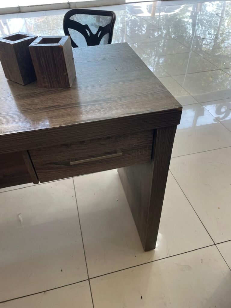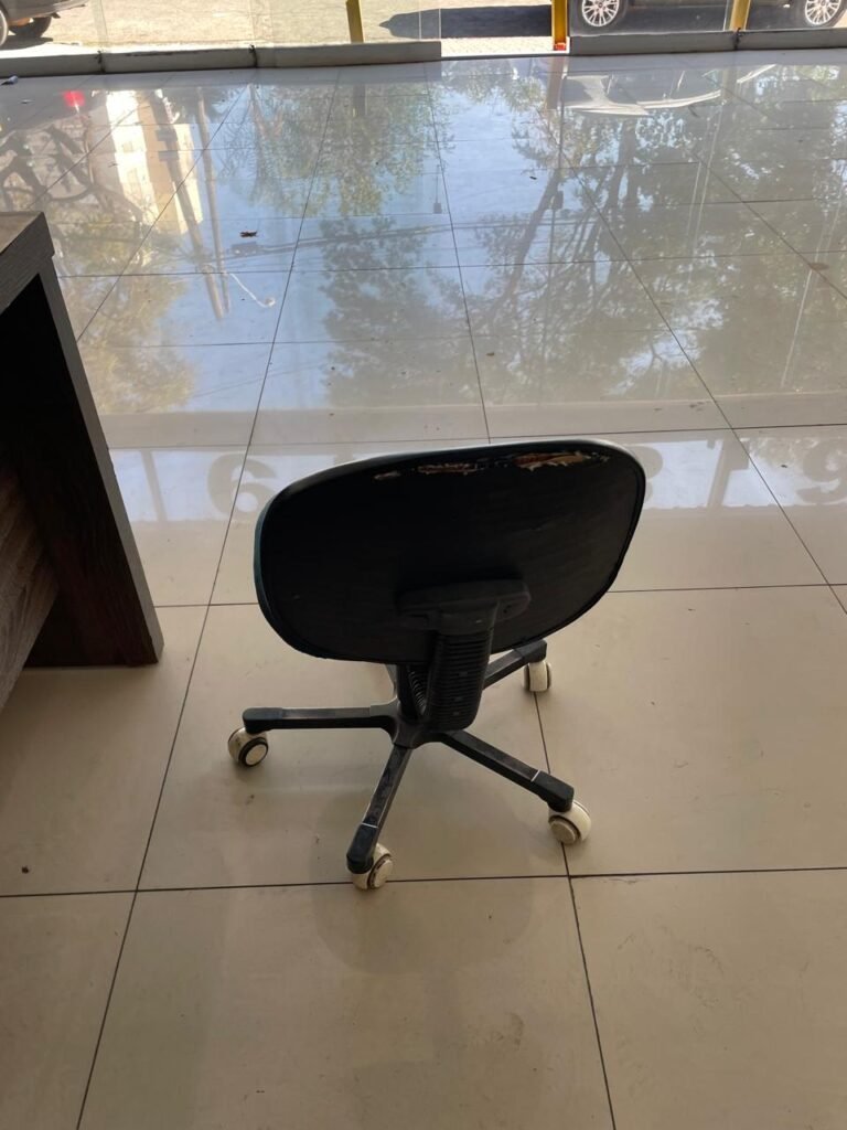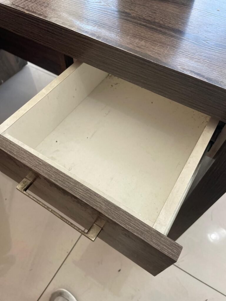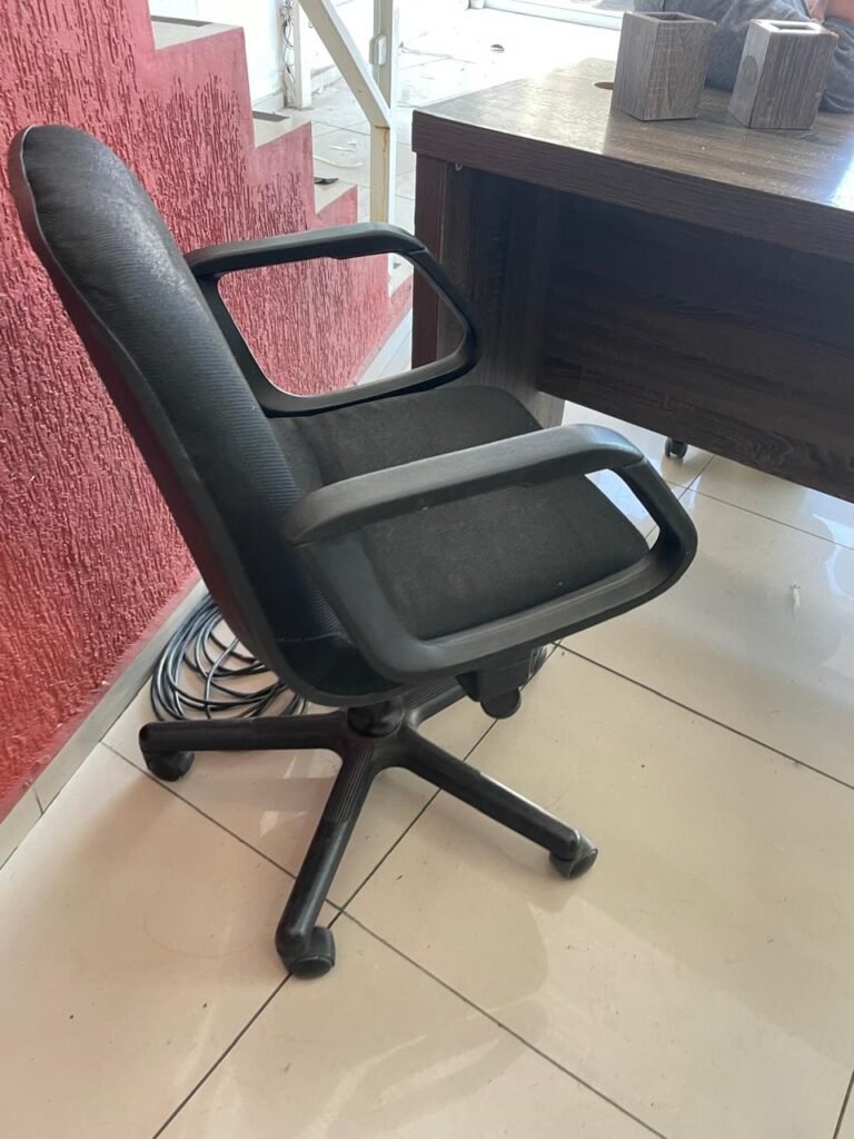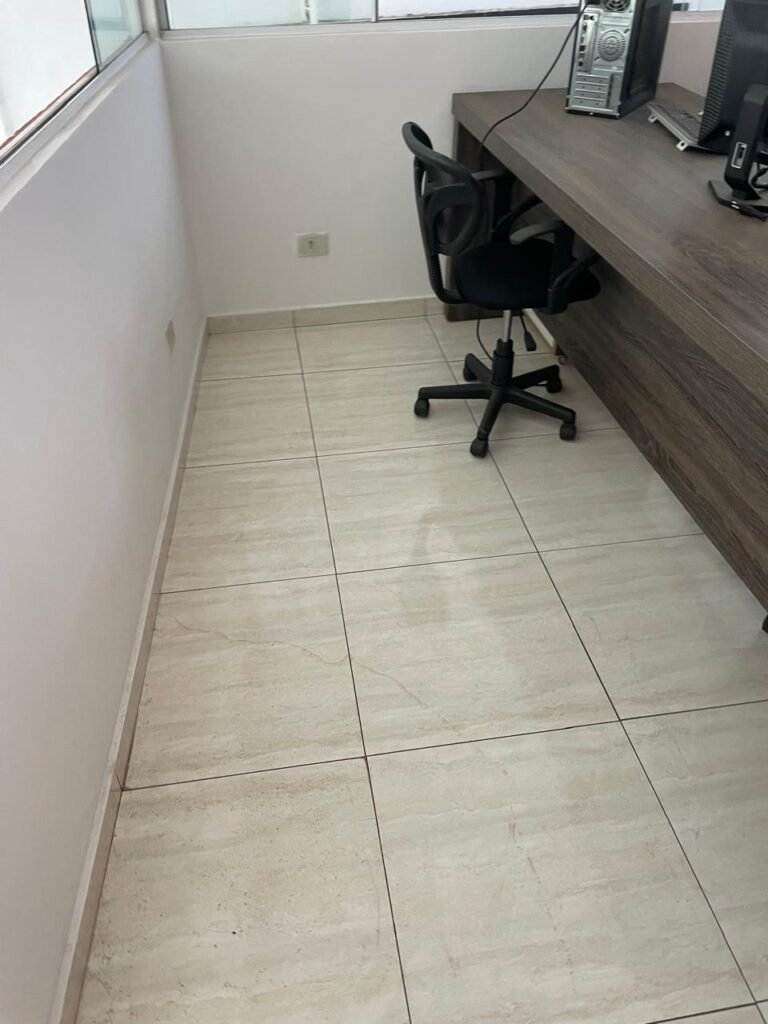 ESCRITÓRIO-: 01 Porta deslizante com vidro temperado em ordem, fechadura marca 3F com desgastes naturais e restante em ordem, 01 vidro temperado fixo em ordem, 02 soleiras de granito cor preto em ordem, pisos e rodapés revestido de pisos frio cerâmicos com desgastes naturais restante em ordem, 02 paredes revestidas de papéis de parede com desgastes naturais, 02 paredes com grafiato, 01 com pintura na cor branco neve e o outro na cor vermelho com desgastes naturais manchas pela extensão e restante em ordem, 07 espelhos de luz sendo eles: 01 com 03 interruptores, 06 com 01 tomada, 02 janelas deslizantes com esquadrias de alumínio em ordem, com 02 vidros temperados em ordem em cada, com 01 fechadura marca Franzmar em ordem em cada, 01 armário de MDF com 02 portas, com 02 puxadores em inox em ordem e com dobradiças em ordem, 01 mesa de MDF com gabinete com acabamento saindo lascas e restante em ordem, contendo 04 gavetas, sendo que 01 delas possui 01 fechadura em ordem e com 02 Chaves, 04 puxadores em inox e corrediças em ordem, 01 gabinete com 04 gaveteiros e 02 portas em ordem, 06 puxadores em inox, corrediças e dobradiças em ordem, 01 ar condicionado marca Springer em ordem, 01 controle remoto marca Springer em ordem, 01 luminária de emergência em ordem, teto com rebaixamento de gesso e pintura na cor branco neve em ordem, 09 esportes de luz não testados, 01 luminária plafon embutida com LED em ordem.