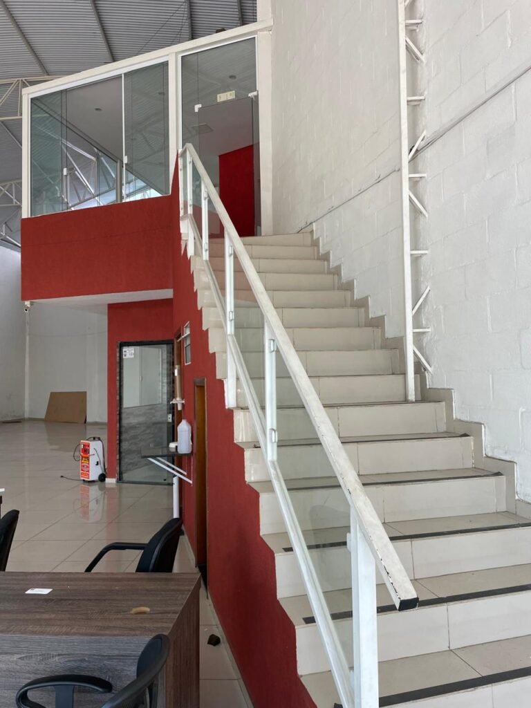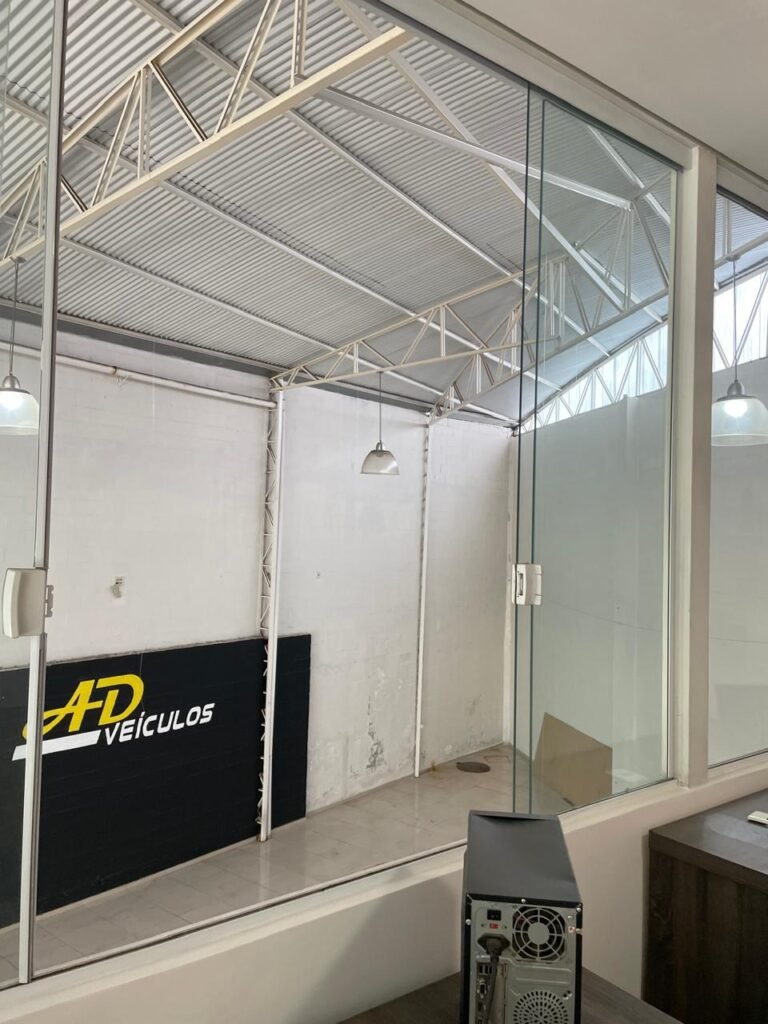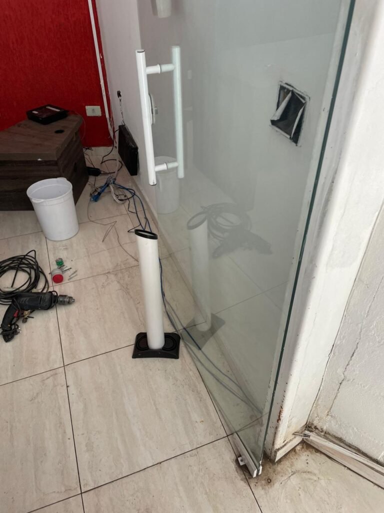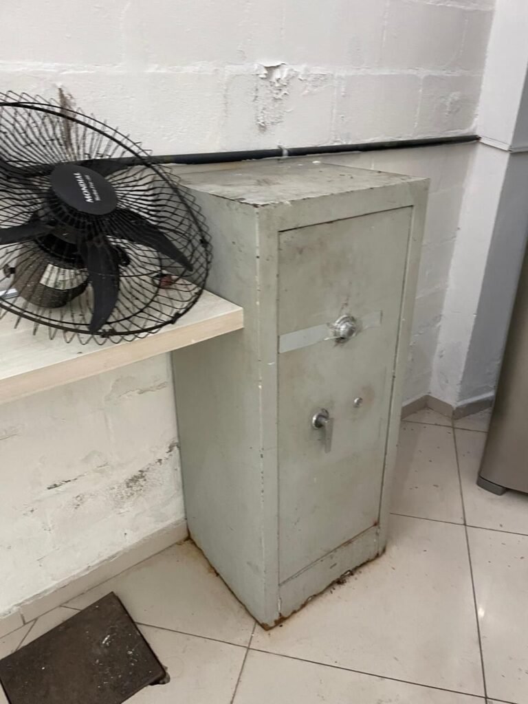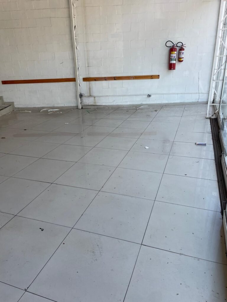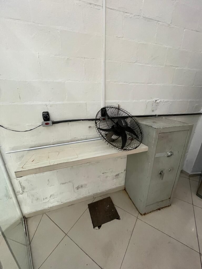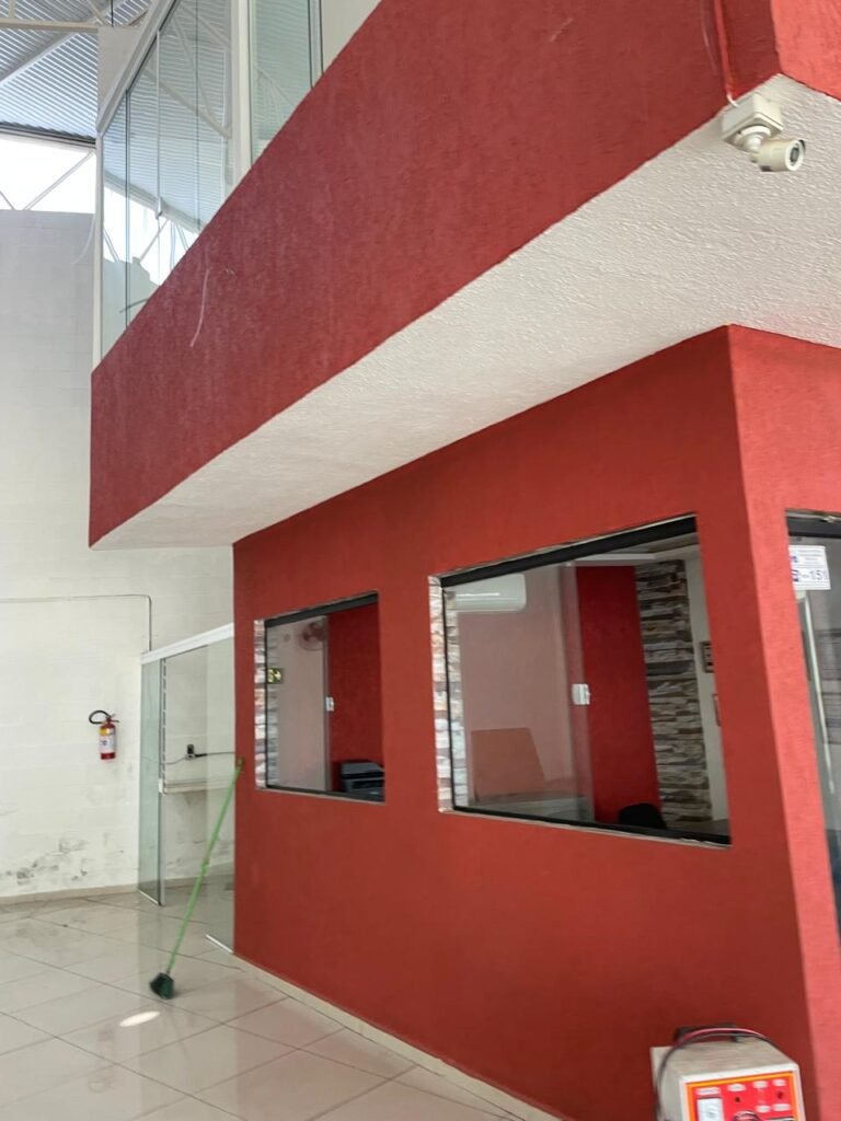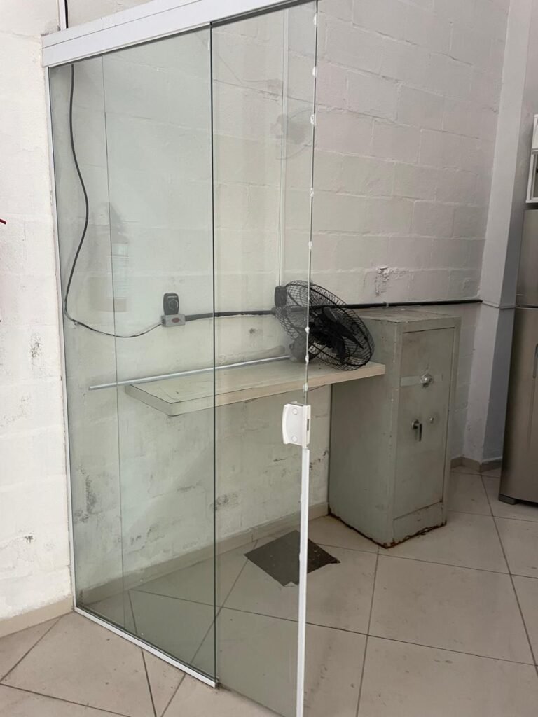 GALPÃO-: 07 Portas deslizantes em vidro temperado e estrutura de ferro em ordem, ambas com roldanas em ordem, 01 trinco para cadeado com cadeado em ordem, porta principal com 01 fechadura 3F em ordem e com chave, piso e rodapé revestidos de pisos de porcelanato com desgastes naturais, pontos com trincas pela extensão e restante em ordem, 02 tampas de inspeção de encanamento em ordem, paredes em blocos de concreto com pintura na cor branco neve com desgastes naturais, descasques pela extensão e restante em ordem, 01 poste interno com 01 disjuntor Jng C63 em ordem, 01 quadro de distribuição marca Tigre com tampa em ordem, disjuntores sendo eles: 04 SD C20 1P, 01 SD C20 2P, 02 SD C40 2P, 01 SD C63 2P (Todos Steck), 03 FD 3 C20 (Todos Fame), 01 C20 Jng 1P (Jng). 12 espelhos de luz sendo eles: 01 espelho com 01 interruptor, 07 espelhos com 01 tomada, 02 espelhos com 04 tomadas, 01 espelho com 01 interruptor, 01 espelho com 01 interruptor e 01 tomada. 03 luminárias de emergências danificadas, 05 câmeras de vigilância não testadas, 04 extintores de incêndio (02 carga de pó químico e 02 com carga de água, 01 de pó químico está vencido, restante em ordem. 01 parede de alvenaria com grafiato e pintura na cor preto com letreiro nas cores amarelo e branco, 03 ventiladores de teto (01 marca Lorensid e 02 Mondial) sendo que 01 deles está com base virada para baixo e 01 está fazendo barulho, 02 interruptores de ventilador em ordem marca AjSantos, 02 réguas de energia com 04 tomadas em ordem, 02 mesas de MDF com pequenos pontos saindo lascas, 01 gaveta em cada, com puxadores e corrediças em ordem, 02 portas canetas de MDF em ordem, 01 bancada com estrutura de ferro em ordem e 01 pedra de granito cor preto em ordem, 02 porta-copos marca Multi copo com partes trincadas e restante em ordem, 02 lixos de copos marca papacopo em ordem, 01 filtro de água marca Consul Facilite em ordem, pia com granito cor preto em ordem, 01 cuba de cerâmica cor branco com desgastes naturais, marca Incepa em ordem, 01 torneira de inox com acabamento solto e restante em ordem, 01 sifão sanfonado em ordem, 01 espelho de reflexo com moldura de madeira em ordem, telhado com estrutura de ferro com pintura na cor branco em ordem, telhas galvanizadas com pintura na cor branco em ordem, parte da parede revestida em telhas translúcidas sendo que 01 delas está solta. 08 luminárias pendentes com 01 lâmpada LED em cada sendo que 01 delas está queimada, 01 bocal com 01 lâmpada LED em ordem.