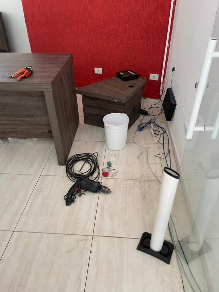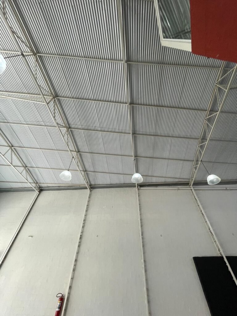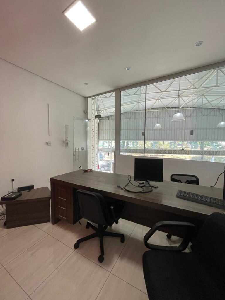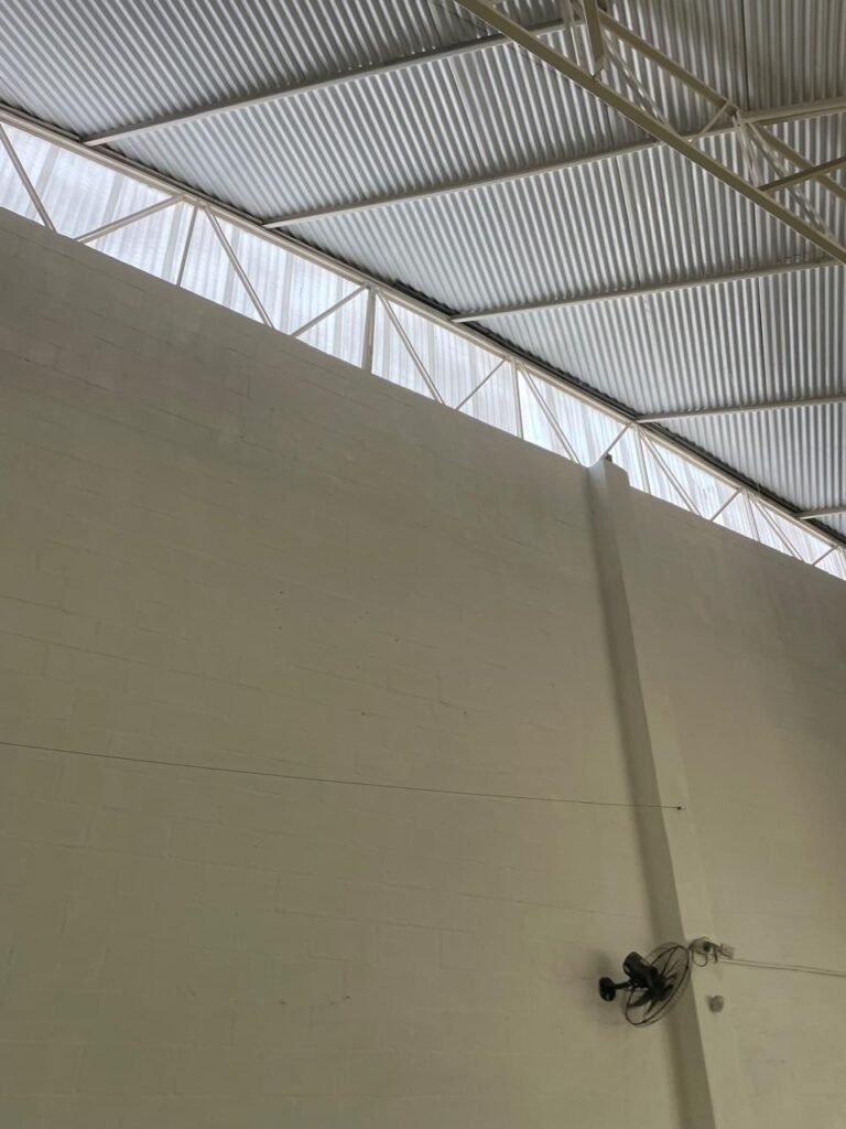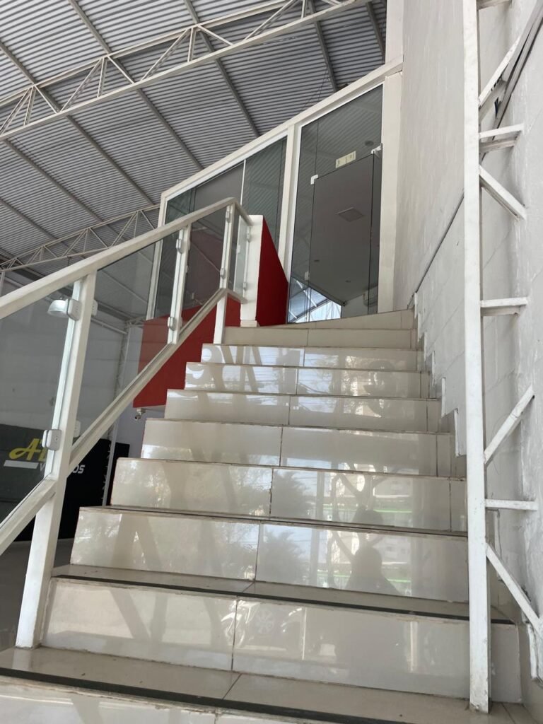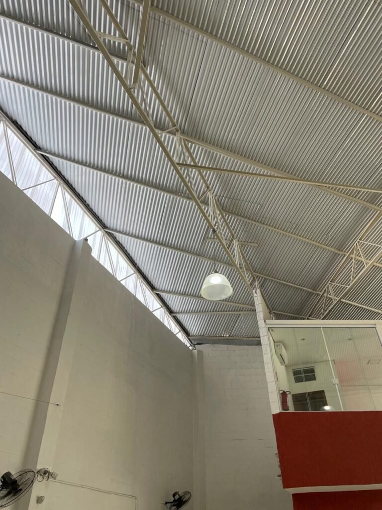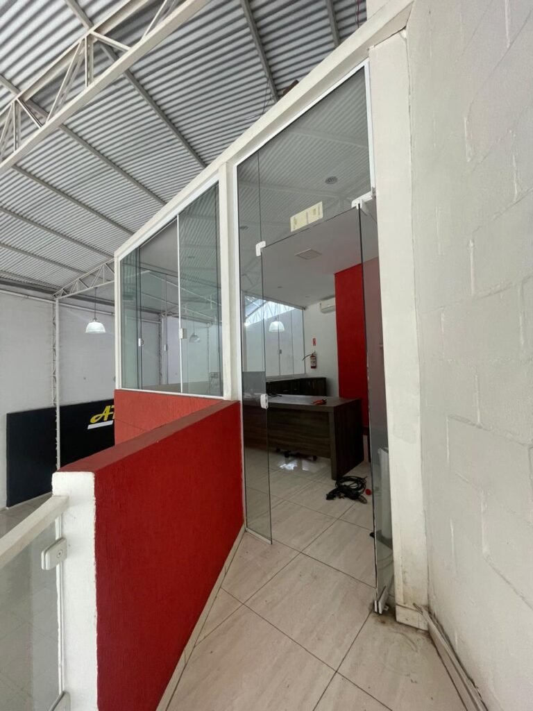 GALPÃO-: 07 Portas deslizantes em vidro temperado e estrutura de ferro em ordem, ambas com roldanas em ordem, 01 trinco para cadeado com cadeado em ordem, porta principal com 01 fechadura 3F em ordem e com chave, piso e rodapé revestidos de pisos de porcelanato com desgastes naturais, pontos com trincas pela extensão e restante em ordem, 02 tampas de inspeção de encanamento em ordem, paredes em blocos de concreto com pintura na cor branco neve com desgastes naturais, descasques pela extensão e restante em ordem, 01 poste interno com 01 disjuntor Jng C63 em ordem, 01 quadro de distribuição marca Tigre com tampa em ordem, disjuntores sendo eles: 04 SD C20 1P, 01 SD C20 2P, 02 SD C40 2P, 01 SD C63 2P (Todos Steck), 03 FD 3 C20 (Todos Fame), 01 C20 Jng 1P (Jng). 12 espelhos de luz sendo eles: 01 espelho com 01 interruptor, 07 espelhos com 01 tomada, 02 espelhos com 04 tomadas, 01 espelho com 01 interruptor, 01 espelho com 01 interruptor e 01 tomada. 03 luminárias de emergências danificadas, 05 câmeras de vigilância não testadas, 04 extintores de incêndio (02 carga de pó químico e 02 com carga de água, 01 de pó químico está vencido, restante em ordem. 01 parede de alvenaria com grafiato e pintura na cor preto com letreiro nas cores amarelo e branco, 03 ventiladores de teto (01 marca Lorensid e 02 Mondial) sendo que 01 deles está com base virada para baixo e 01 está fazendo barulho, 02 interruptores de ventilador em ordem marca AjSantos, 02 réguas de energia com 04 tomadas em ordem, 02 mesas de MDF com pequenos pontos saindo lascas, 01 gaveta em cada, com puxadores e corrediças em ordem, 02 portas canetas de MDF em ordem, 01 bancada com estrutura de ferro em ordem e 01 pedra de granito cor preto em ordem, 02 porta-copos marca Multi copo com partes trincadas e restante em ordem, 02 lixos de copos marca papacopo em ordem, 01 filtro de água marca Consul Facilite em ordem, pia com granito cor preto em ordem, 01 cuba de cerâmica cor branco com desgastes naturais, marca Incepa em ordem, 01 torneira de inox com acabamento solto e restante em ordem, 01 sifão sanfonado em ordem, 01 espelho de reflexo com moldura de madeira em ordem, telhado com estrutura de ferro com pintura na cor branco em ordem, telhas galvanizadas com pintura na cor branco em ordem, parte da parede revestida em telhas translúcidas sendo que 01 delas está solta. 08 luminárias pendentes com 01 lâmpada LED em cada sendo que 01 delas está queimada, 01 bocal com 01 lâmpada LED em ordem.