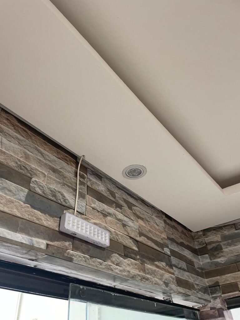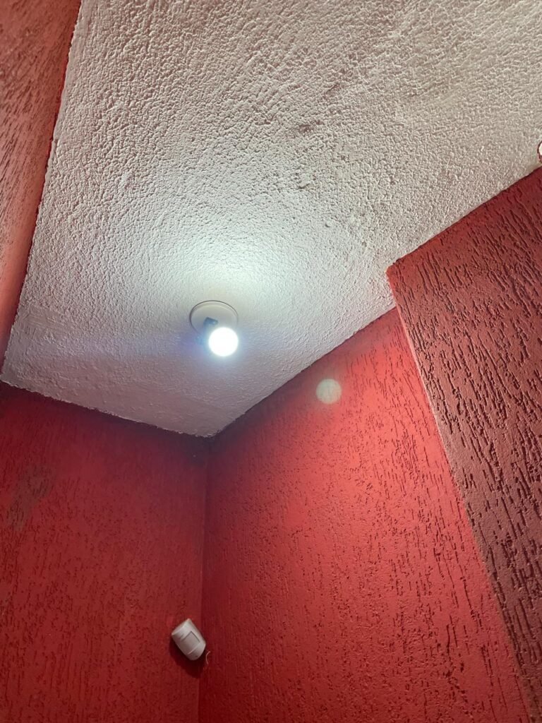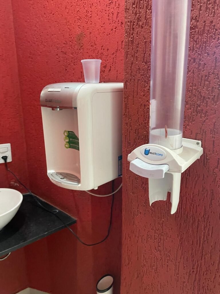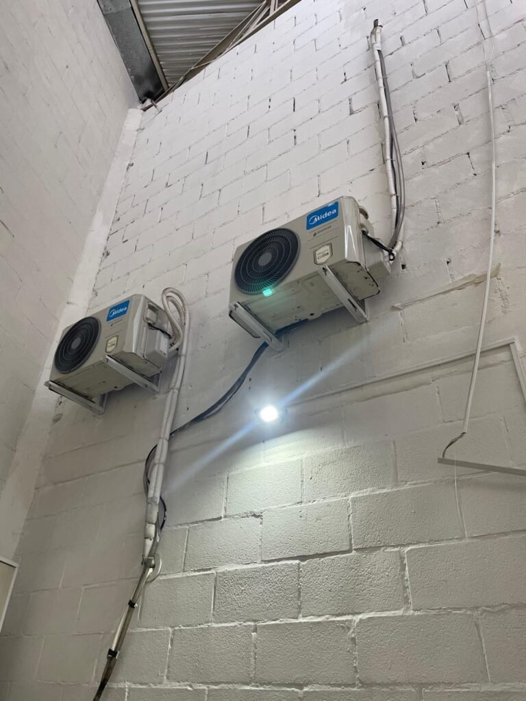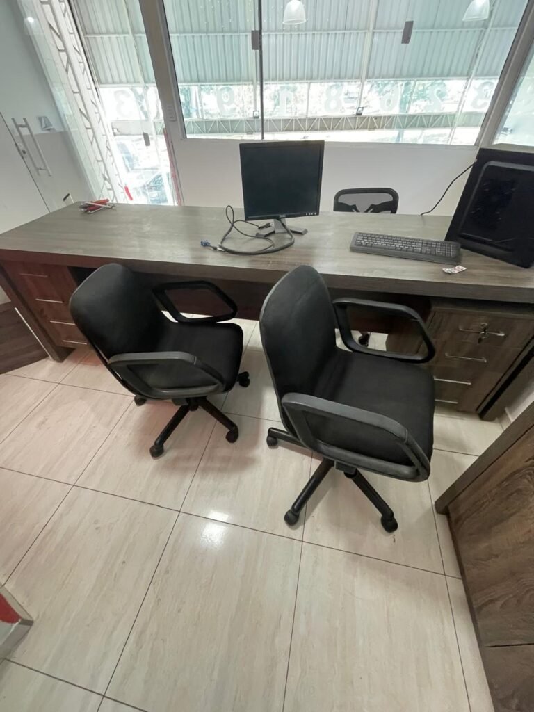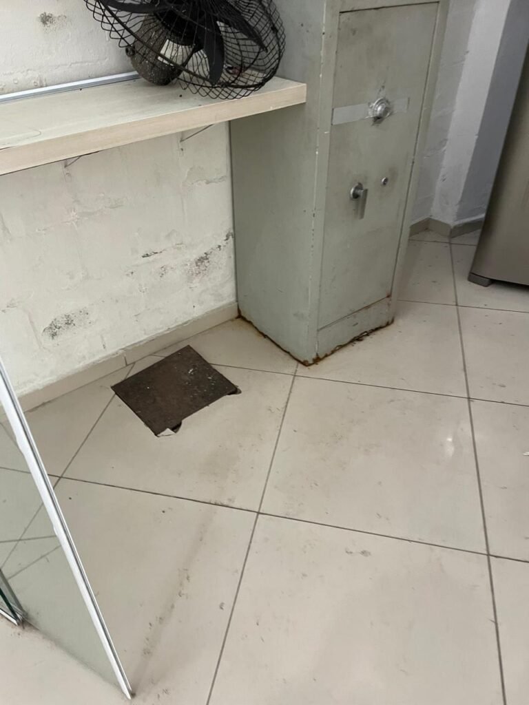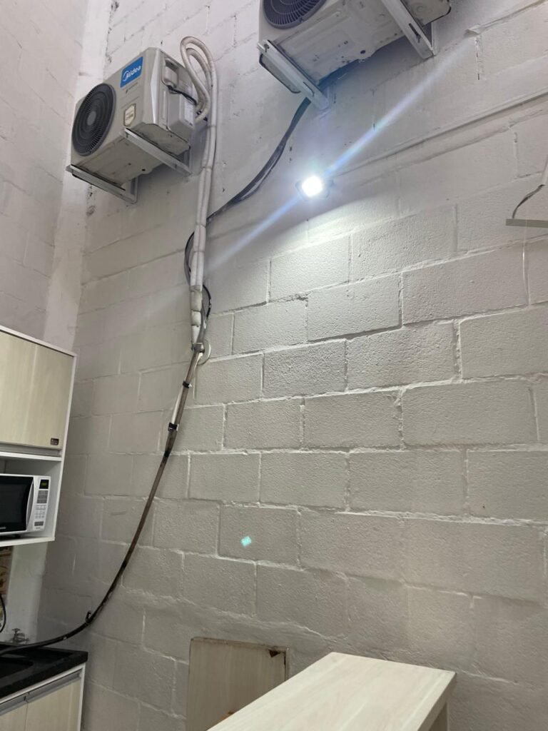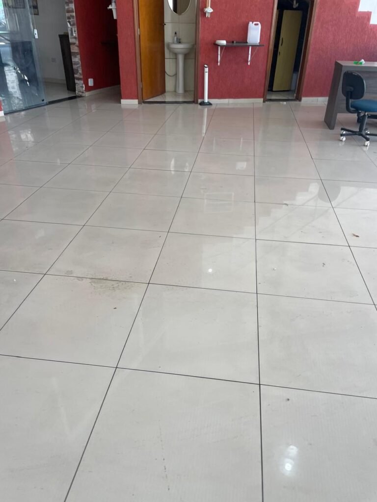 GALPÃO-: 07 Portas deslizantes em vidro temperado e estrutura de ferro em ordem, ambas com roldanas em ordem, 01 trinco para cadeado com cadeado em ordem, porta principal com 01 fechadura 3F em ordem e com chave, piso e rodapé revestidos de pisos de porcelanato com desgastes naturais, pontos com trincas pela extensão e restante em ordem, 02 tampas de inspeção de encanamento em ordem, paredes em blocos de concreto com pintura na cor branco neve com desgastes naturais, descasques pela extensão e restante em ordem, 01 poste interno com 01 disjuntor Jng C63 em ordem, 01 quadro de distribuição marca Tigre com tampa em ordem, disjuntores sendo eles: 04 SD C20 1P, 01 SD C20 2P, 02 SD C40 2P, 01 SD C63 2P (Todos Steck), 03 FD 3 C20 (Todos Fame), 01 C20 Jng 1P (Jng). 12 espelhos de luz sendo eles: 01 espelho com 01 interruptor, 07 espelhos com 01 tomada, 02 espelhos com 04 tomadas, 01 espelho com 01 interruptor, 01 espelho com 01 interruptor e 01 tomada. 03 luminárias de emergências danificadas, 05 câmeras de vigilância não testadas, 04 extintores de incêndio (02 carga de pó químico e 02 com carga de água, 01 de pó químico está vencido, restante em ordem. 01 parede de alvenaria com grafiato e pintura na cor preto com letreiro nas cores amarelo e branco, 03 ventiladores de teto (01 marca Lorensid e 02 Mondial) sendo que 01 deles está com base virada para baixo e 01 está fazendo barulho, 02 interruptores de ventilador em ordem marca AjSantos, 02 réguas de energia com 04 tomadas em ordem, 02 mesas de MDF com pequenos pontos saindo lascas, 01 gaveta em cada, com puxadores e corrediças em ordem, 02 portas canetas de MDF em ordem, 01 bancada com estrutura de ferro em ordem e 01 pedra de granito cor preto em ordem, 02 porta-copos marca Multi copo com partes trincadas e restante em ordem, 02 lixos de copos marca papacopo em ordem, 01 filtro de água marca Consul Facilite em ordem, pia com granito cor preto em ordem, 01 cuba de cerâmica cor branco com desgastes naturais, marca Incepa em ordem, 01 torneira de inox com acabamento solto e restante em ordem, 01 sifão sanfonado em ordem, 01 espelho de reflexo com moldura de madeira em ordem, telhado com estrutura de ferro com pintura na cor branco em ordem, telhas galvanizadas com pintura na cor branco em ordem, parte da parede revestida em telhas translúcidas sendo que 01 delas está solta. 08 luminárias pendentes com 01 lâmpada LED em cada sendo que 01 delas está queimada, 01 bocal com 01 lâmpada LED em ordem.