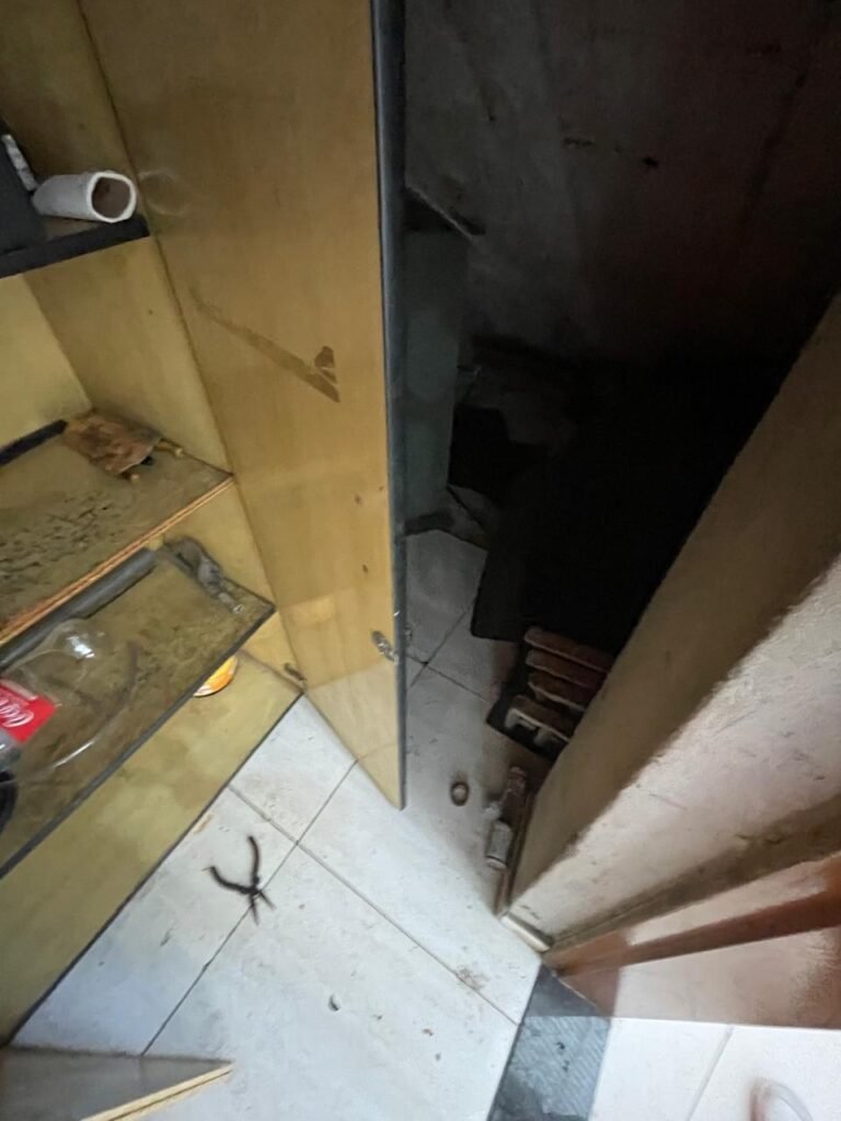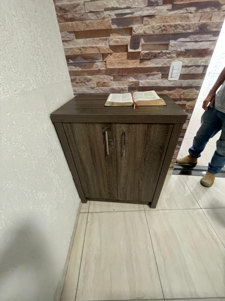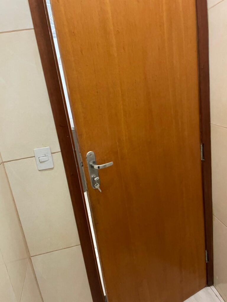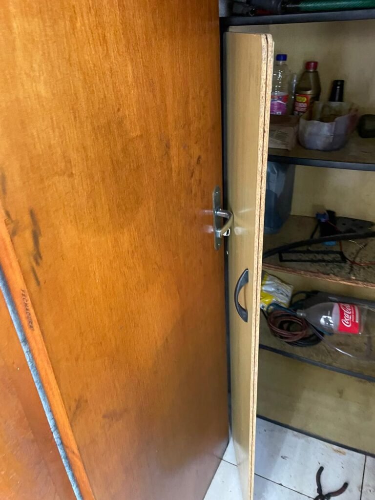 COMODO DE DESPENSA-: 01 Porta menor de madeira envernizada e em ordem, com maçaneta em inox em ordem, com fechadura marca Mgm em ordem e com chave, 01 soleira em granito preto em ordem, piso e rodapé revestido em pisos frios cerâmicos com desgastes naturais e partes danificada, paredes e teto sem reboco, 01 armário em MDF com desgastes naturais e 02 portas em ordem, 01 bocal com 01 lâmpada LED queimada.