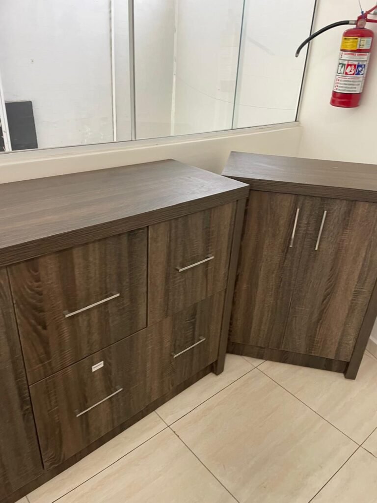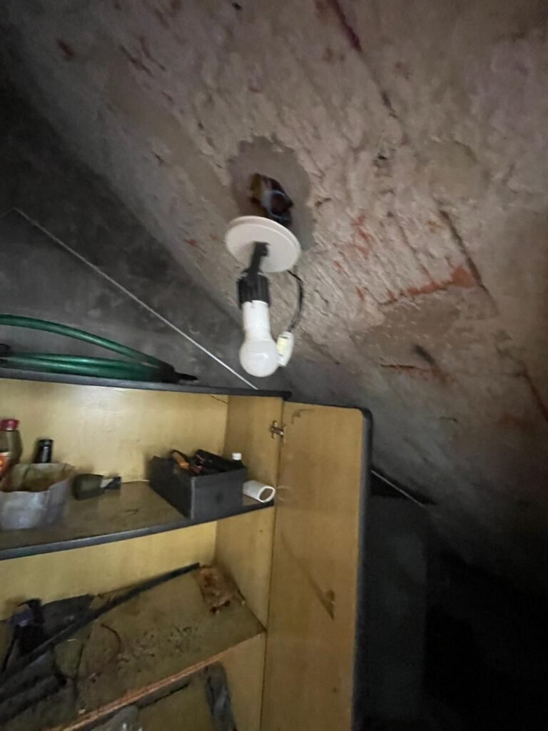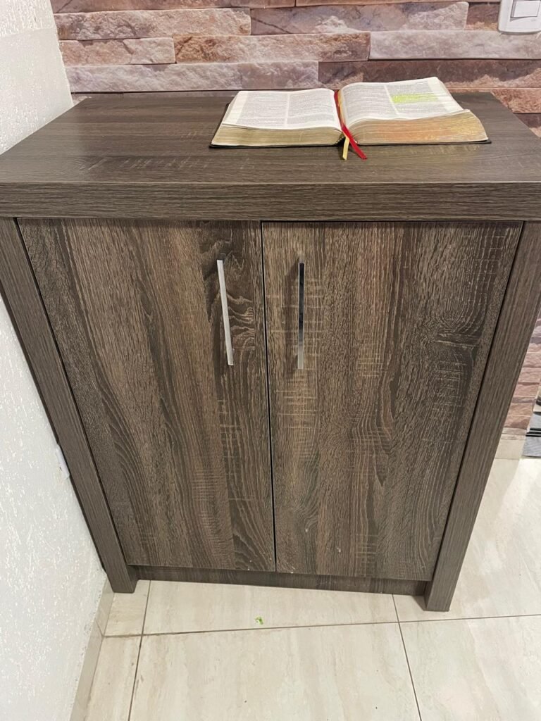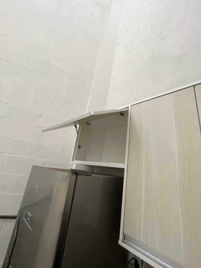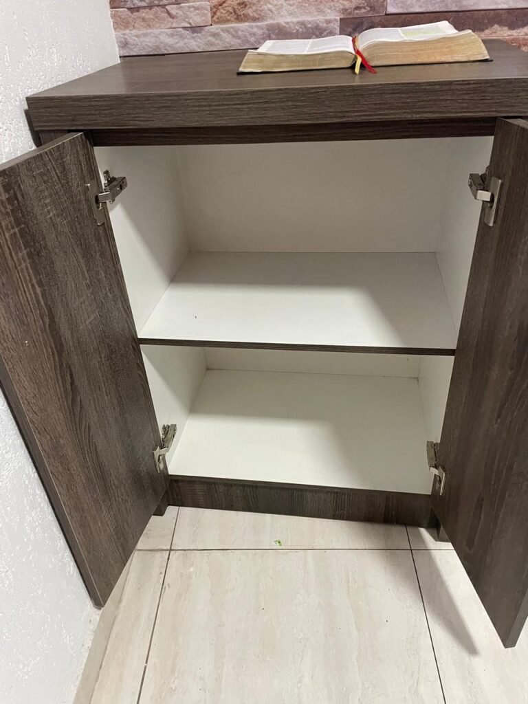 COMODO DE DESPENSA-: 01 Porta menor de madeira envernizada e em ordem, com maçaneta em inox em ordem, com fechadura marca Mgm em ordem e com chave, 01 soleira em granito preto em ordem, piso e rodapé revestido em pisos frios cerâmicos com desgastes naturais e partes danificada, paredes e teto sem reboco, 01 armário em MDF com desgastes naturais e 02 portas em ordem, 01 bocal com 01 lâmpada LED queimada.