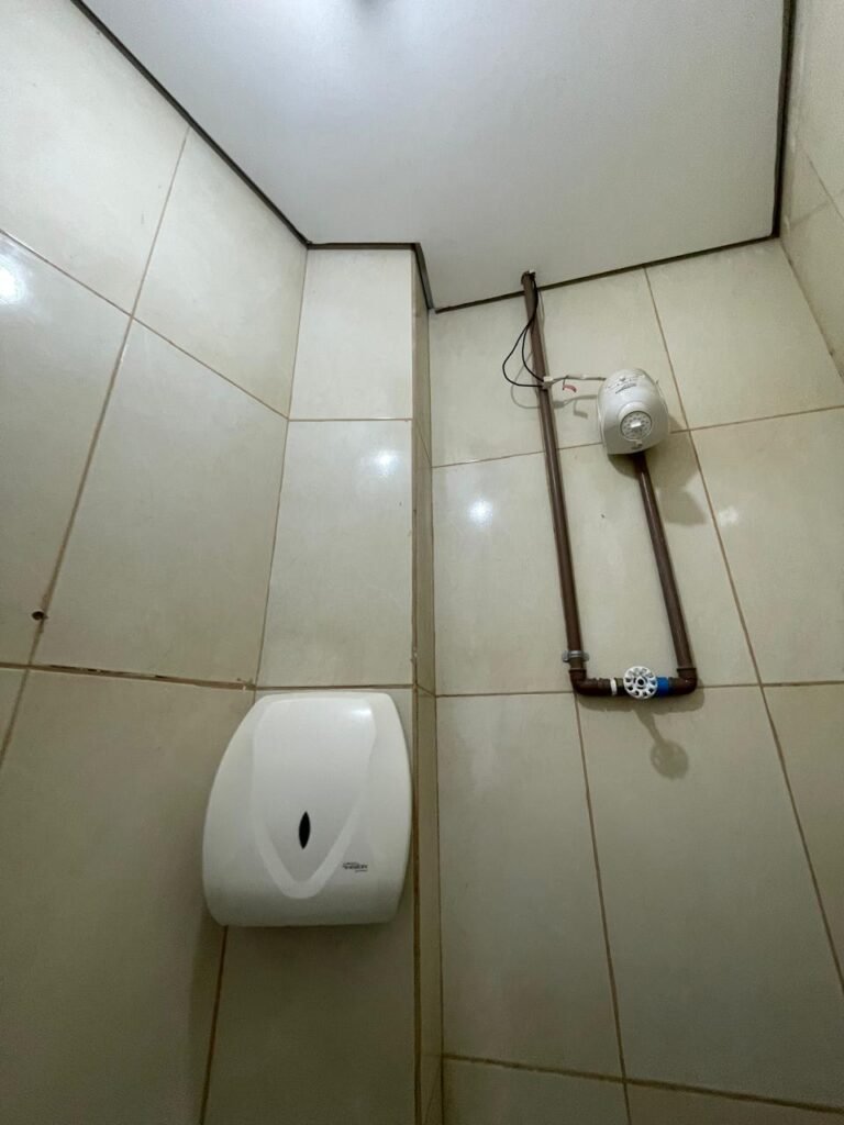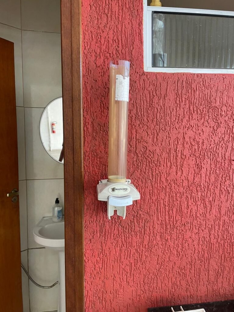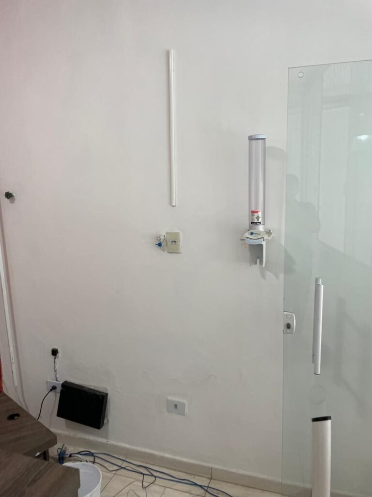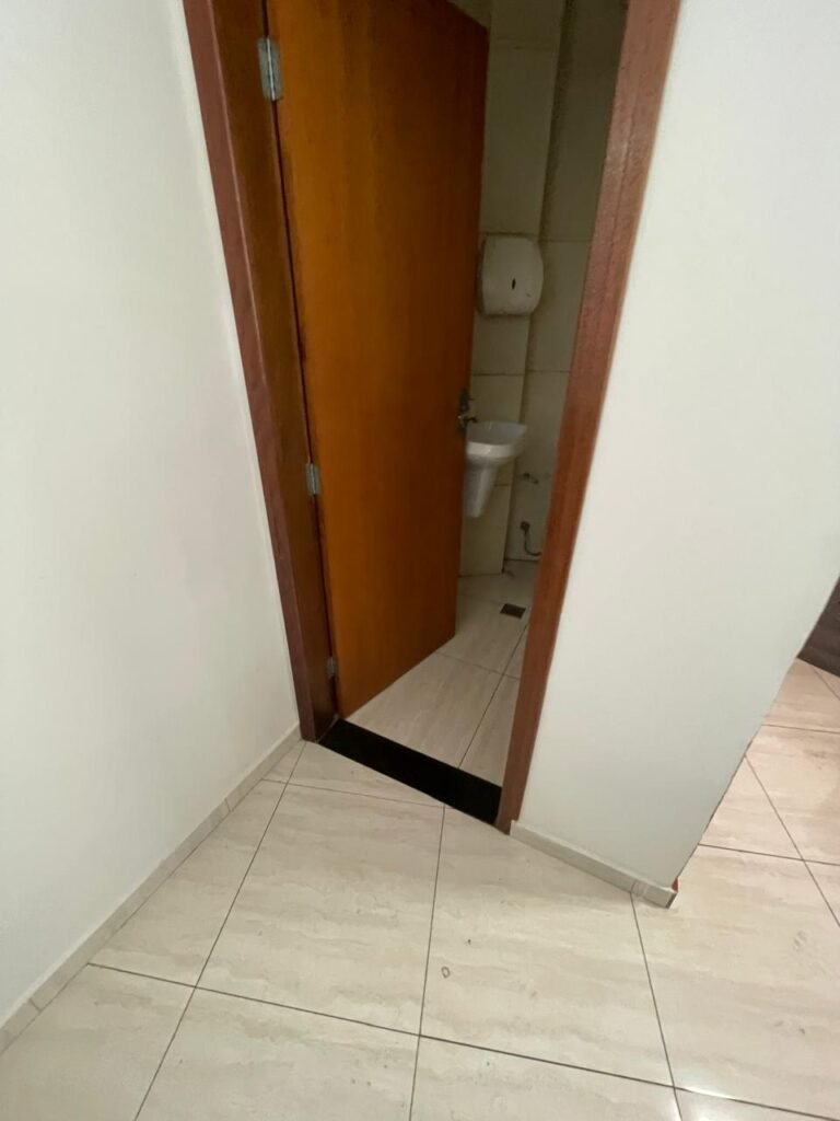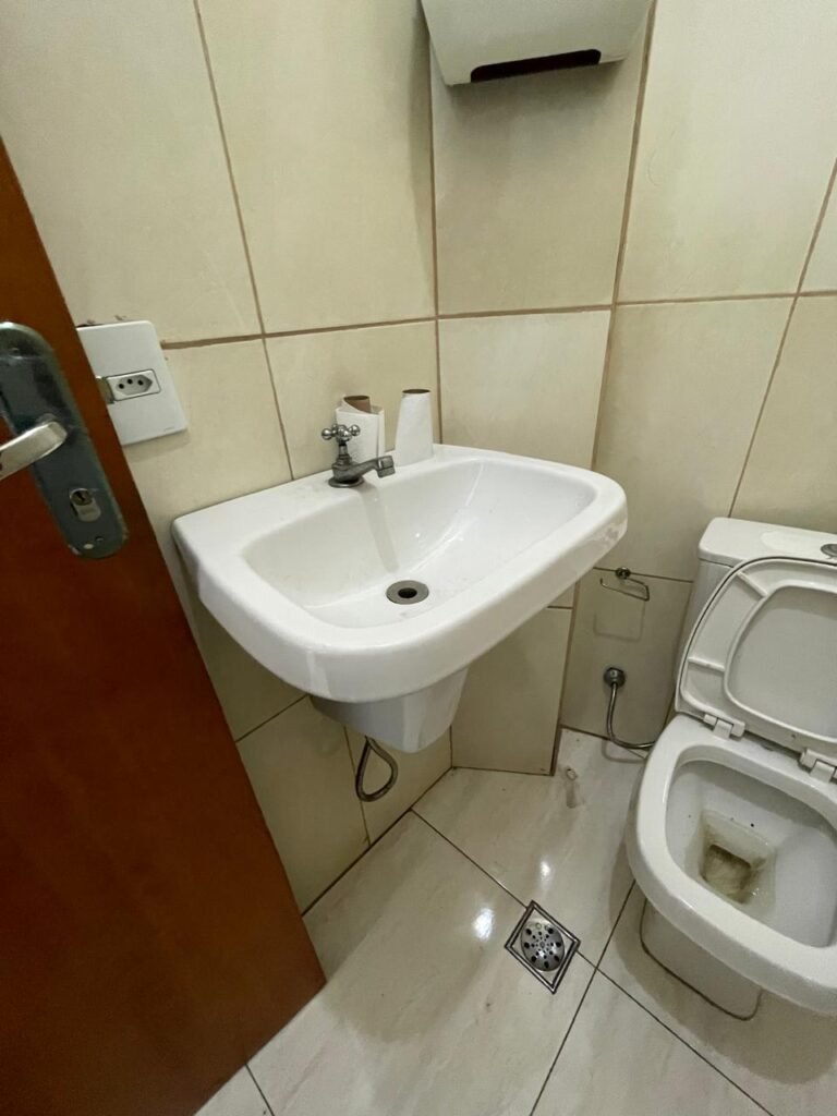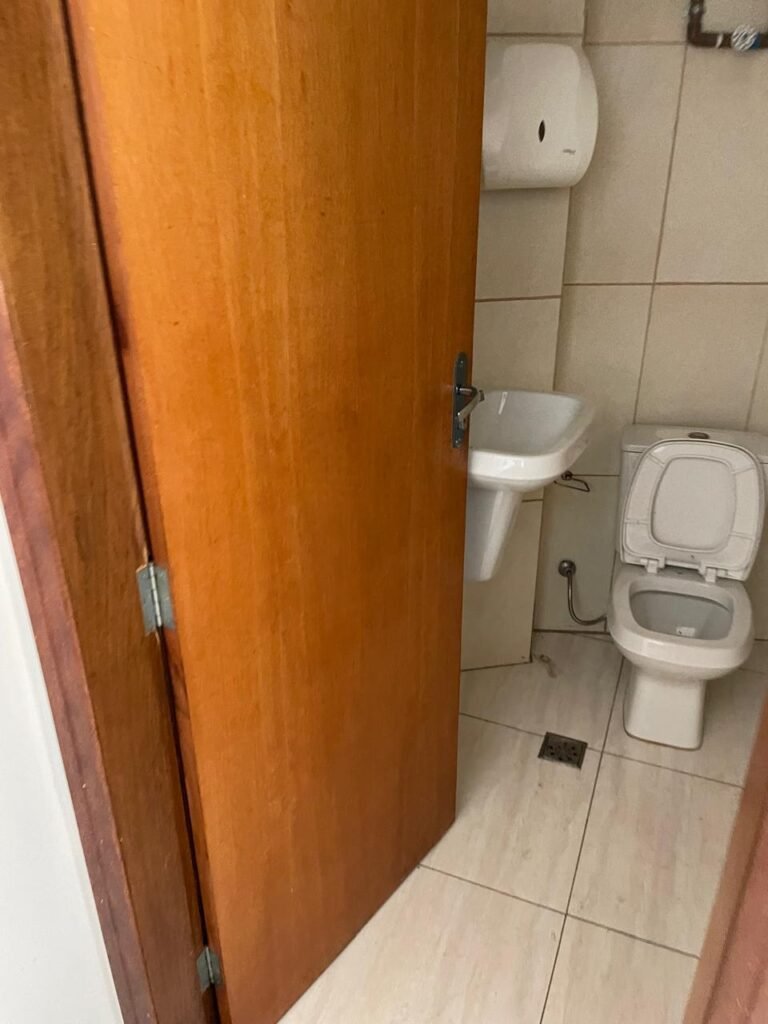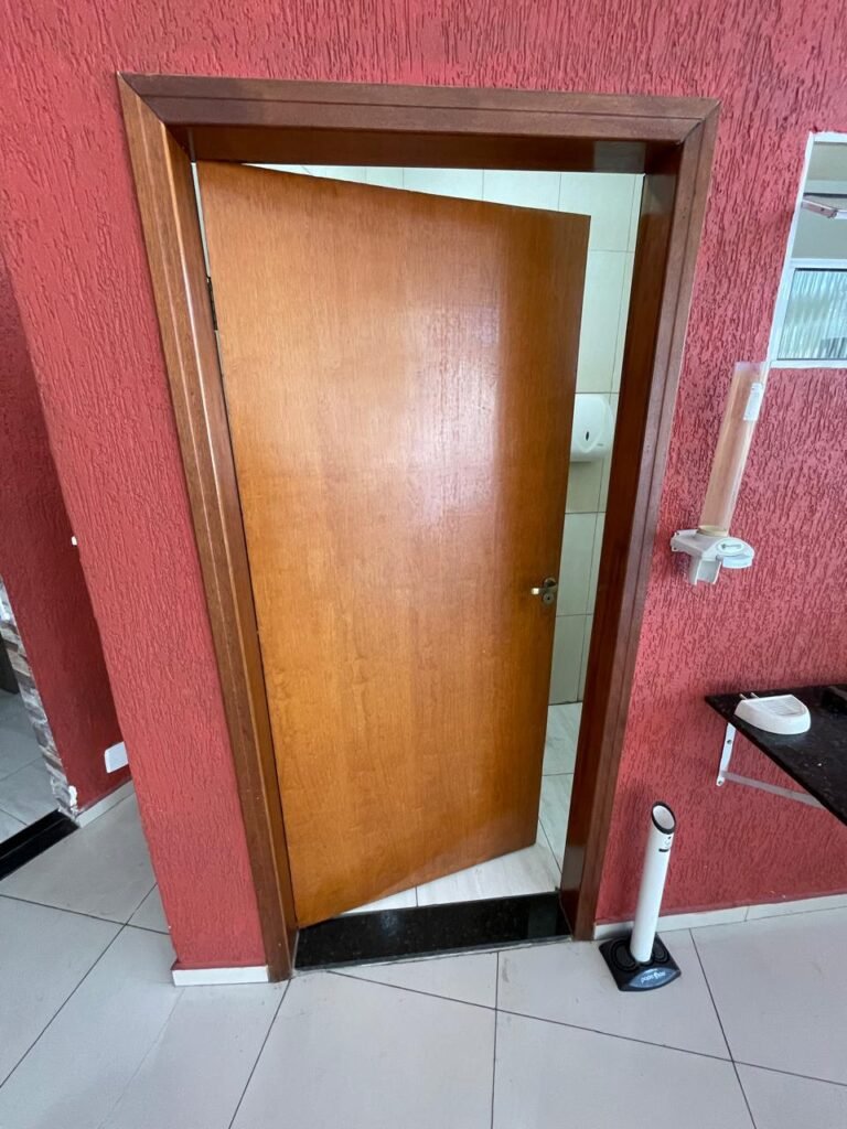 WC ESCRITÓRIO SUPERIOR-: 01 porta de madeira envernizada em ordem, maçaneta de inox em ordem, fechadura marca Mgm em ordem e com chaves, 01 soleira de granito cor preto em ordem, piso e parede revestidas de pisos frios cerâmicos com desgastes naturais e com pontos trincados, 01 ralo em inox em ordem, 01 pia com cuba acoplada marca Celite em ordem, torneira de inox com desgastes naturais em ordem, conjunto sanitário de cerâmica cor branco em ordem, marca Celite, com acento e tampa em ordem, válvula de descarga embutida de inox em ordem, descarga em ordem, suporte de papel higiênico de inox com acabamento danificado, suporte de papel de mão marca Clen Velox Premisse em ordem, 01 chuveiro Lorenzetti ducha relax não testado, 02 espelhos de luz dentre eles: 01 com 01 interruptor e 01 com 01 tomada, 01 vitrô basculante com esquadrias de alumínio em ordem, com fechadura desencaixada, e com 02 folhas de vidro canelados em ordem, teto com rebaixamento e forro de gesso em ordem, pintura na cor branco neve em ordem, 01 spot duplo com apenas 01 lâmpada de LED em ordem.