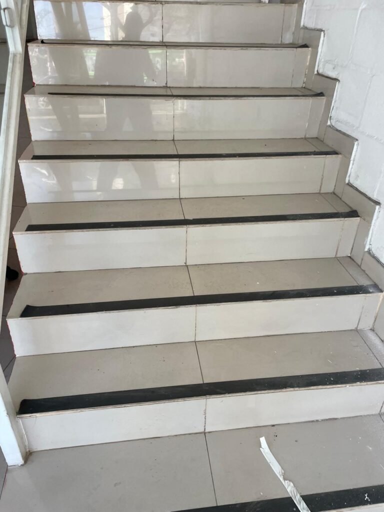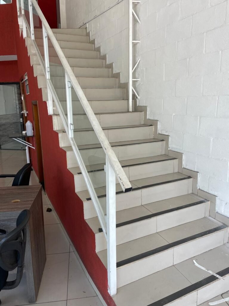 ESCADA: 01 escada de alvenaria revestida de pisos de porcelanato com desgastes naturais e com partes trincadas restante em ordem, fitas adesivas antiderrapantes com desgastes naturais restante em ordem, corrimão e guarda corpo de ferro, com 05 vidros temperados em ordem, e pintura na cor branco com desgastes naturais.