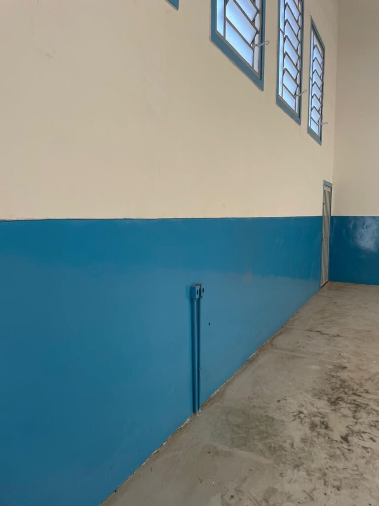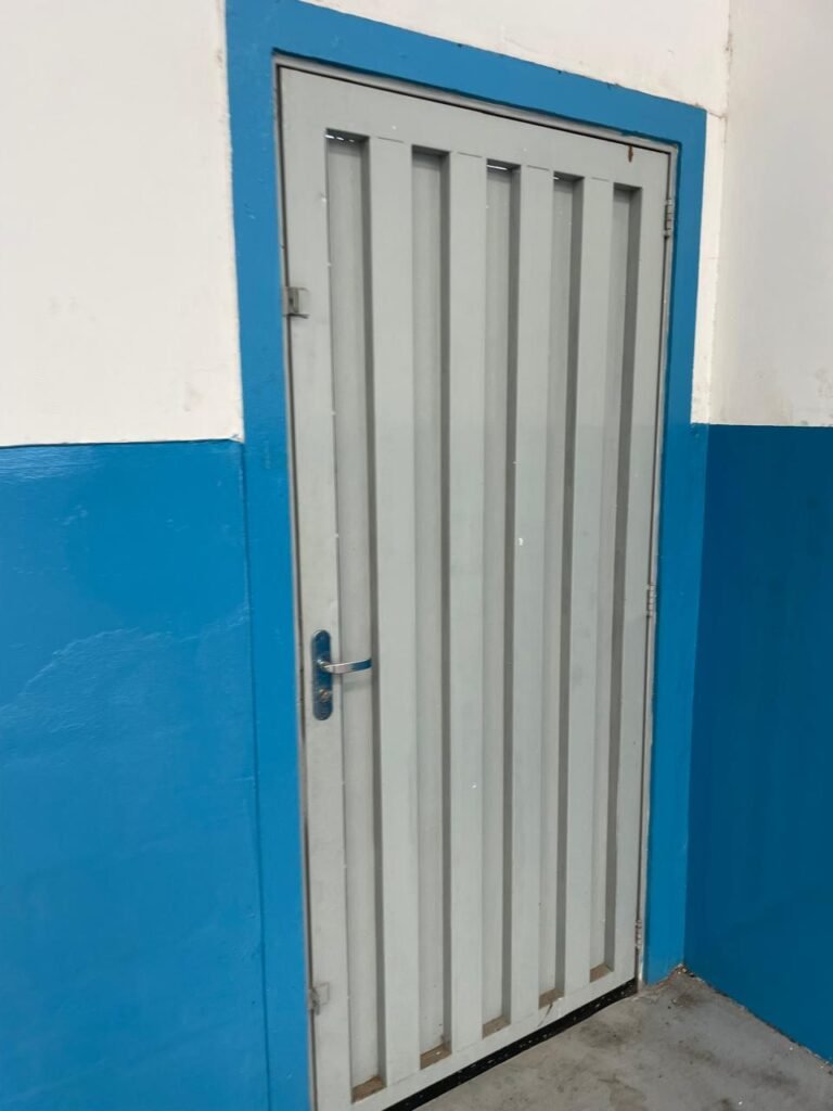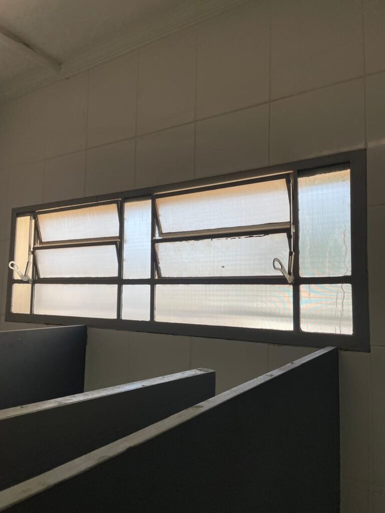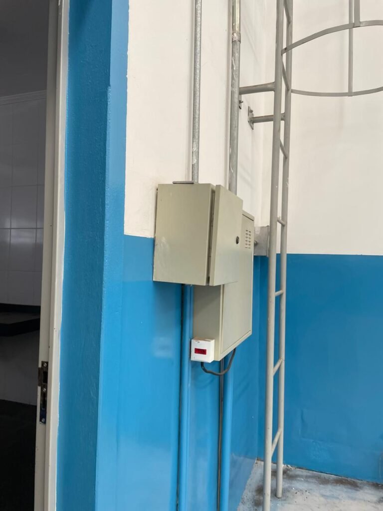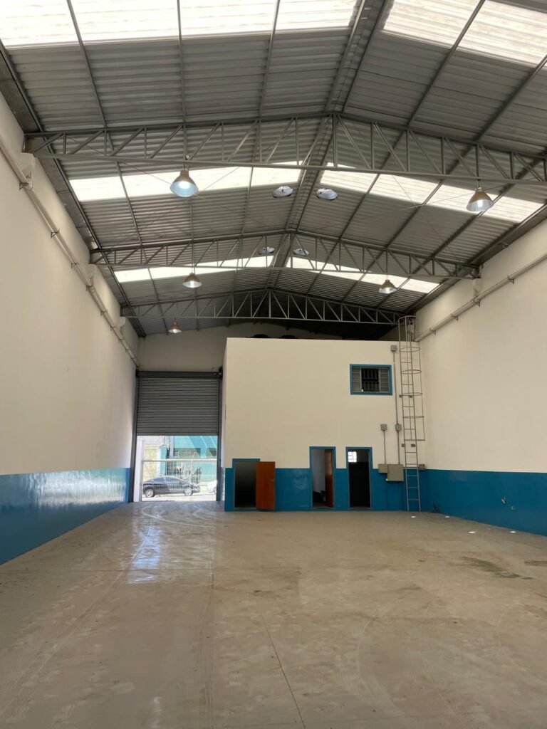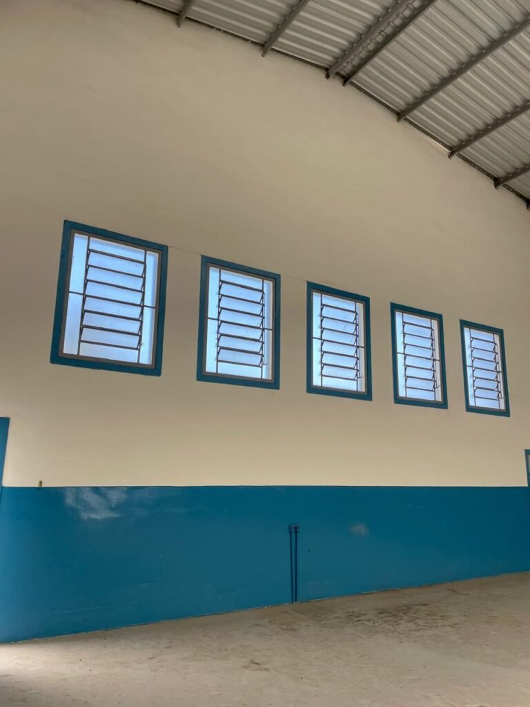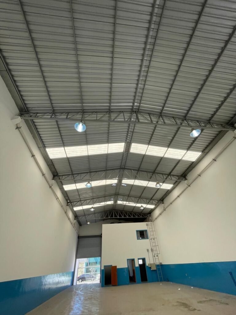 BARRACÃO-: 01 Porta automática de enrolar de alumínio em ordem, com 01 motor automático em ordem, 01 botoeira com 03 botões em ordem, piso com pintura epóxi cor cinza em ordem, zero um ralo de plástico branco em ordem, paredes com pintura barrada em epóxi na cor azul em ordem e restante com pintura na cor branco neve com manchas de infiltrações e restante em ordem, 07 espelhos de luz marca Tramontina, 07 tomadas (03 220w e 04 110w), sendo que 01 delas está com fiação aparente, 01 torneira de Jardim em ordem, 01 escada de ferro com gradil de proteção e pintura na cor cinza com desgastes naturais w restante em ordem, 03 quadros de distribuição de energia, 014 de distribuição de disjuntores com tampa de proteção e fechadura em ordem, com 01 chave da fechadura em ordem, disjuntores sendo eles: 01 SD C63 3P, 03 SD C16 2P, 04 SD C20 1P, 02 SD C20 2P, 02 SD C32 2P, ambos marca Steck em ordem, 01 disjuntor marca Tramontina TDJ3 C63 3P. 014 de distribuição de fio de telefone e internet, 014 com 04 interruptores de luminárias, 05 vitrôs basculantes com moldura com pintura na cor azul, com esquadrias de ferro com pintura na cor cinza com desgastes naturais, todas com 12 vidros foscos com manchas de tinta e restante em ordem e 01 fechadura em cada, telhado com fechamento em telhas galvanizadas em ordem, 06 telhas translúcidas em ordem, 04 exaustores eólicos em ordem, 07 luminárias pendentes com lâmpadas de led em ordem, 02 portas sociais de metalon com pintura na cor cinza em ordem, ambas com veda insetos em ordem, com maçanetas em inox com manchas de tinta e restante em ordem, com fechadura marca Pado em ordem e com chave, e 02 trincos para cadeado em cada.