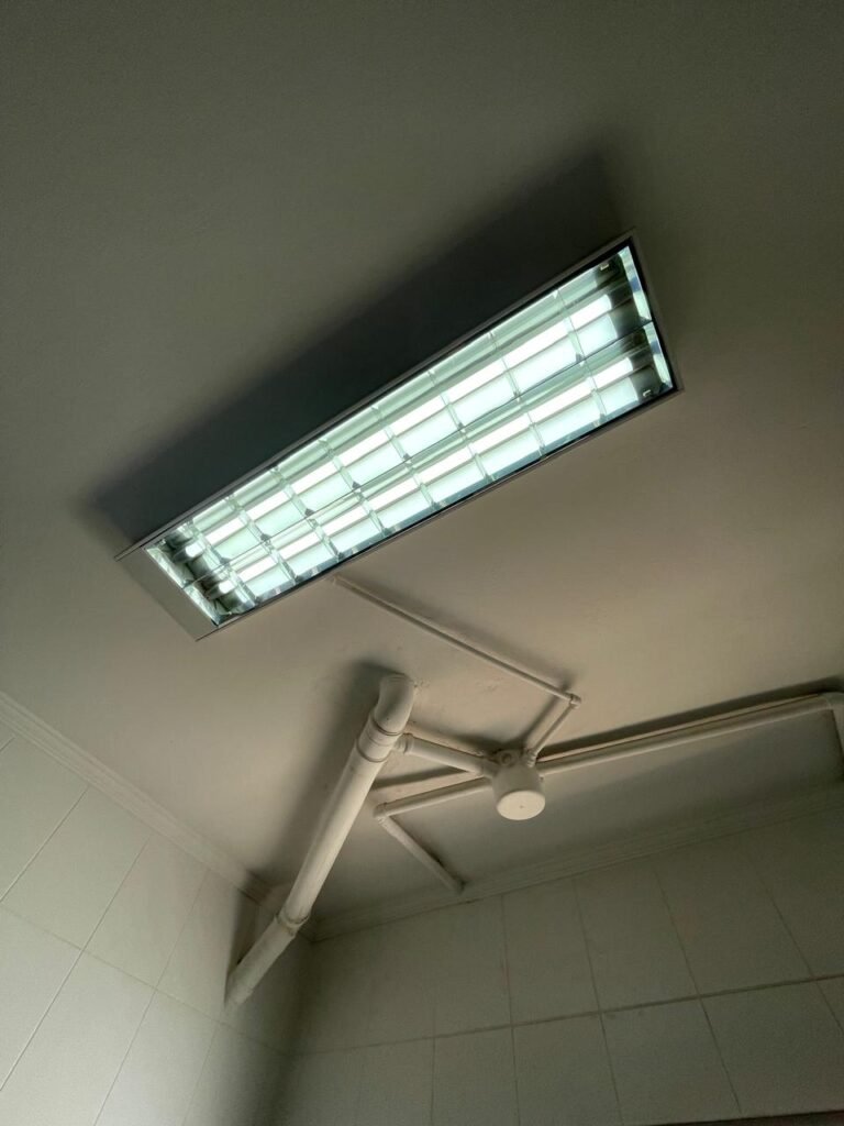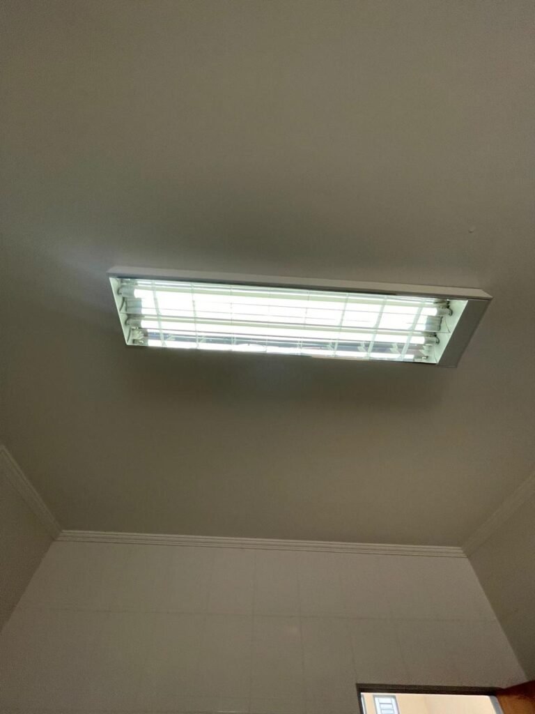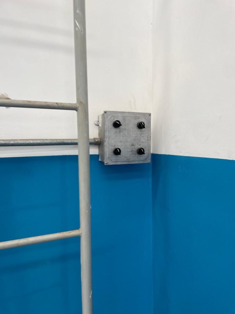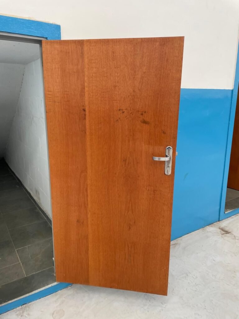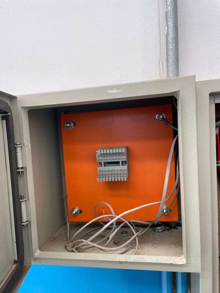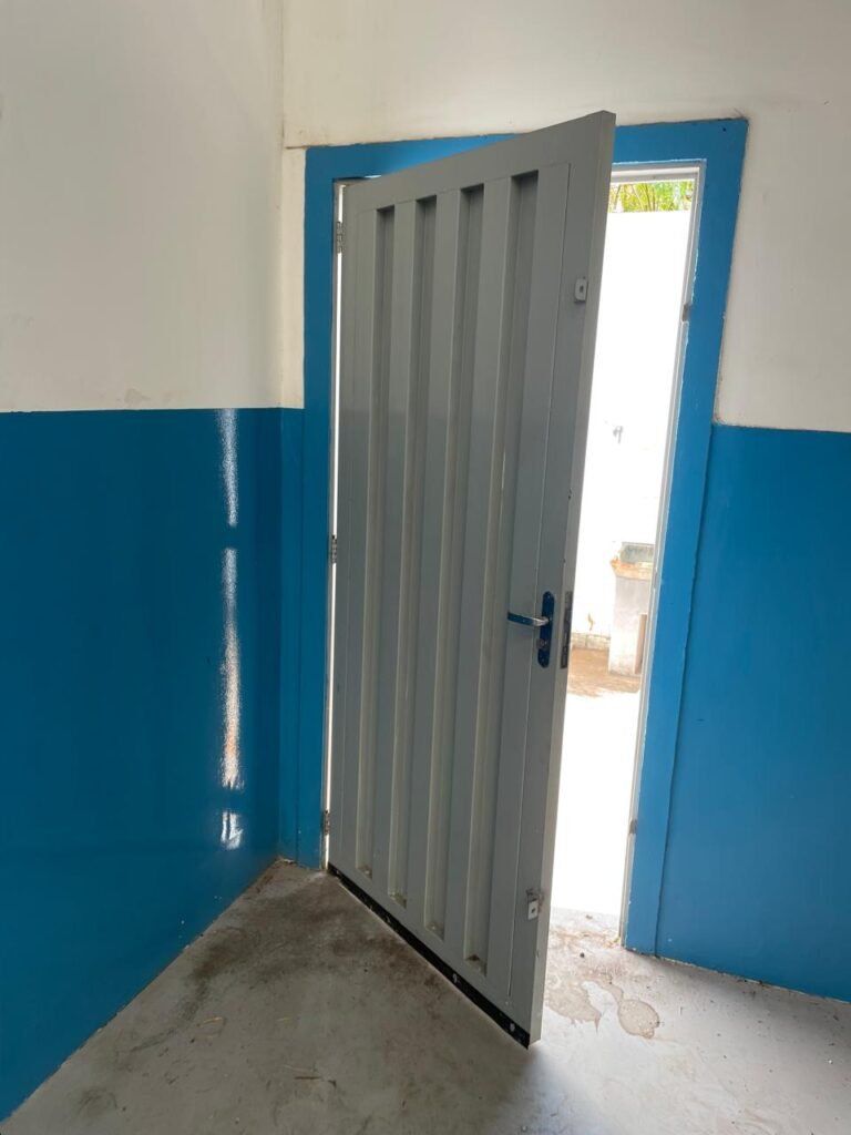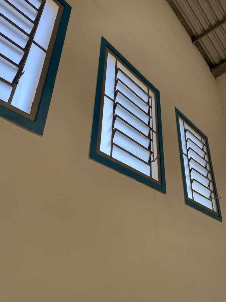 BARRACÃO-: 01 Porta automática de enrolar de alumínio em ordem, com 01 motor automático em ordem, 01 botoeira com 03 botões em ordem, piso com pintura epóxi cor cinza em ordem, zero um ralo de plástico branco em ordem, paredes com pintura barrada em epóxi na cor azul em ordem e restante com pintura na cor branco neve com manchas de infiltrações e restante em ordem, 07 espelhos de luz marca Tramontina, 07 tomadas (03 220w e 04 110w), sendo que 01 delas está com fiação aparente, 01 torneira de Jardim em ordem, 01 escada de ferro com gradil de proteção e pintura na cor cinza com desgastes naturais w restante em ordem, 03 quadros de distribuição de energia, 014 de distribuição de disjuntores com tampa de proteção e fechadura em ordem, com 01 chave da fechadura em ordem, disjuntores sendo eles: 01 SD C63 3P, 03 SD C16 2P, 04 SD C20 1P, 02 SD C20 2P, 02 SD C32 2P, ambos marca Steck em ordem, 01 disjuntor marca Tramontina TDJ3 C63 3P. 014 de distribuição de fio de telefone e internet, 014 com 04 interruptores de luminárias, 05 vitrôs basculantes com moldura com pintura na cor azul, com esquadrias de ferro com pintura na cor cinza com desgastes naturais, todas com 12 vidros foscos com manchas de tinta e restante em ordem e 01 fechadura em cada, telhado com fechamento em telhas galvanizadas em ordem, 06 telhas translúcidas em ordem, 04 exaustores eólicos em ordem, 07 luminárias pendentes com lâmpadas de led em ordem, 02 portas sociais de metalon com pintura na cor cinza em ordem, ambas com veda insetos em ordem, com maçanetas em inox com manchas de tinta e restante em ordem, com fechadura marca Pado em ordem e com chave, e 02 trincos para cadeado em cada.