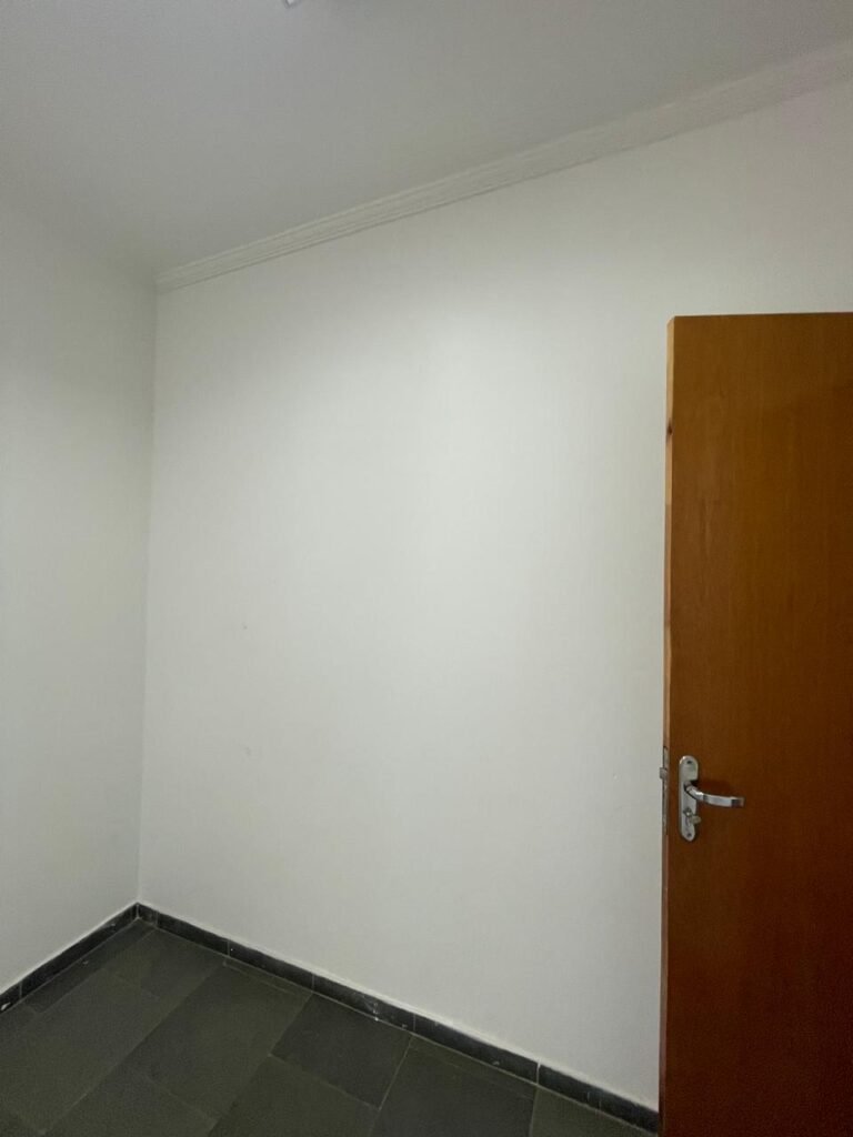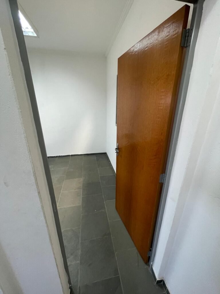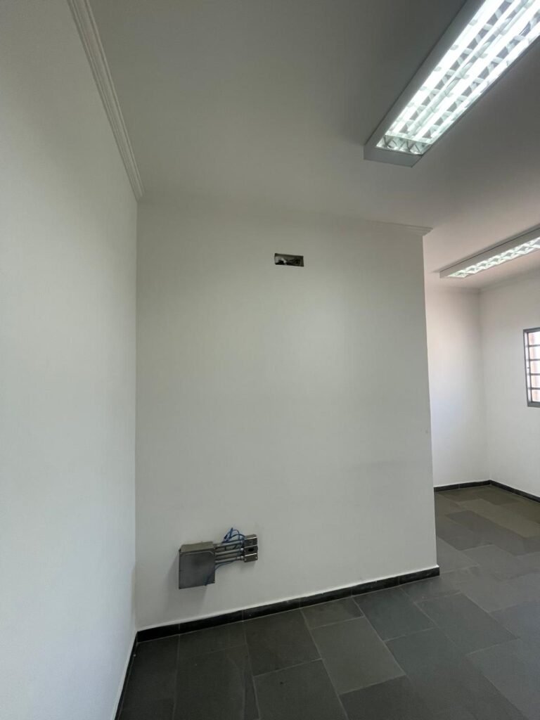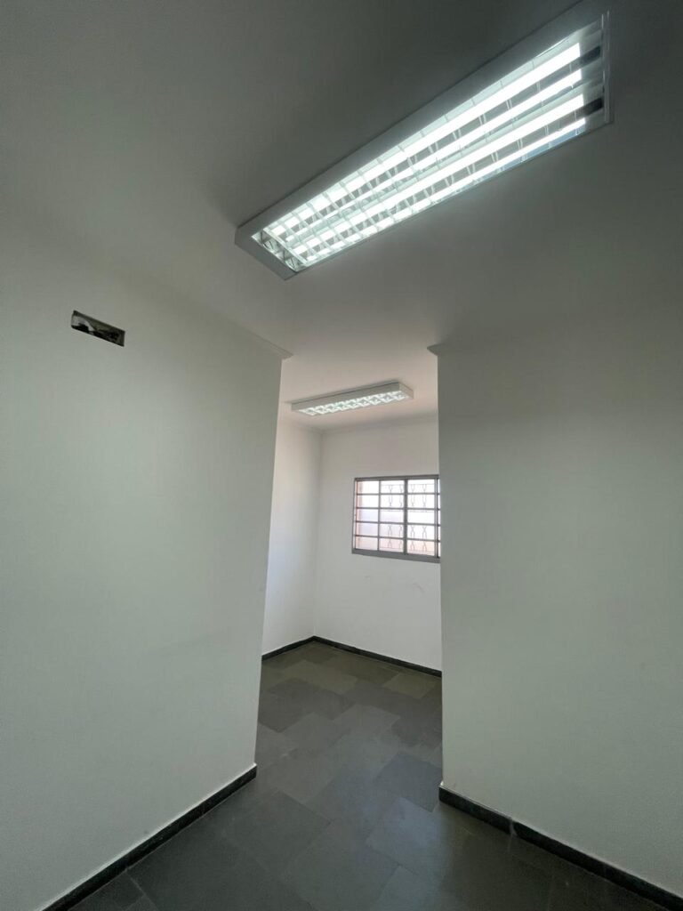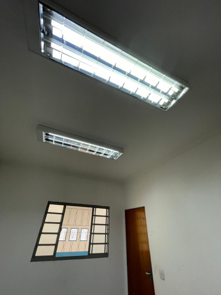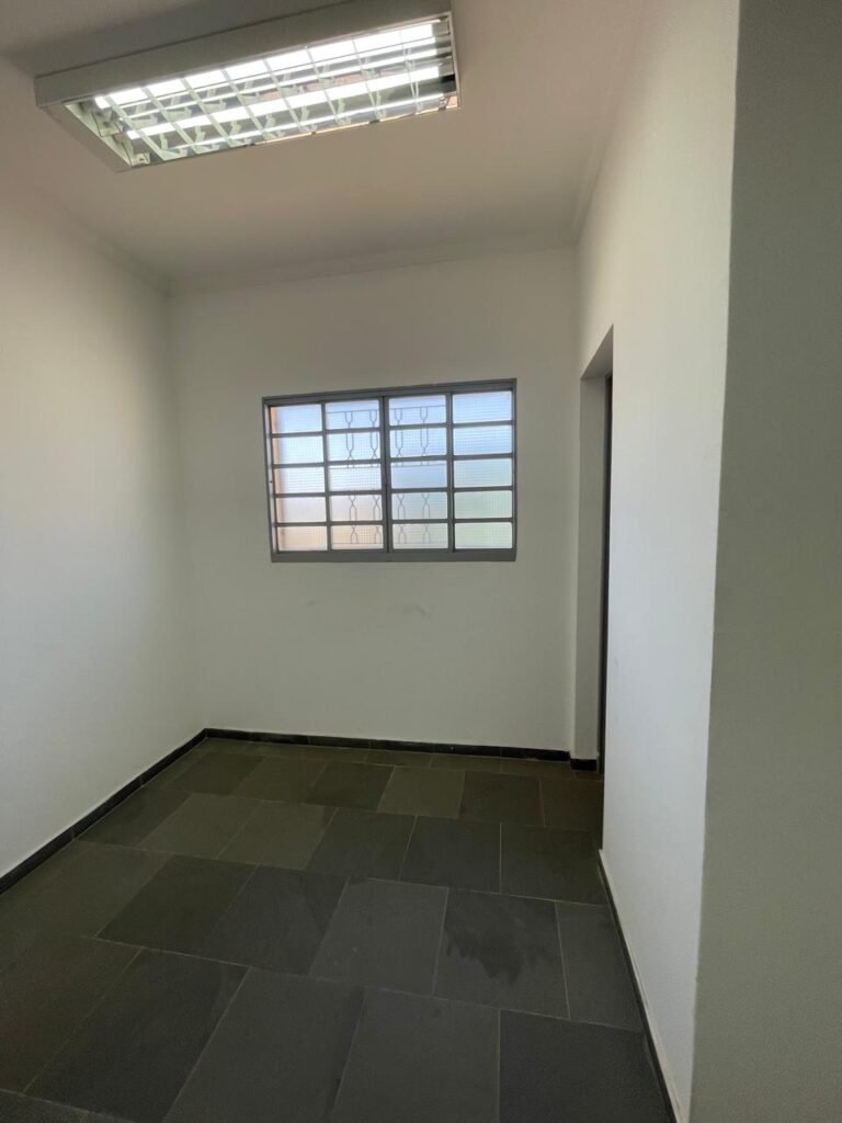 01 ESCRITÓRIO SUPERIOR-: 01 Porta social de madeira envernizada em ordem, com maçanetas e inox em ordem, com fechadura simples marca Pado em ordem e com chave, piso e rodapé revestido em ardósia com desgastes naturais e restante em ordem, paredes com pintura na cor branco neve com manchas de sujeira e restante em ordem, 02 espelhos de luz marca Tramontina (01 interruptor e 01 tomada), 02 quadros de distribuição de energia com 01 cabo de internet e com 03 conduletes, 01 com entrada para fio de dados, 01 tomada e 01 condulete cego. 01 ponto para ar condicionado, 01 janela deslizante marca Lucasa, com esquadrias de ferro com pintura na cor cinza, com 20 vidros foscos com manchas de tinta e restante em ordem, com 01 fechadura em ordem, grade de proteção de ferro em ordem, 02 luminárias duplas jateadas com 02 lâmpadas tubulares com LED em ordem em cada, teto com gola de gesso em ordem e com pintura na cor branco neve em ordem.