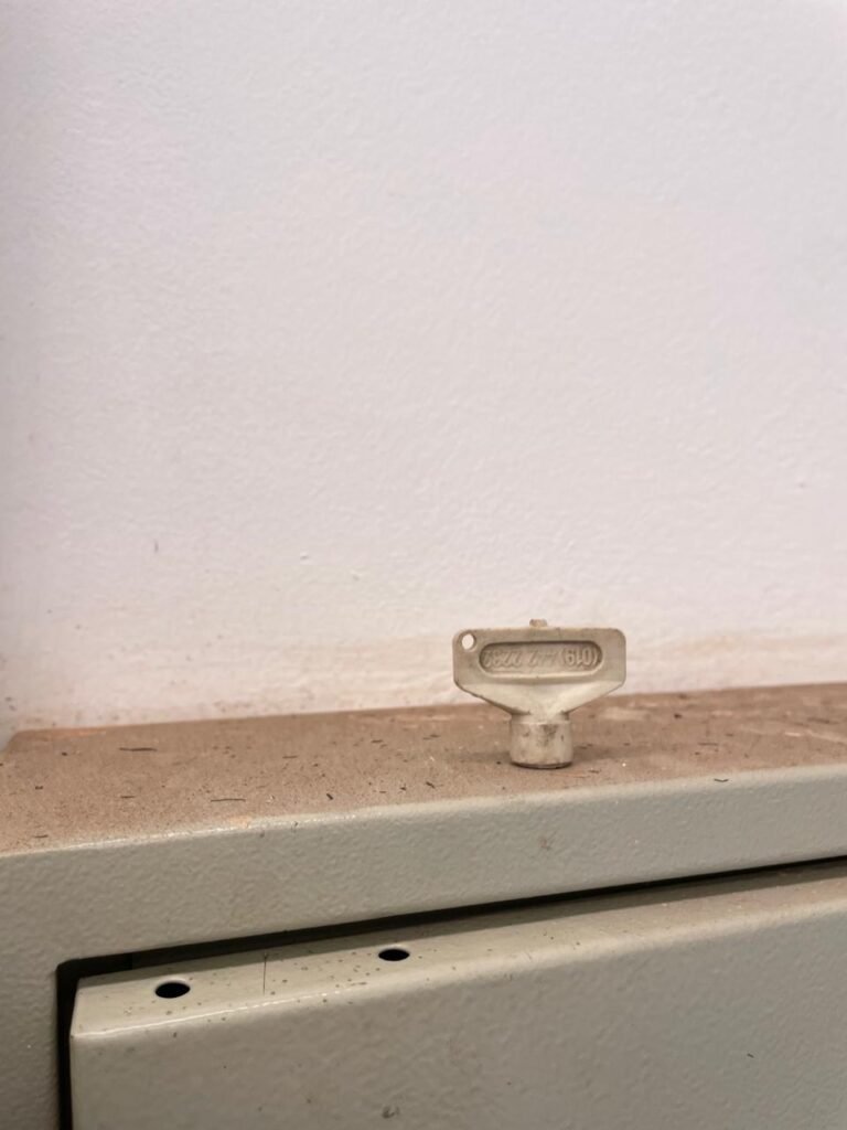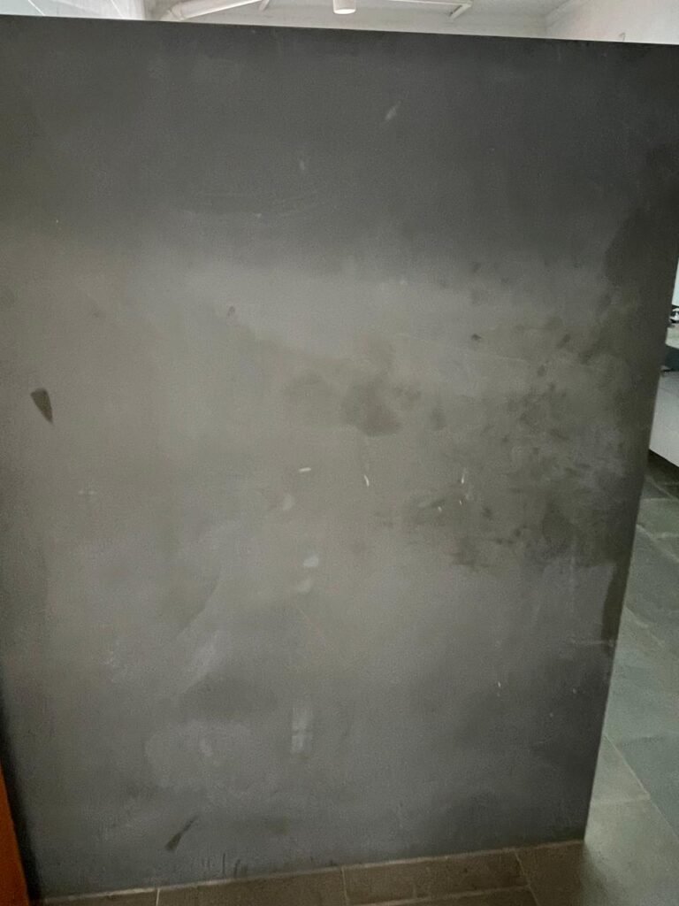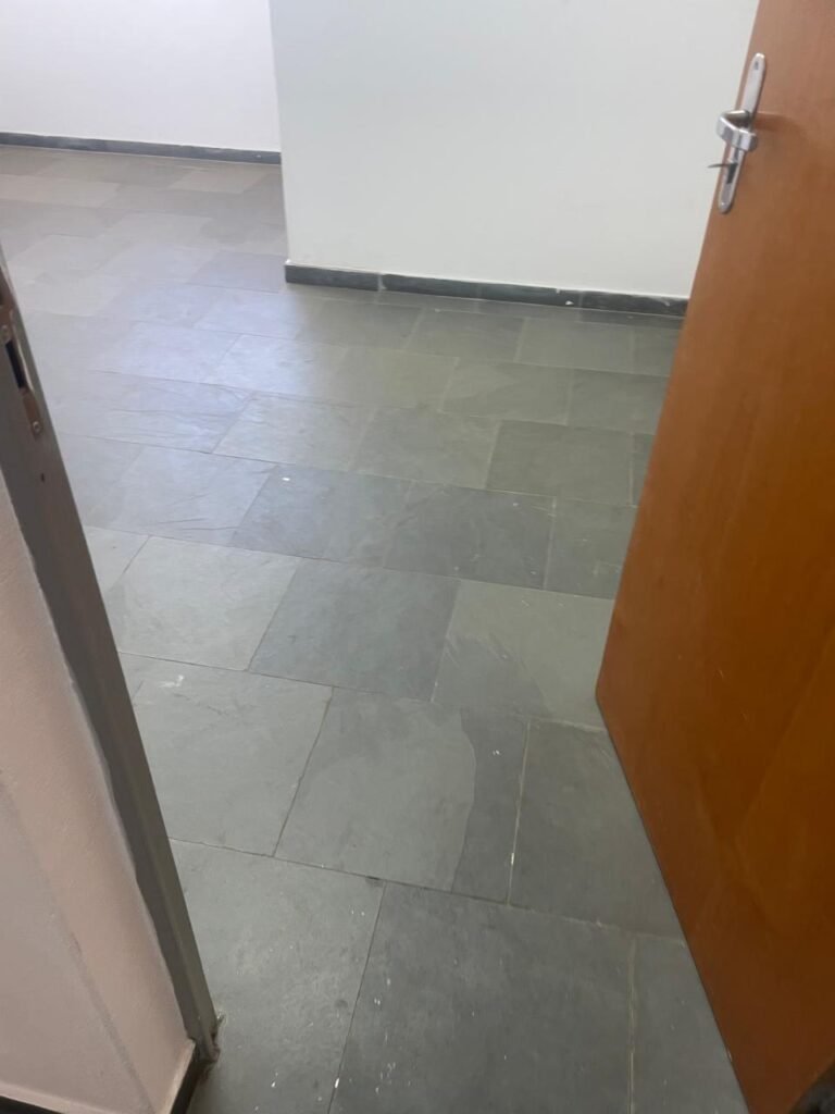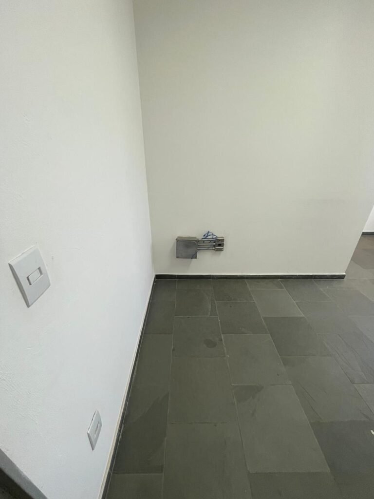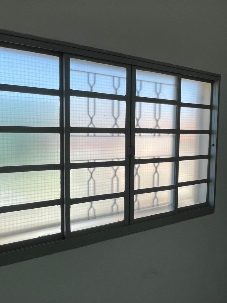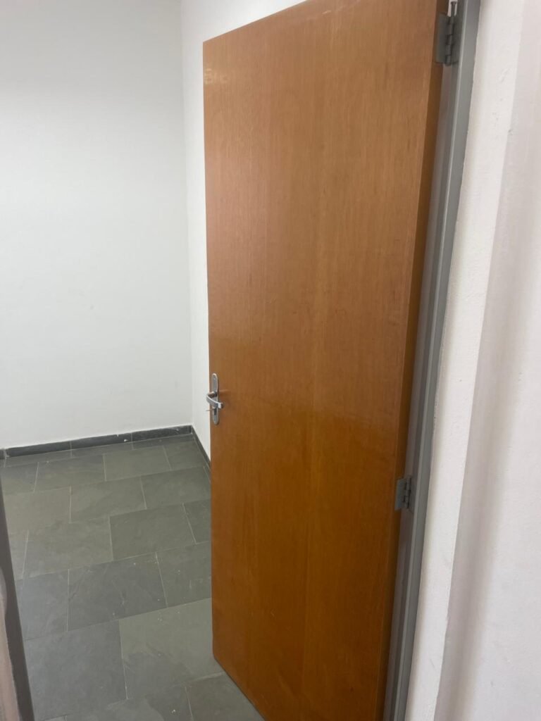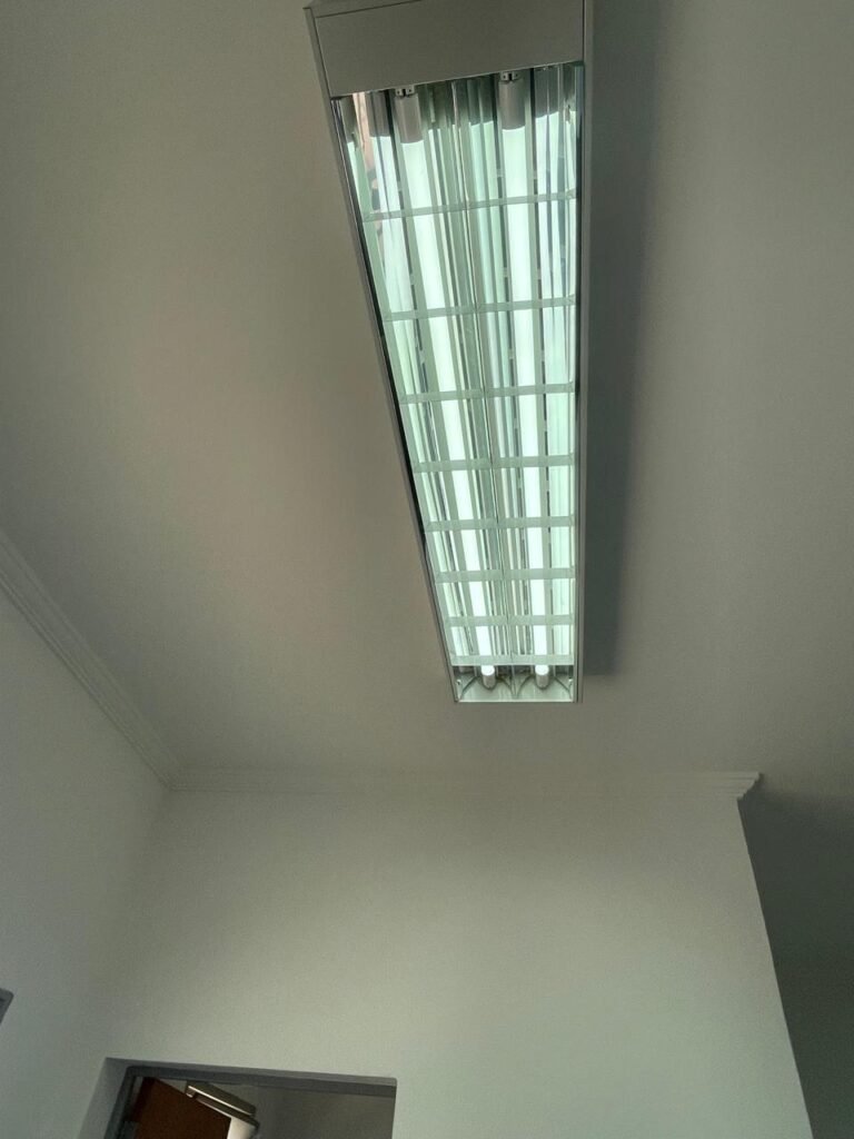01 ESCRITÓRIO SUPERIOR-: 01 Porta social de madeira envernizada em ordem, com maçanetas e inox em ordem, com fechadura simples marca Pado em ordem e com chave, piso e rodapé revestido em ardósia com desgastes naturais e restante em ordem, paredes com pintura na cor branco neve com manchas de sujeira e restante em ordem, 02 espelhos de luz marca Tramontina (01 interruptor e 01 tomada), 02 quadros de distribuição de energia com 01 cabo de internet e com 03 conduletes, 01 com entrada para fio de dados, 01 tomada e 01 condulete cego. 01 ponto para ar condicionado, 01 janela deslizante marca Lucasa, com esquadrias de ferro com pintura na cor cinza, com 20 vidros foscos com manchas de tinta e restante em ordem, com 01 fechadura em ordem, grade de proteção de ferro em ordem, 02 luminárias duplas jateadas com 02 lâmpadas tubulares com LED em ordem em cada, teto com gola de gesso em ordem e com pintura na cor branco neve em ordem.