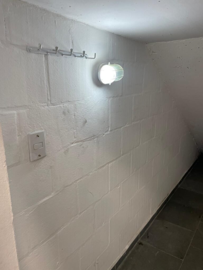 HALL ENTRADA/ ESCADA-: 01 Porta social de metalon com pintura na cor cinza com desgastes naturais, maçanetas em inox em ordem, fechadura simples marca Pado em ordem e com chave em ordem, 02 fechaduras tetras marca Soprano em ordem e com chaves, piso e rodapé em ardósia em ordem, paredes com pintura na cor branco neve com pequenas manchas e restante em ordem, 02 espelhos de luz marca Tramontina com 01 interruptor em cada, 02 luminárias prato com led em ordem, 06 corrimões com pintura na cor cinza em ordem, 01 luminária tartaruga não testada, janela de tijolos de vidro temperado, com 09 tijolos de vidro.
