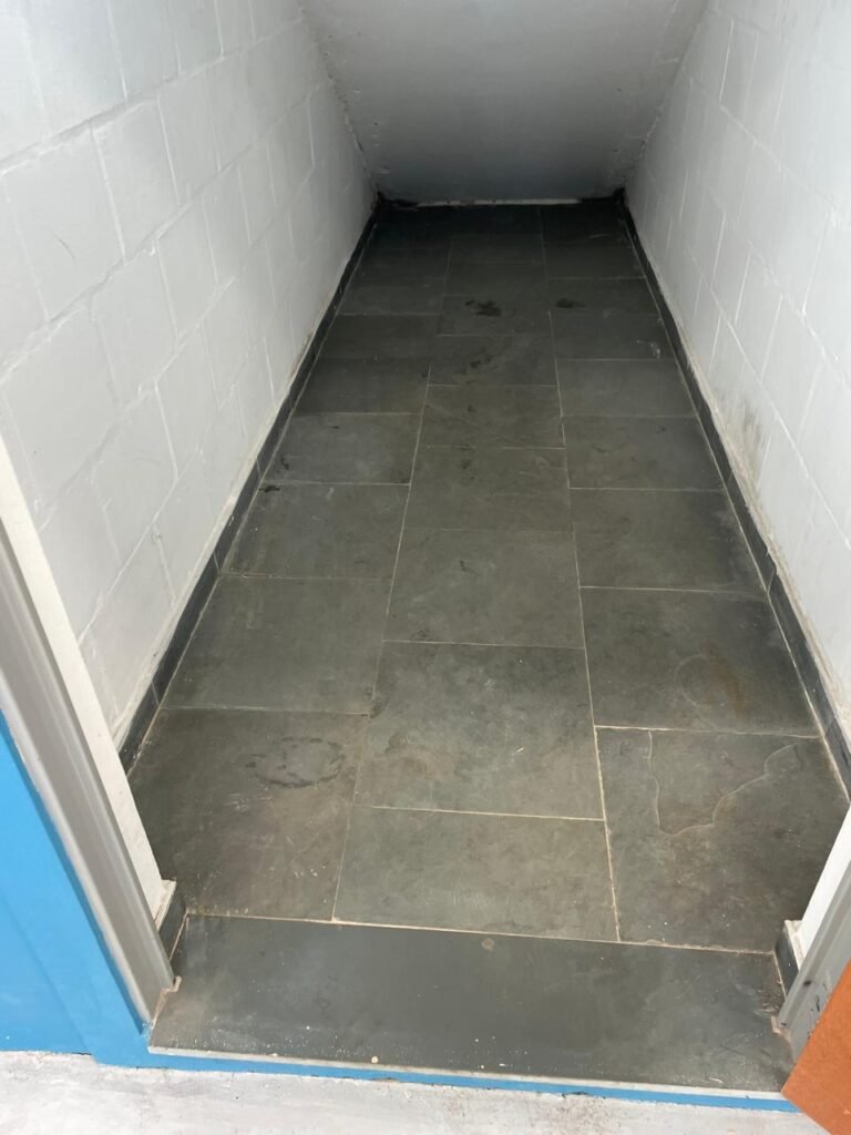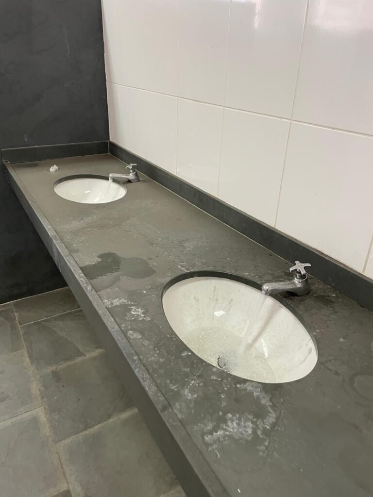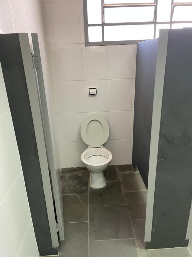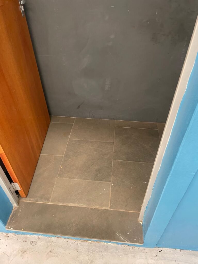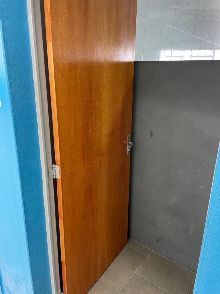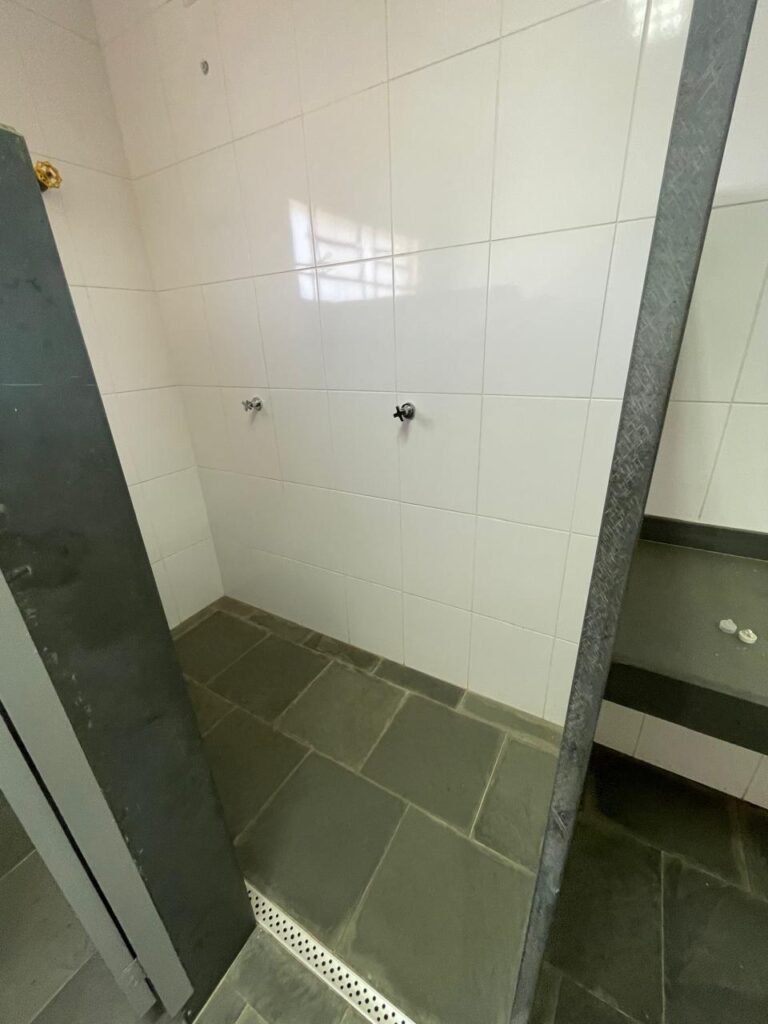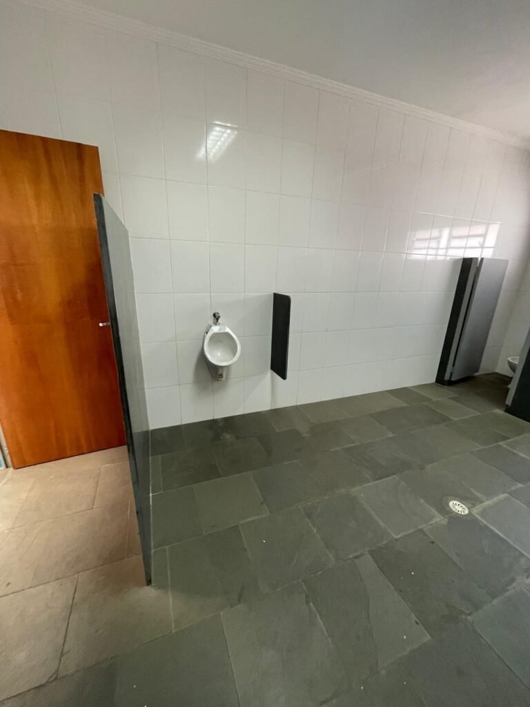 VESTIÁRIO-: 01 Porta social de madeira envernizada em ordem, com maçanetas em inox em ordem, fechadura simples marca Pado com chave em ordem, piso revestido de ardósia com desgastes naturais e restante em ordem, 01 ralo de plástico branco em ordem, 01 ralo grelha de ferro em ordem, parei investidas de azulejo com desgastes naturais em pequenos trincos restante em ordem, 06 divisórias em ardósia em ordem, pia em ardósia em ordem, 02 torneiras em inox em ordem, 02 sifões em ordem, 01 torneira de Jardim em ordem, 01 mictório de cerâmica cor branco, marca Icasa em ordem, descarga com válvula em inox em ordem, 02 vasos de cerâmica cor branco marca Deca, ambos com tampa e assento com desgastes naturais, válvula de descarga Hydra em ordem em ambas, 02 canoplas em inox de chuveiros, 01 canopla Deca de registro, 01 vitrô basculante com esquadrias de ferro com pintura na cor cinza com desgastes naturais, 02 fechaduras em ordem, 12 vidros foscos com desgastes naturais e restante em ordem, 02 luminárias jateadas duplas com 02 lâmpadas tubulares com LED em ordem em cada, 03 espelhos de luz marca Tramontina, 01 interruptor e 02 espelhos cegos, teto com gola de gesso em ordem e pintura na cor branco neve em ordem.