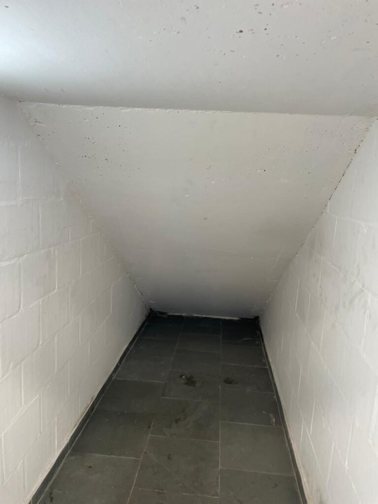 GARAGEM-: Piso de concreto desempenado com desgastes naturais e restante em ordem, muros laterais com pintura na cor branco neve com desgastes naturais e restante em ordem, rufos com pintura na cor branco e em ordem, fachada do Barracão com pintura na cor branco é branco neve com desgastes naturais e com descasques pela extensão, dígitos em ferro “5-8-6” em ordem, faixa da janela com detalhes da pintura na cor azul em ordem, 01 torneira de jardim em ordem, 01 canopla de registro marca Deca em ordem, 01 caixa de correspondência em ordem, 01 tampa de inspeção de plástico cor branco em ordem.