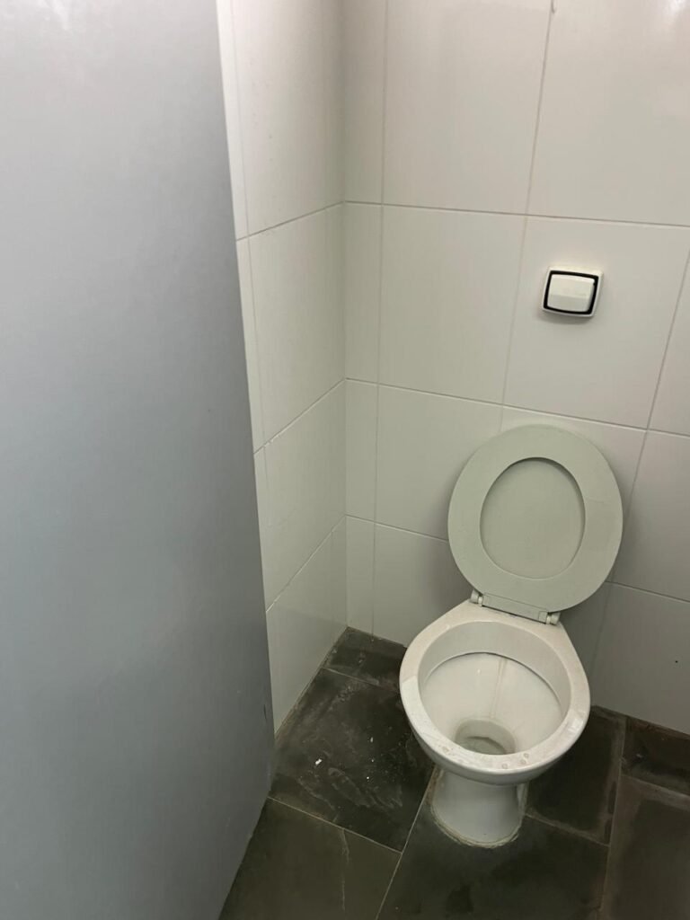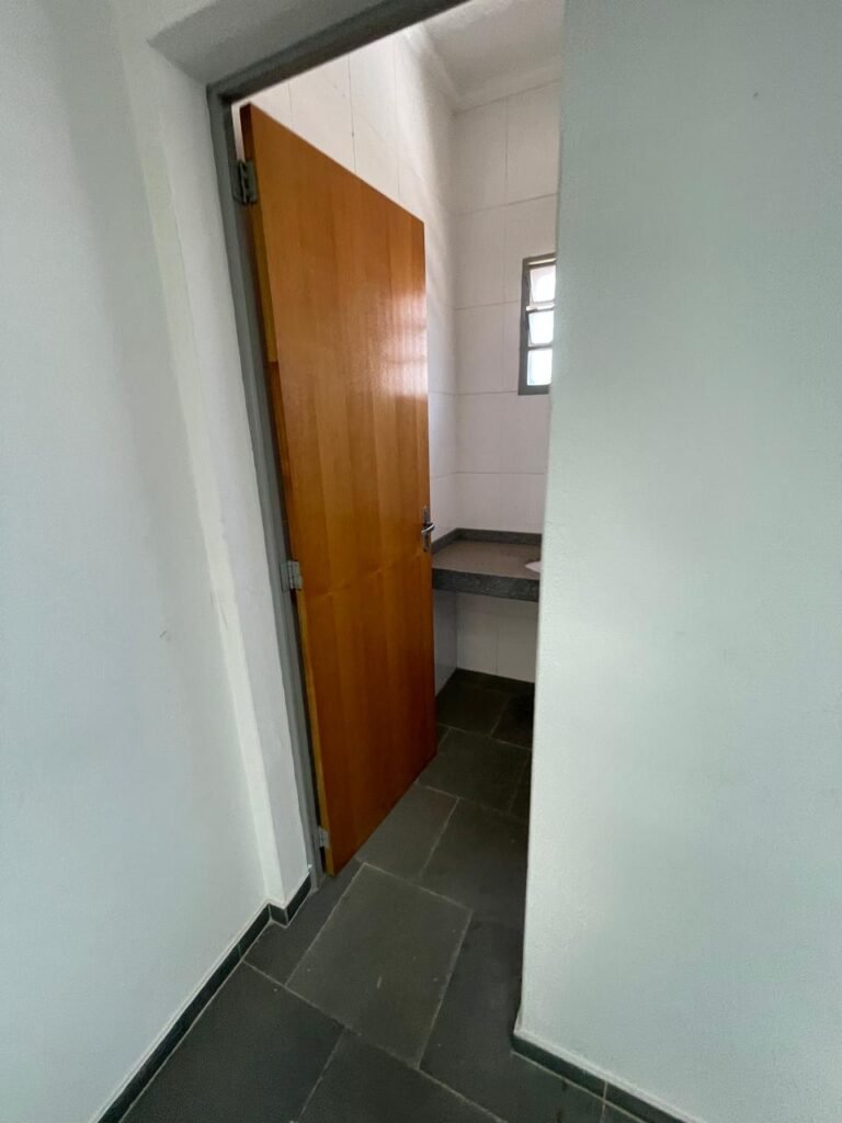 WC ESCRITÓRIO-: 01 porta social de madeira envernizada em ordem, com maçanetas em inox em ordem, com fechadura marca Pado com chave embutida em ordem, piso revestido em ardósia em ordem, 01 ralo de plástico cor branca em ordem, 01 vaso sanitário de cerâmica cor branco, marca Deca em ordem, com tampa e assento em ordem, válvula de descarga marca Hydra em ordem, pia de granito cinza ocre em ordem, cuba de cerâmica cor branco em ordem, 01 torneira em inox em ordem, 01 sifão sanfonado em ordem, 01 torneira de Jardim em ordem, 01 canopla de registro em ordem, 01 canopla de registro Deca em ordem, 01 espelho de luz marca Tramontina com 01 interruptor e 01 tomada, paredes com azulejo até o teto em ordem, 01 vitrô basculante com esquadria de ferro com pintura na cor cinza com desgastes naturais, com 01 fechadura em ordem e com 03 vidro foscos em ordem, 01 luminária prato com 01 lâmpada LED em ordem, teto com gola de gesso em ordem e com pintura na cor branco neve em ordem.