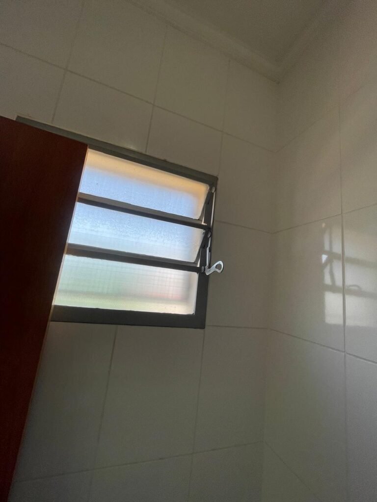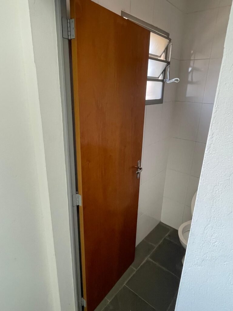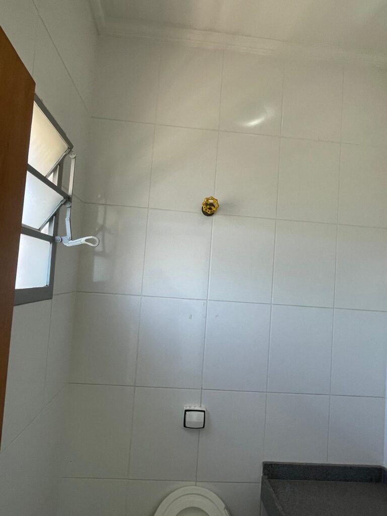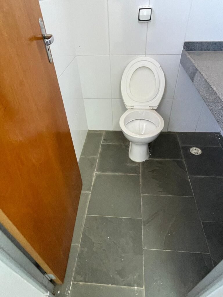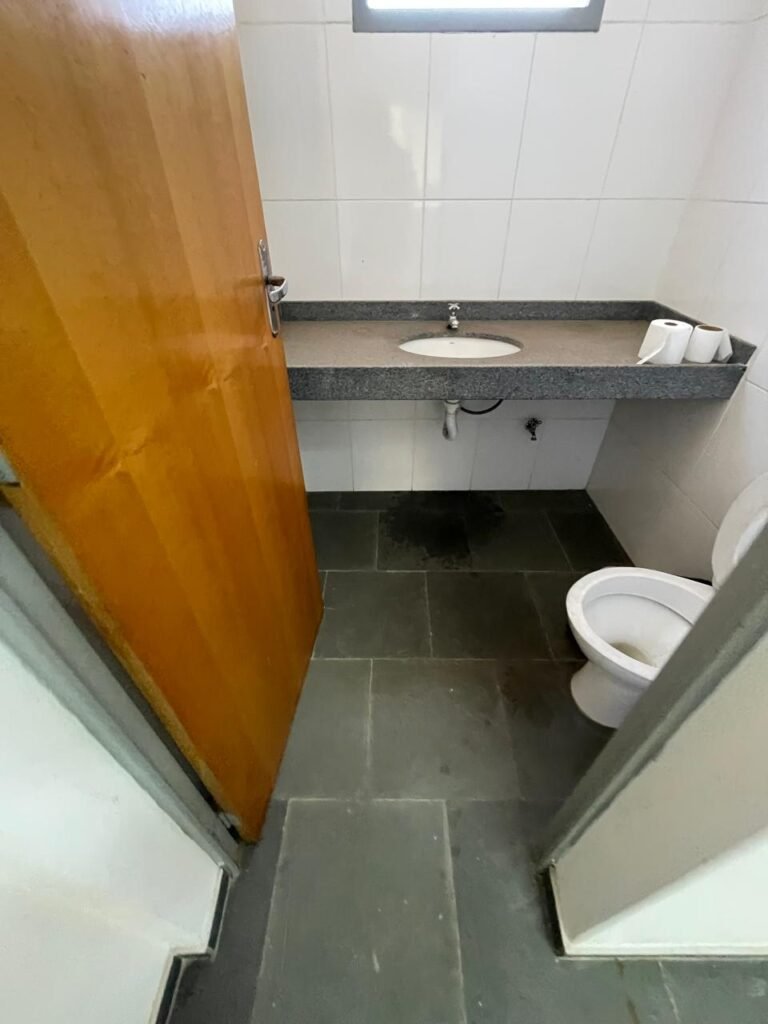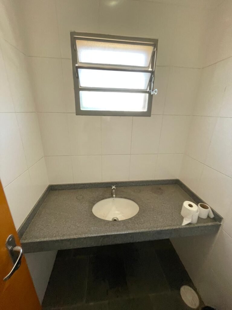 WC SALA SUPERIOR-: 01 porta de madeira envernizada em ordem, com maçanetas em inox em ordem, com fechadura marca Pado em ordem e com chave embutida, piso revestido em ardósia em ordem, 01 ralo de plástico cor branco, vaso sanitário de cerâmica cor branco marca Deca em ordem, contando bem acento com desgastes naturais e restante em ordem, válvula de descarga Hydra com vazamento, paredes revestidas de azulejo na cor branco em ordem, 01 espelho de luz marca Tramontina com 01 interruptor e01 tomada, 01 pia de granito cinza ocre em ordem, 01 cuba de cerâmica cor branco marca Deca em ordem, 01 torneira em inox em ordem, 01 sifão sanfonado com vazamento, 01 torneiro de Jardim em ordem, 01 canopla de registro Deca em ordem, 01 vitrô basculante com esquadrias de ferro com pintura na cor cinza com desgastes naturais, com 01 fechadura em ordem e03 vidros foscos com manchas de tinta e restante em ordem, 01 canopla de registro marca Deca, teto com gola de gesso em ordem e com pintura na cor branco neve em ordem, 01 luminária prato com lâmpada LED em ordem.