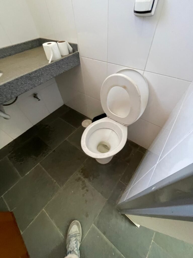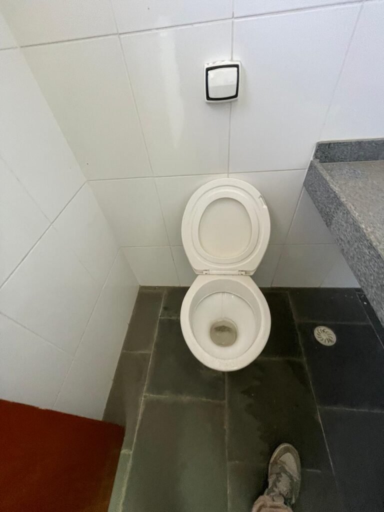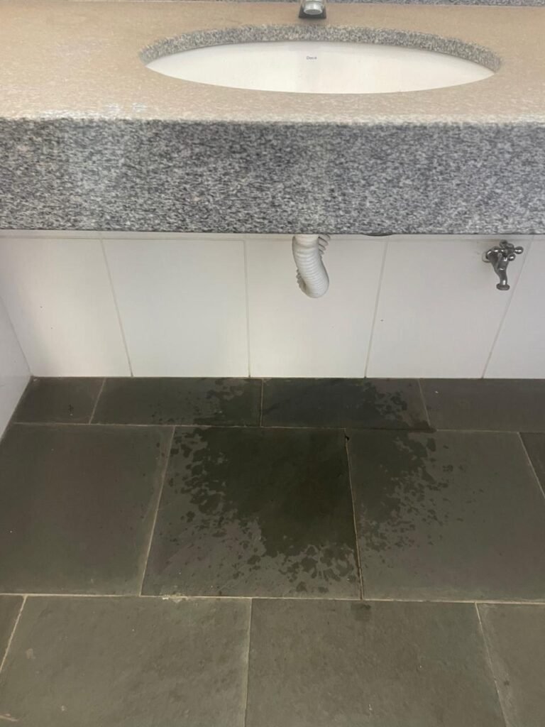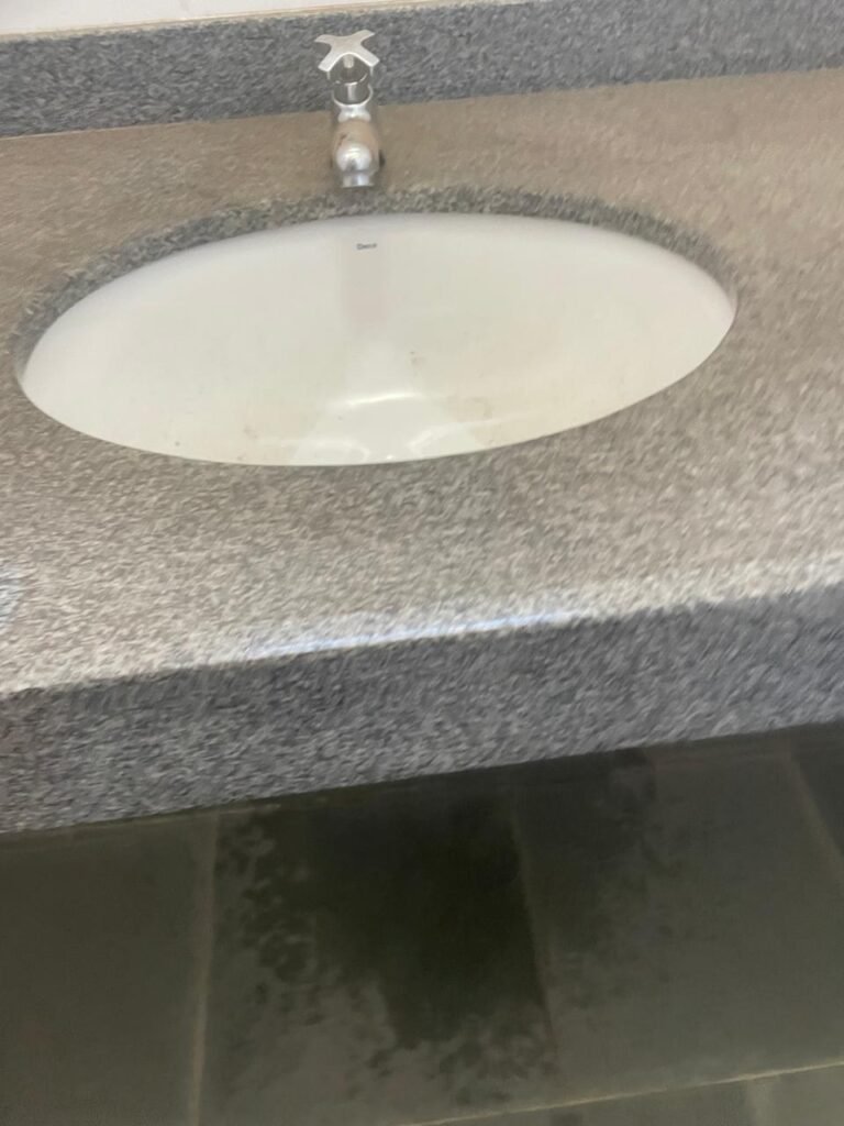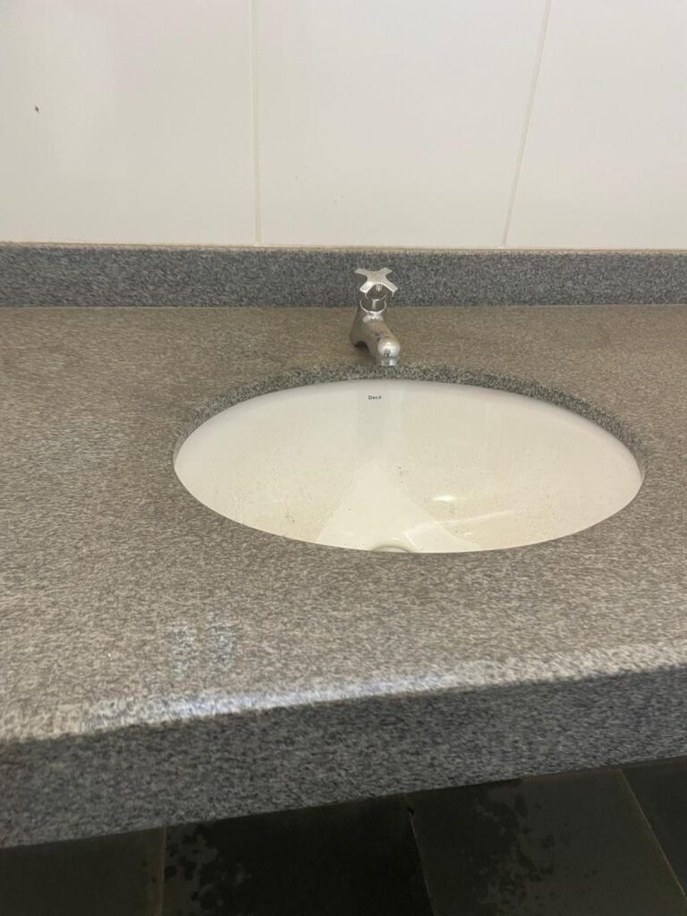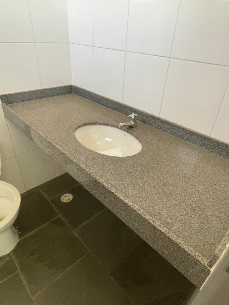 WC SALA SUPERIOR-: 01 porta de madeira envernizada em ordem, com maçanetas em inox em ordem, com fechadura marca Pado em ordem e com chave embutida, piso revestido em ardósia em ordem, 01 ralo de plástico cor branco, vaso sanitário de cerâmica cor branco marca Deca em ordem, contando bem acento com desgastes naturais e restante em ordem, válvula de descarga Hydra com vazamento, paredes revestidas de azulejo na cor branco em ordem, 01 espelho de luz marca Tramontina com 01 interruptor e01 tomada, 01 pia de granito cinza ocre em ordem, 01 cuba de cerâmica cor branco marca Deca em ordem, 01 torneira em inox em ordem, 01 sifão sanfonado com vazamento, 01 torneiro de Jardim em ordem, 01 canopla de registro Deca em ordem, 01 vitrô basculante com esquadrias de ferro com pintura na cor cinza com desgastes naturais, com 01 fechadura em ordem e03 vidros foscos com manchas de tinta e restante em ordem, 01 canopla de registro marca Deca, teto com gola de gesso em ordem e com pintura na cor branco neve em ordem, 01 luminária prato com lâmpada LED em ordem.