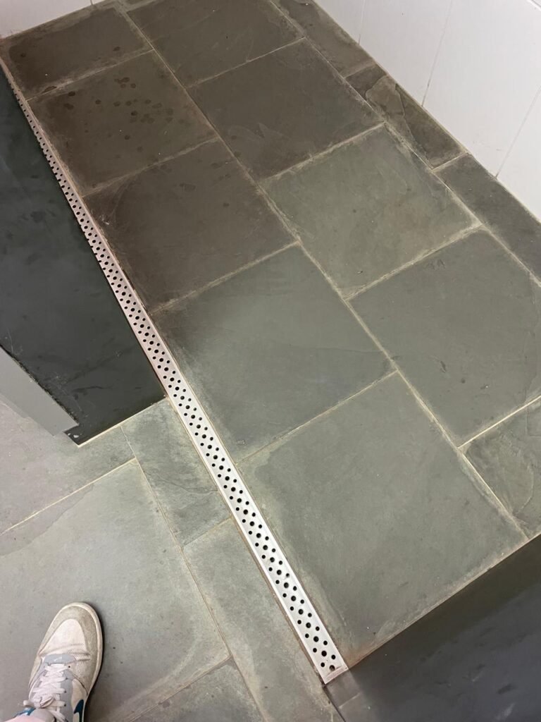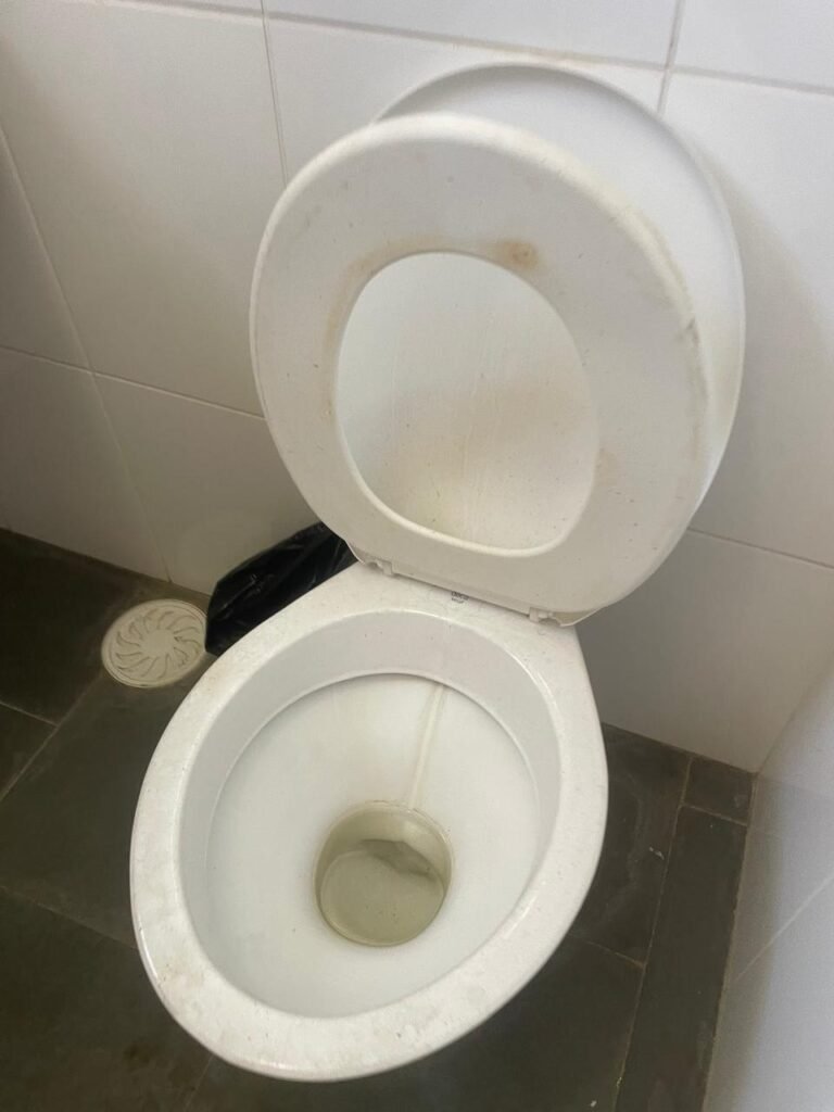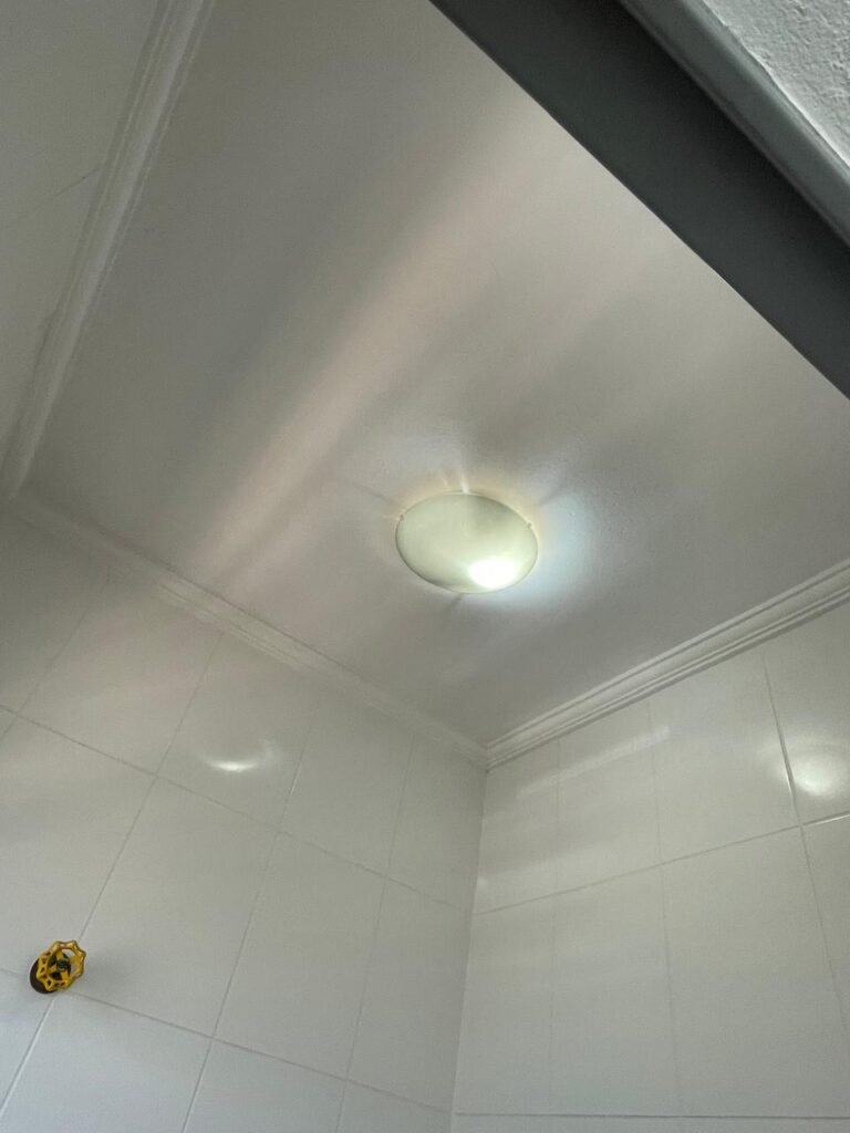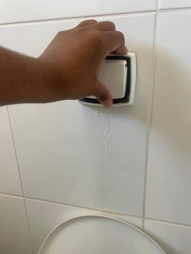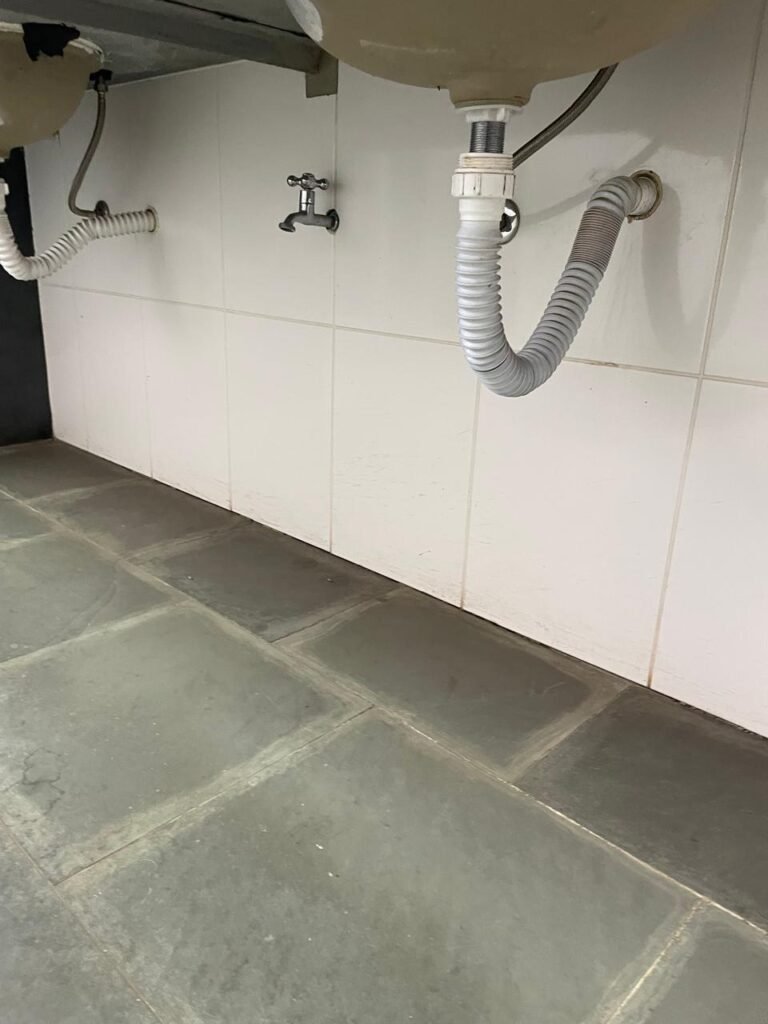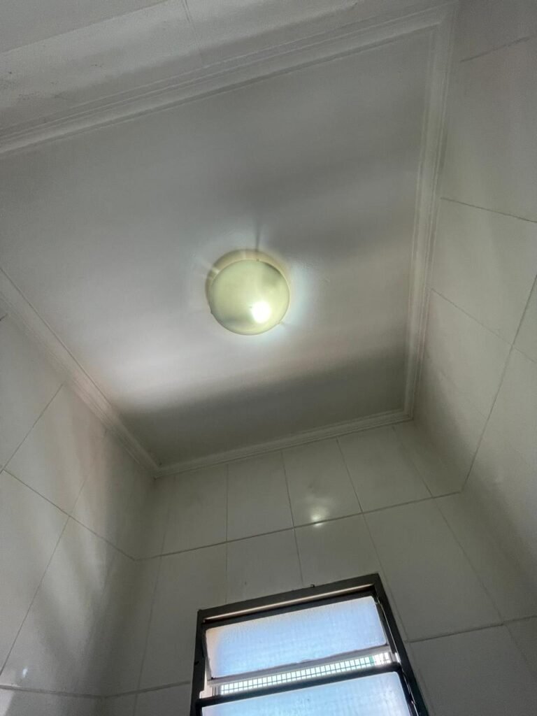 WC SALA SUPERIOR-: 01 porta de madeira envernizada em ordem, com maçanetas em inox em ordem, com fechadura marca Pado em ordem e com chave embutida, piso revestido em ardósia em ordem, 01 ralo de plástico cor branco, vaso sanitário de cerâmica cor branco marca Deca em ordem, contando bem acento com desgastes naturais e restante em ordem, válvula de descarga Hydra com vazamento, paredes revestidas de azulejo na cor branco em ordem, 01 espelho de luz marca Tramontina com 01 interruptor e01 tomada, 01 pia de granito cinza ocre em ordem, 01 cuba de cerâmica cor branco marca Deca em ordem, 01 torneira em inox em ordem, 01 sifão sanfonado com vazamento, 01 torneiro de Jardim em ordem, 01 canopla de registro Deca em ordem, 01 vitrô basculante com esquadrias de ferro com pintura na cor cinza com desgastes naturais, com 01 fechadura em ordem e03 vidros foscos com manchas de tinta e restante em ordem, 01 canopla de registro marca Deca, teto com gola de gesso em ordem e com pintura na cor branco neve em ordem, 01 luminária prato com lâmpada LED em ordem.