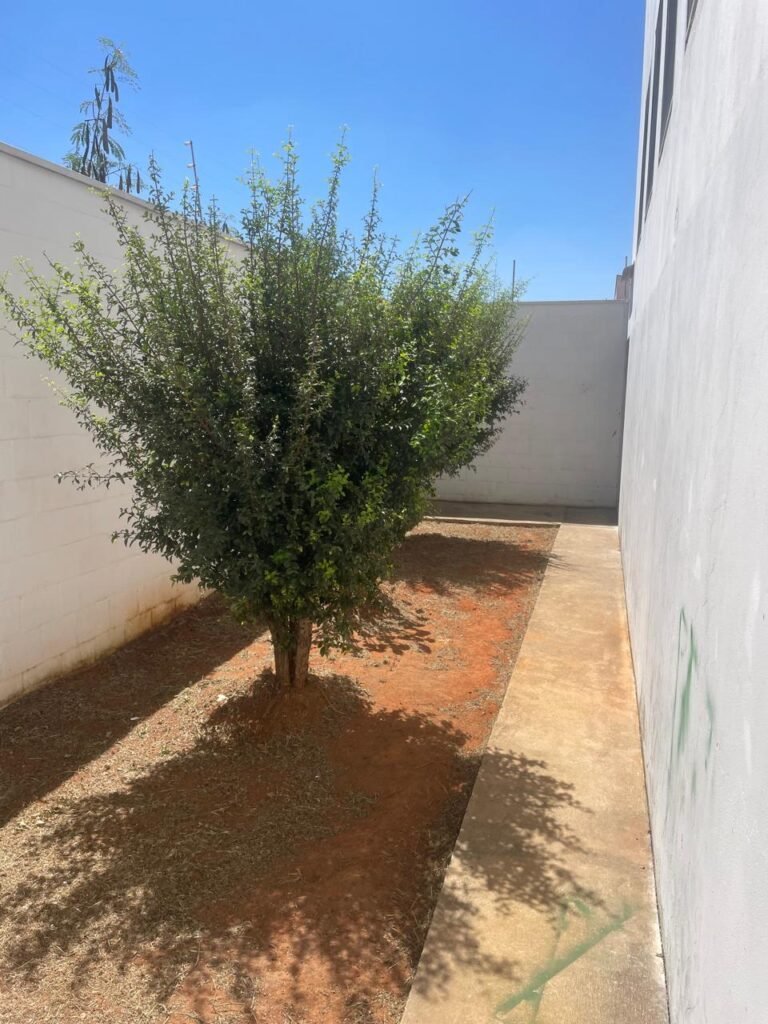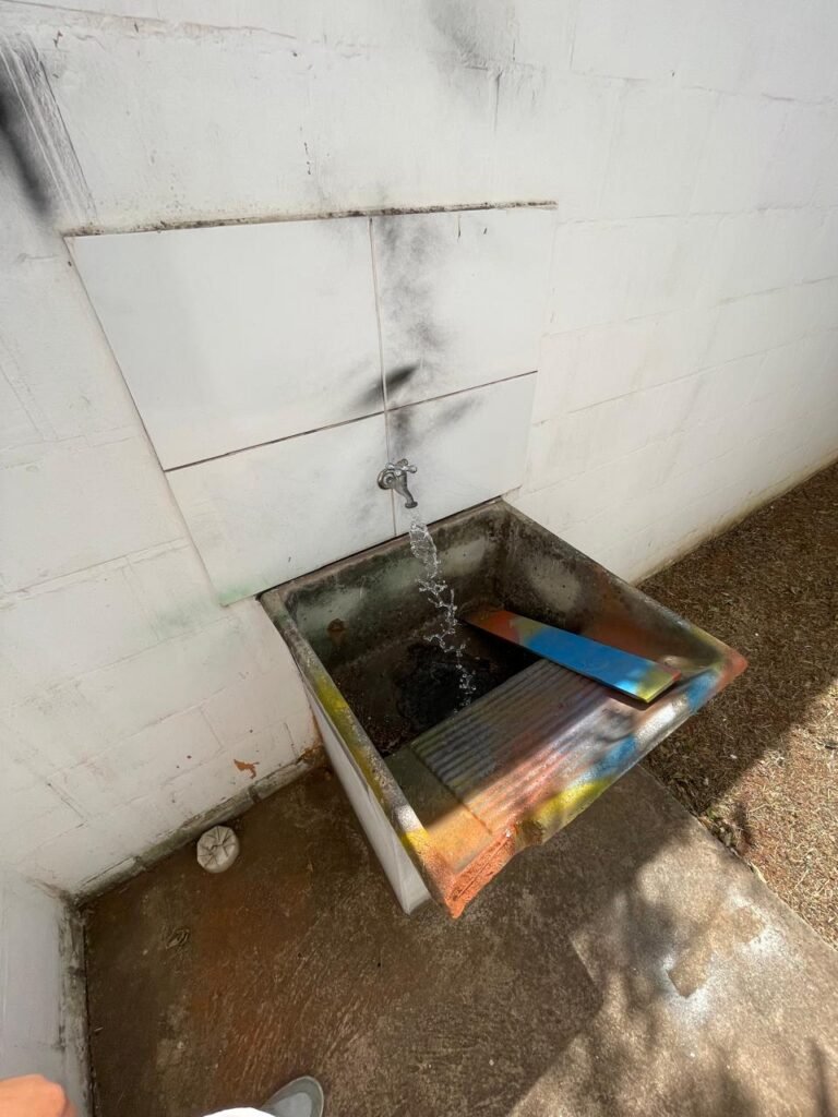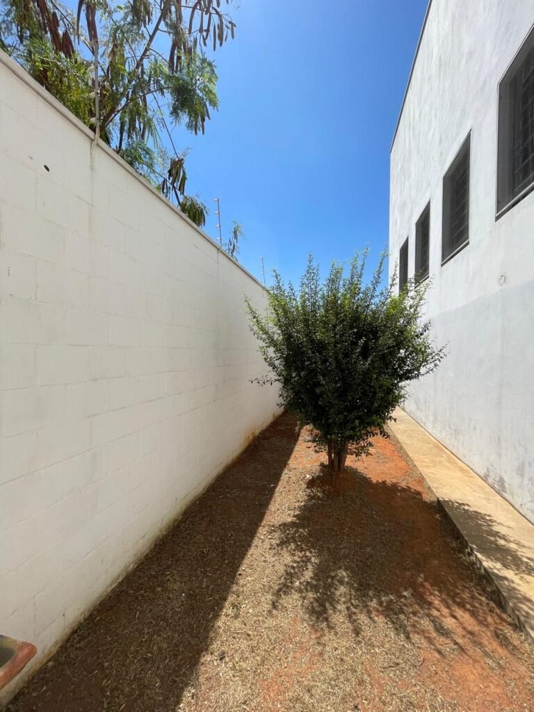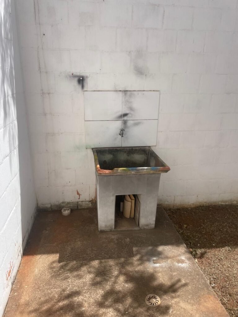 FUNDOS-: piso de concreto desempenado, zero um ralo de plástico branco, zero um tanque de alvenaria com torneira de inox e com ralo entupido, paredes com pintura na cor branco neve com desgastes naturais, cercado de cerca elétrica em ordem, 03 Árvores em ordem, 05 grades de proteções de ferro de janelas em ordem.