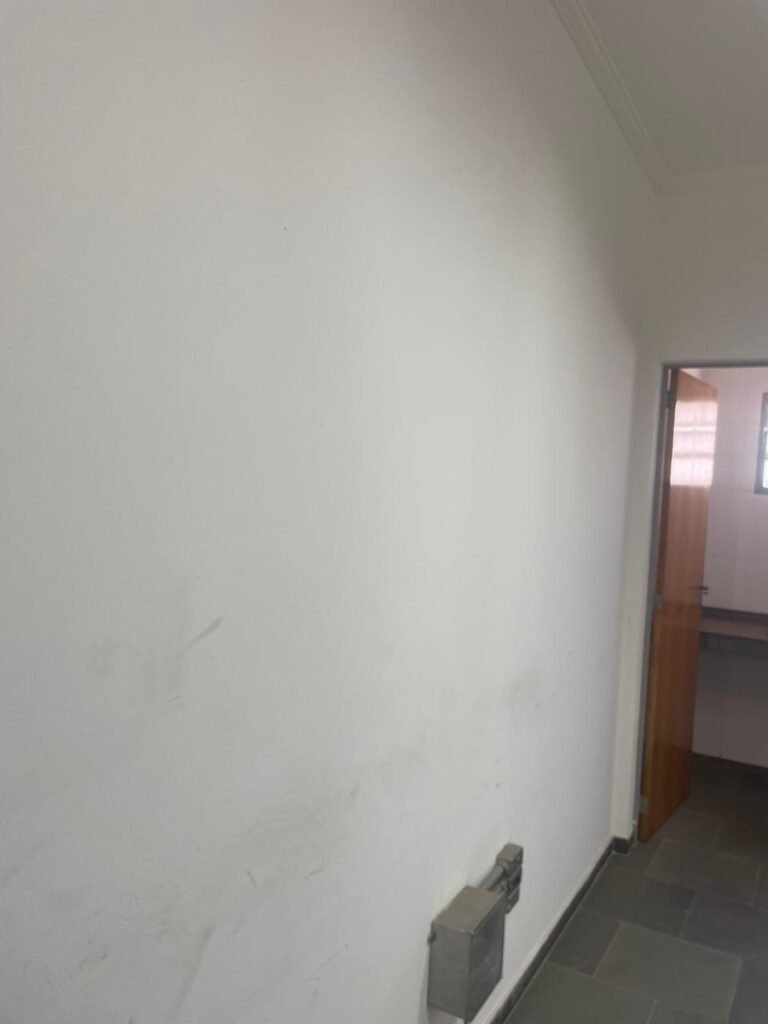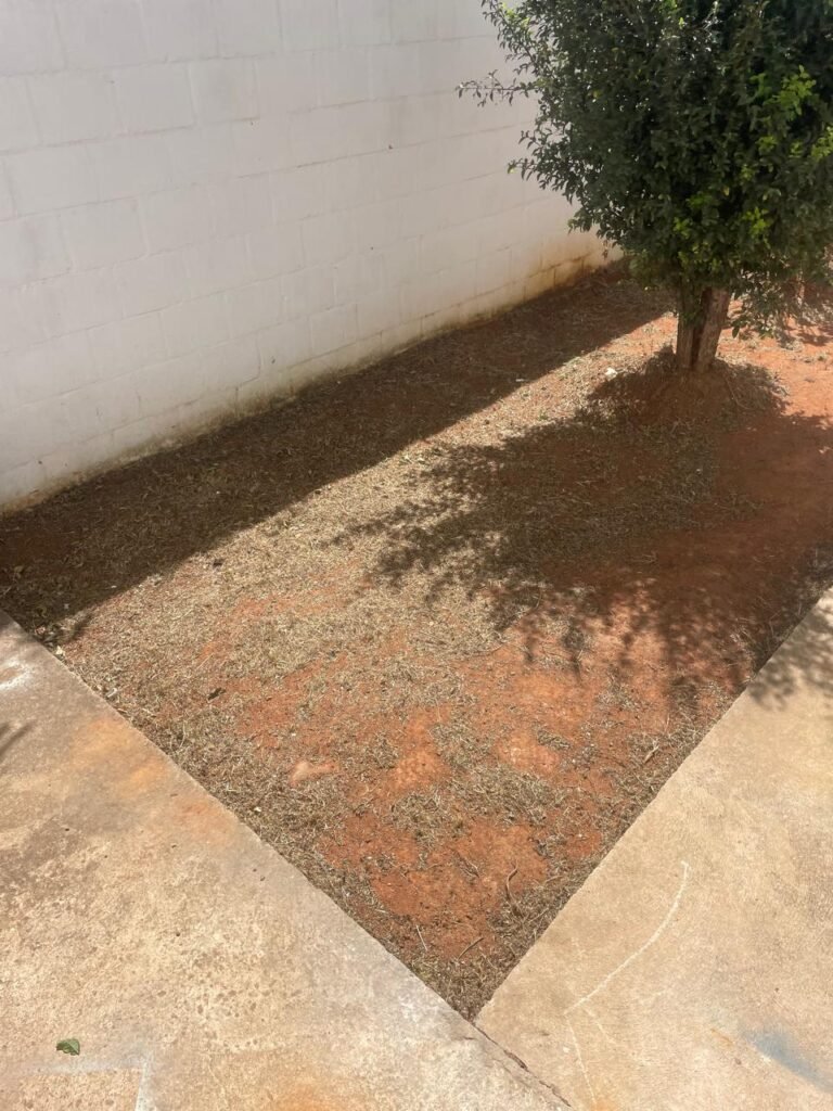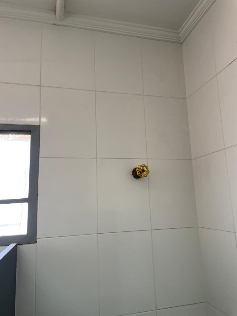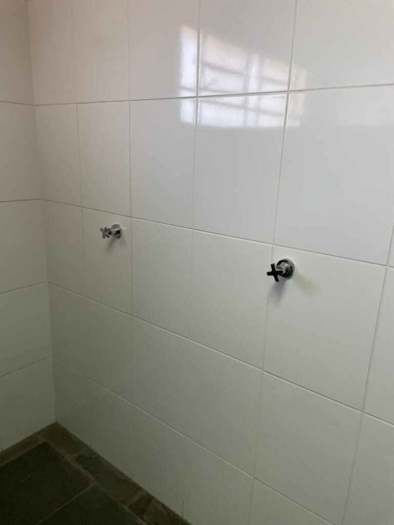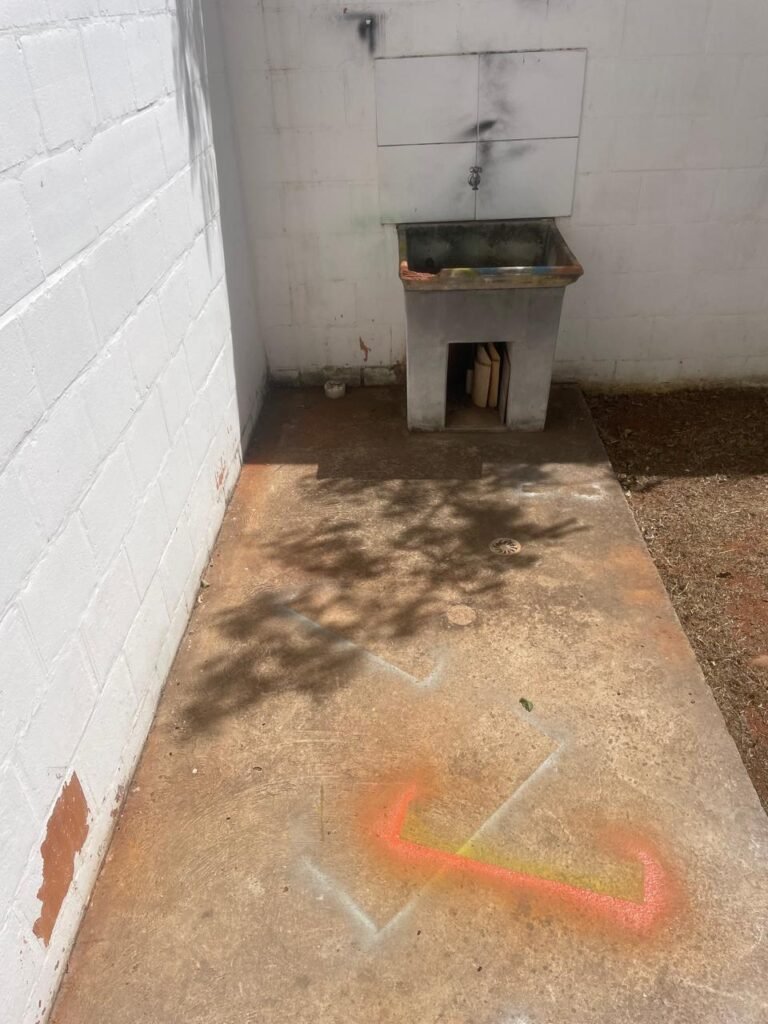 FUNDOS-: piso de concreto desempenado, zero um ralo de plástico branco, zero um tanque de alvenaria com torneira de inox e com ralo entupido, paredes com pintura na cor branco neve com desgastes naturais, cercado de cerca elétrica em ordem, 03 Árvores em ordem, 05 grades de proteções de ferro de janelas em ordem.