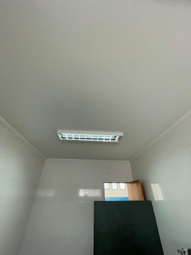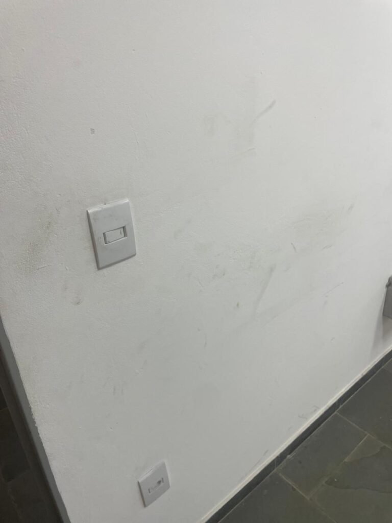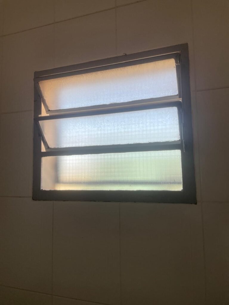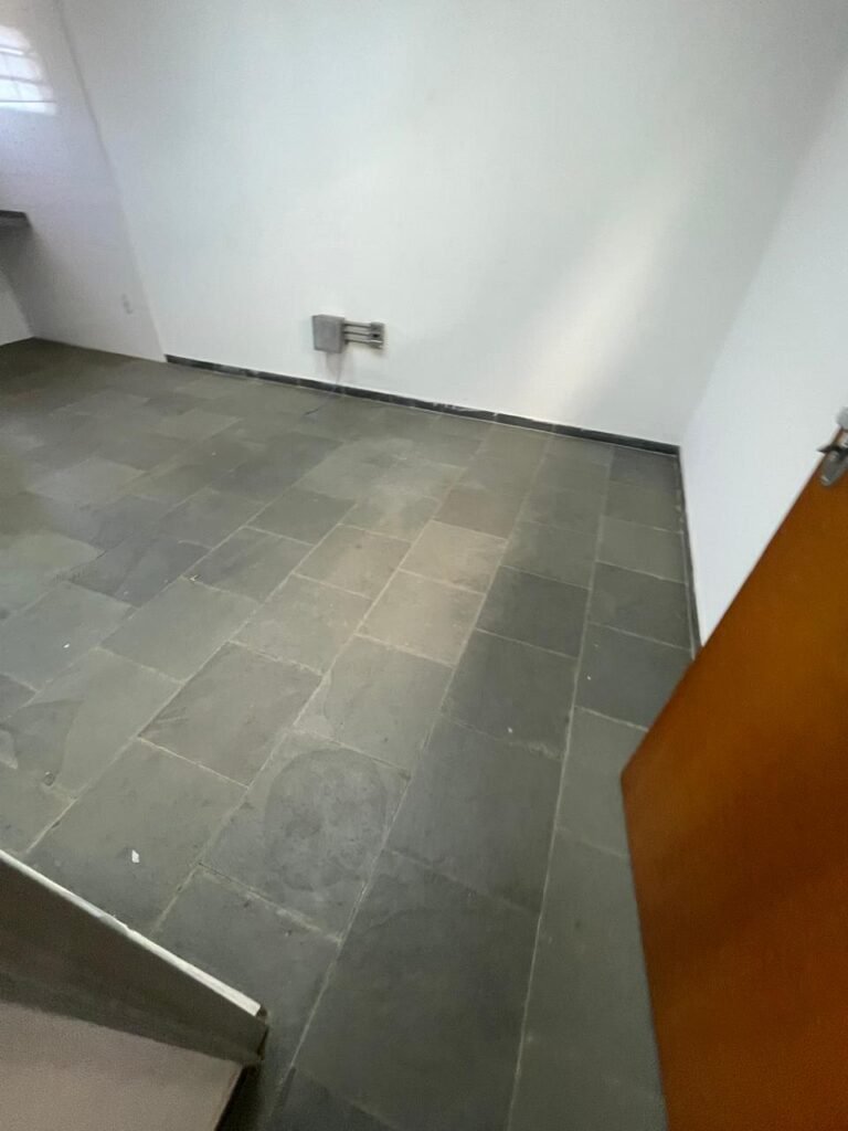 SALA SUPERIOR-: 01 porta social de madeira envernizada em ordem, com maçanetas de inox em ordem, com fechadura simples marcar Pado com chave em ordem, piso e rodapé revestido em ardósia com desgastes naturais restante em ordem, paredes com pintura na cor branco neve com manchas de sujeira e desgastes naturais, parte com paredes invertidas de azulejo na cor branco em ordem, 07 espelhos de luz marca Tramontina sendo eles: 02 espelhos com 01 interruptor e 05 espelhos com 01 tomada, 02 quadros de distribuição de energia (01 deles com cabo de internet à vista) e com 01 condulete para entrada de fio de dados, 01 condulete com 01 tomada e 01 condulete cego. Pia de granito cinza ocre em ordem, Cuba em inox em ordem, torneira em inox em ordem, 01 sifão sanfonado em ordem, 01 com a moto de registro Deca em ordem, 01.para ar condicionado em ordem, 01 janela deslizante marca Lucasa, com esquadrias de ferro com pintura na cor cinza com desgastes naturais, com 01 fechadura em ordem, com 20 vidros foscos com manchas de tinta e restante ordem, com gradil de ferro de proteção em ordem, 01 vitrô basculante com esquadrias de ferro com pintura na cor cinza com desgastes naturais, 01 fechadura em ordem e 03 vidros foscos com manchas de tinta e restante em ordem, 02 luminárias duplas jateadas ambas com 02 lâmpadas tubulares com LED em ordem, 01 luminária prato com 01 lâmpada de LED em ordem, teto com gola de gesso em ordem e com pintura na cor branco neve em ordem.