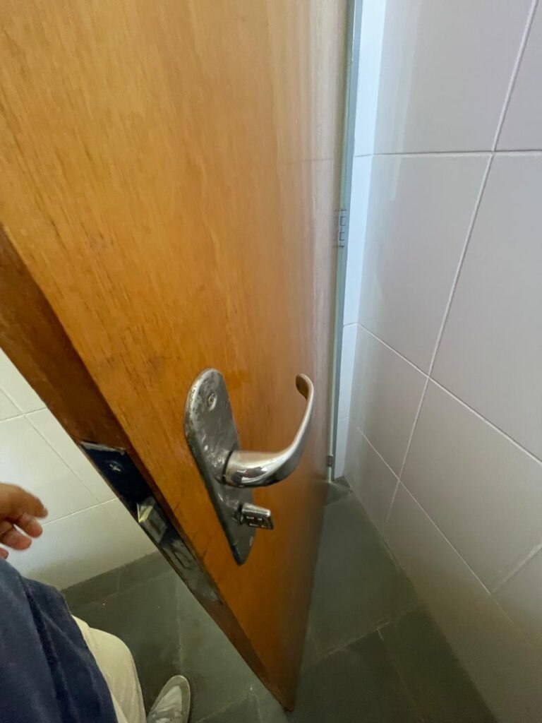 01 COMODO DESPENSA-: 01 Porta social de madeira em ordem, o maçaneta em inox em ordem, com fechadura simples marca Pado em ordem e sem chave, piso e rodapé vestido de ardósia com desgastes naturais e restante em ordem, paredes e teto com pintura na cor branco neve com desgastes naturais e com manchas pela extensão, 01 espelho de luz marca Tramontina com 01 interruptor, 01 luminária tartaruga com LED em ordem, 01 suporte de ferro com 05 ganchos.