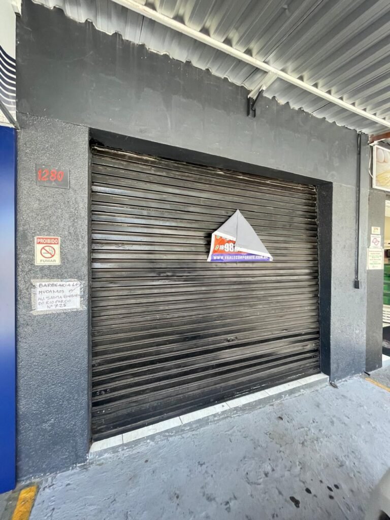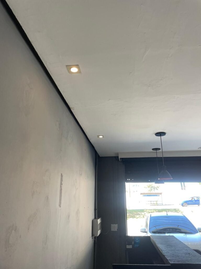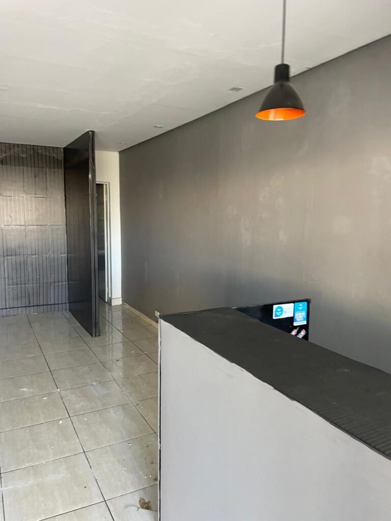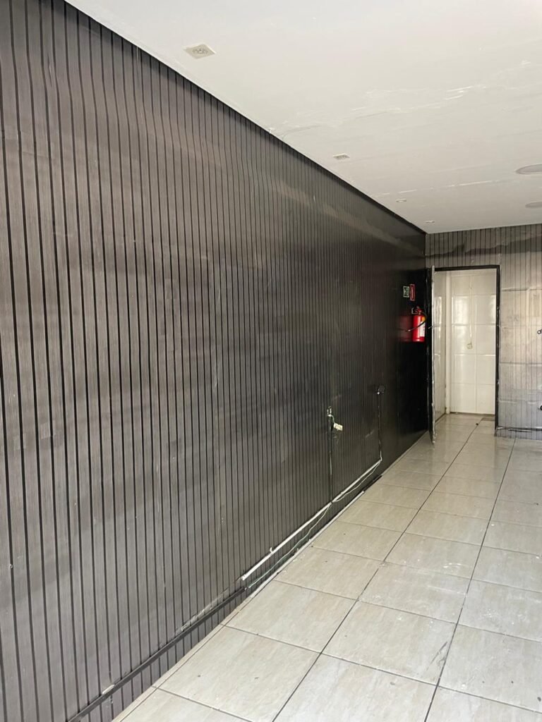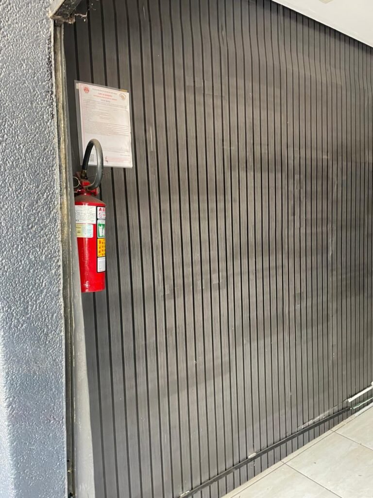 SALA-: 01 Porta ferro de enrolar com pintura na cor preto em ordem, com 02 fechaduras com chaves em ordem, e rodapé revestido de pisos frios cerâmicos com desgastes naturais, trincados e emendas pelas extensões, 01 balcão de drywall com MDF, com pintura na cor cinza com desgastes naturais, 01 parede com pintura na cor cinza em ordem, restante das paredes com papel de parede listrado na cor preto com desgastes naturais, 04 espelhos de luz em ordem sendo eles : 01 espelho com 06 interruptor, 01 espelho com 01 tomada e 02 espelhos cegos. 01 quadro de distribuição de disjuntores marca Brum, com tampa e em ordem, disjuntores Steck em ordem, 02 extintores de incêndio, sendo 01 com carga de pó químico 20-B:C 4kg e o outro 01 com carga de pó químico ABC 4kg 3-A, ambos com validade em dia, 02 luminárias pendentes sem lâmpadas, teto com forro de gesso e pintura na cor branco neve com desgastes naturais e restante em ordem, 10 spots (apenas 03 com lâmpadas em ordem), 02 luminárias plafon redondas embutidas (apenas 01 com lâmpada em ordem).
