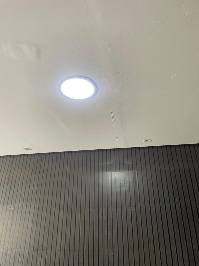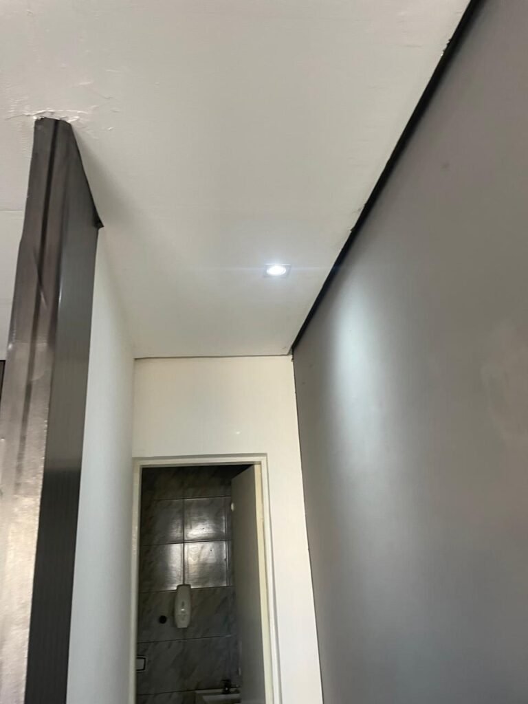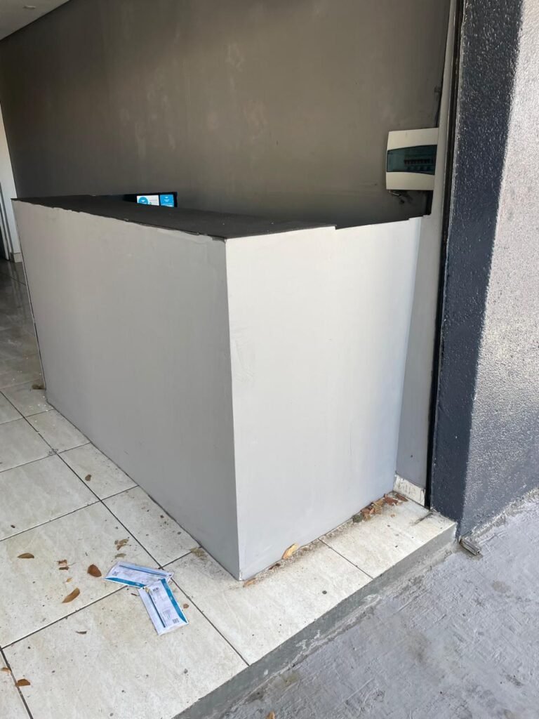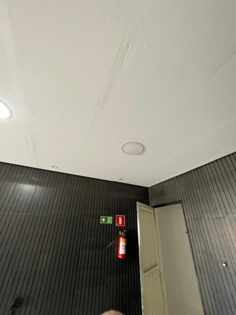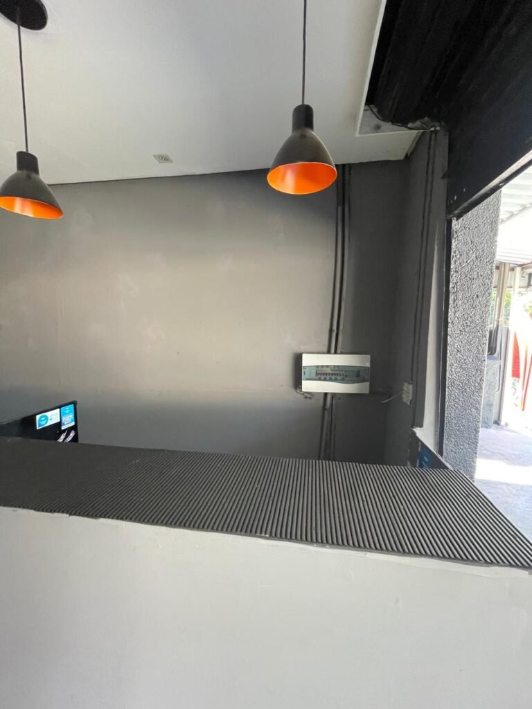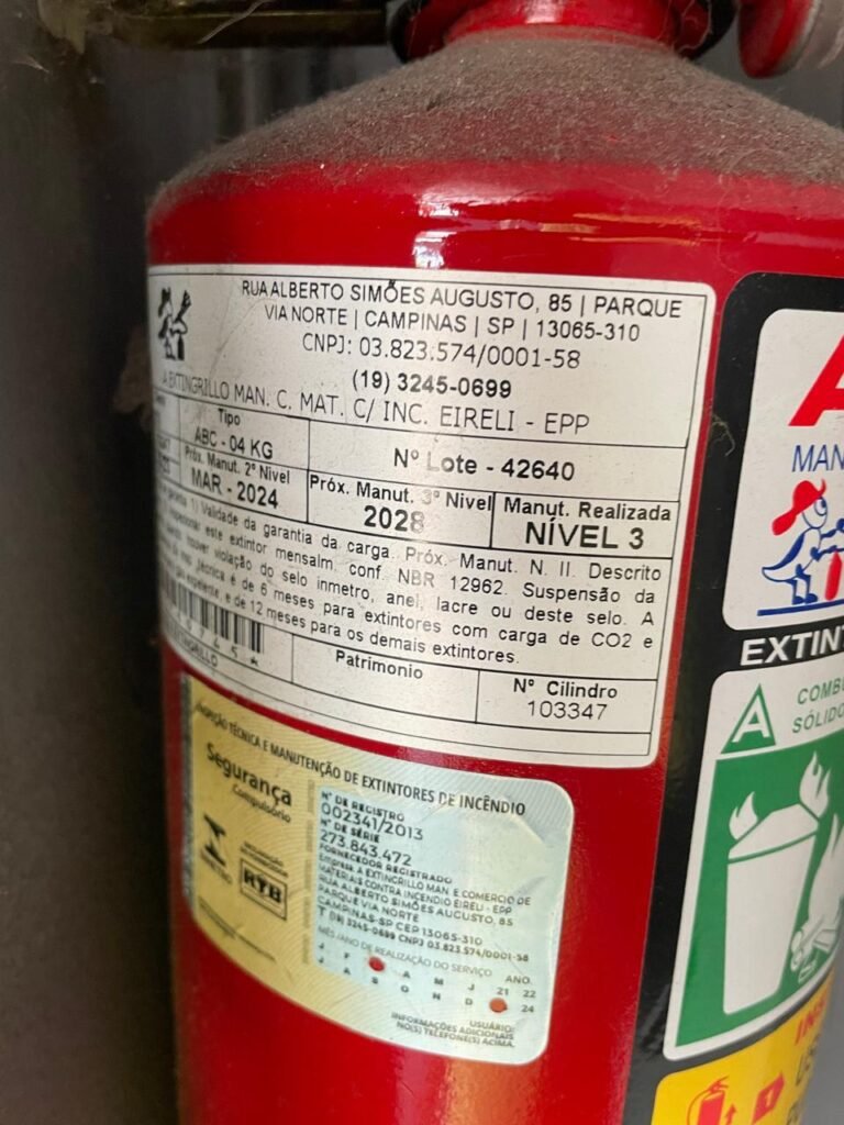 SALA-: 01 Porta ferro de enrolar com pintura na cor preto em ordem, com 02 fechaduras com chaves em ordem, e rodapé revestido de pisos frios cerâmicos com desgastes naturais, trincados e emendas pelas extensões, 01 balcão de drywall com MDF, com pintura na cor cinza com desgastes naturais, 01 parede com pintura na cor cinza em ordem, restante das paredes com papel de parede listrado na cor preto com desgastes naturais, 04 espelhos de luz em ordem sendo eles : 01 espelho com 06 interruptor, 01 espelho com 01 tomada e 02 espelhos cegos. 01 quadro de distribuição de disjuntores marca Brum, com tampa e em ordem, disjuntores Steck em ordem, 02 extintores de incêndio, sendo 01 com carga de pó químico 20-B:C 4kg e o outro 01 com carga de pó químico ABC 4kg 3-A, ambos com validade em dia, 02 luminárias pendentes sem lâmpadas, teto com forro de gesso e pintura na cor branco neve com desgastes naturais e restante em ordem, 10 spots (apenas 03 com lâmpadas em ordem), 02 luminárias plafon redondas embutidas (apenas 01 com lâmpada em ordem).