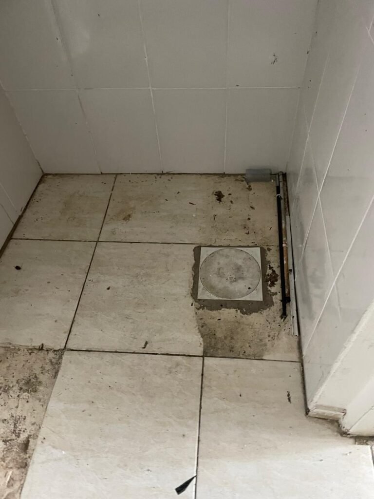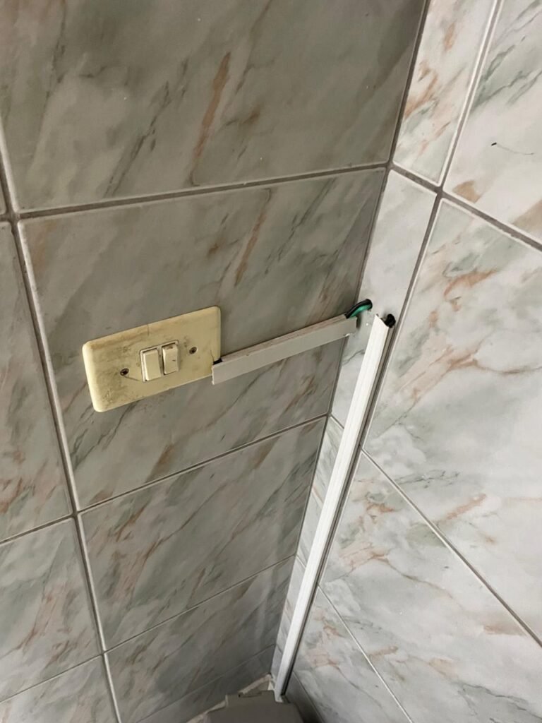 DESPENSA-: 01 porta de ferro com revestimento de papel listrado na cor preta e com desgastes naturais, com 01 fechadura ferrolho em ordem, fiz o revestido de pisos frios cerâmicos com desgastes naturais, 01 piso faltando, paredes revestidas de azulejo, 02 espelhos de luz, 01 com 01 tomada e 01 com 01 tomada e 01 interruptor. 01 bocal sem lâmpada, teto com forro de PVC com desgastes naturais.
