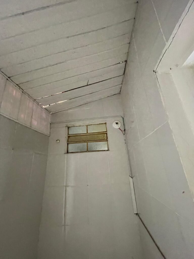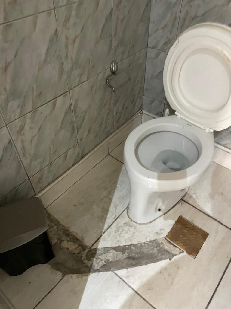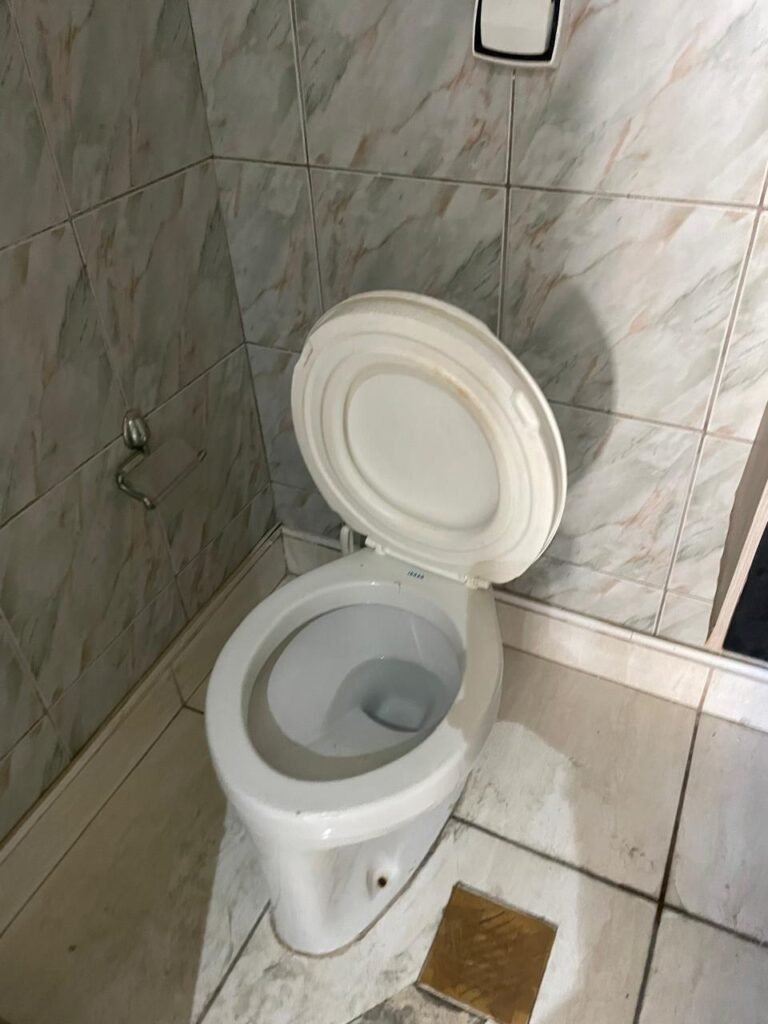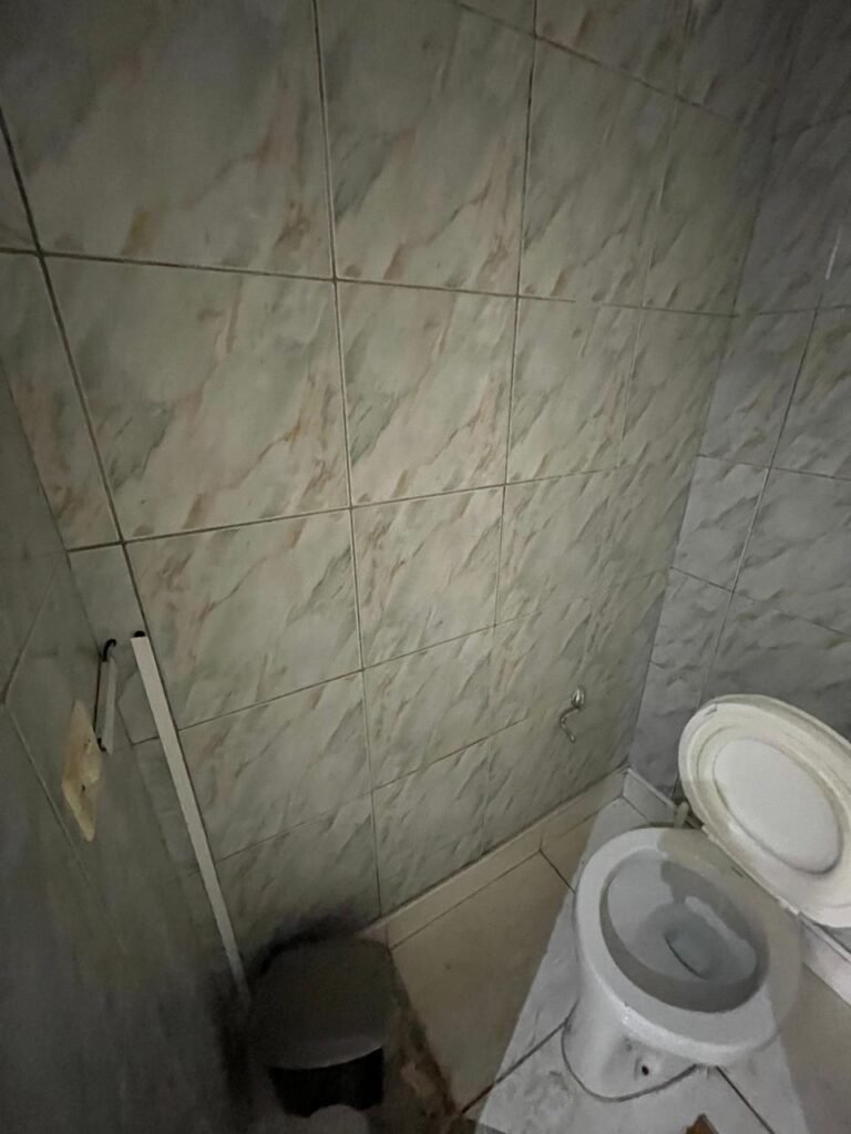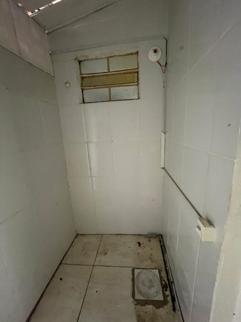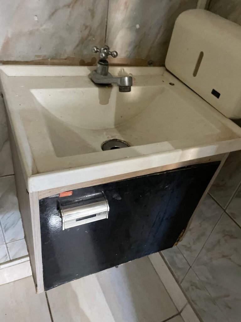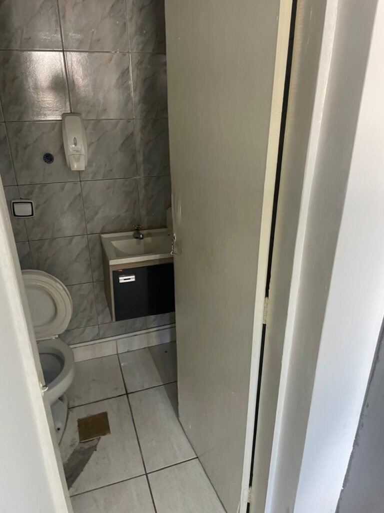 WC-: 01 porta de madeira com pintura na cor branco com desgastes naturais, fechadura com gancho em ordem, 01 fechadura ferrolho em ordem, piso e rodapé revestido detritos frios cerâmicos com desgastes naturais e restante em ordem, zero um ralo de plástico cor branco interditado, paredes revestidas de pisos cerâmicos até o teto com desgastes naturais e restante em ordem, 02 espelhos de luz, 01 com 02 interruptores, 01 vaso de cerâmica marca Icasa, na cor branco, com tampa e assento em ordem, 01 suporte de papel higiênico, 01 spot sem lâmpada, 01 gabinete com desgastes naturais, 01 torneira inox com desgastes naturais, 01 sifão sanfonado, 01 manopla de descarga em ordem, 02 suportes para toalhas de inox com desgastes naturais, 01 vitrô basculante com esquadrias de ferro, com 05 vidros canelados com desgastes naturais e com manchas de tinta, 02 suportes de varões em ordem, 01 suporte de sabonete líquido marca Premisse Velox em ordem, 01 manopla de registro em ordem, teto com pintura na cor branco neve com desgastes naturais e com manchas de infiltrações.