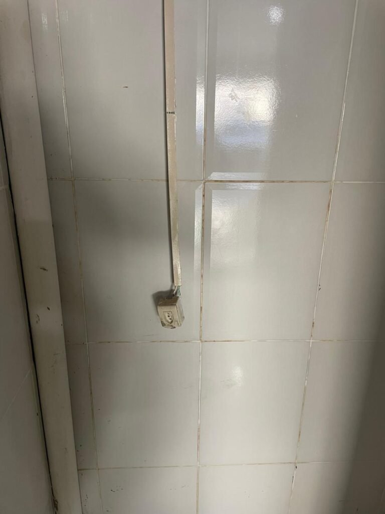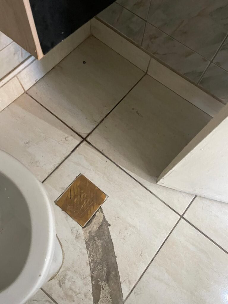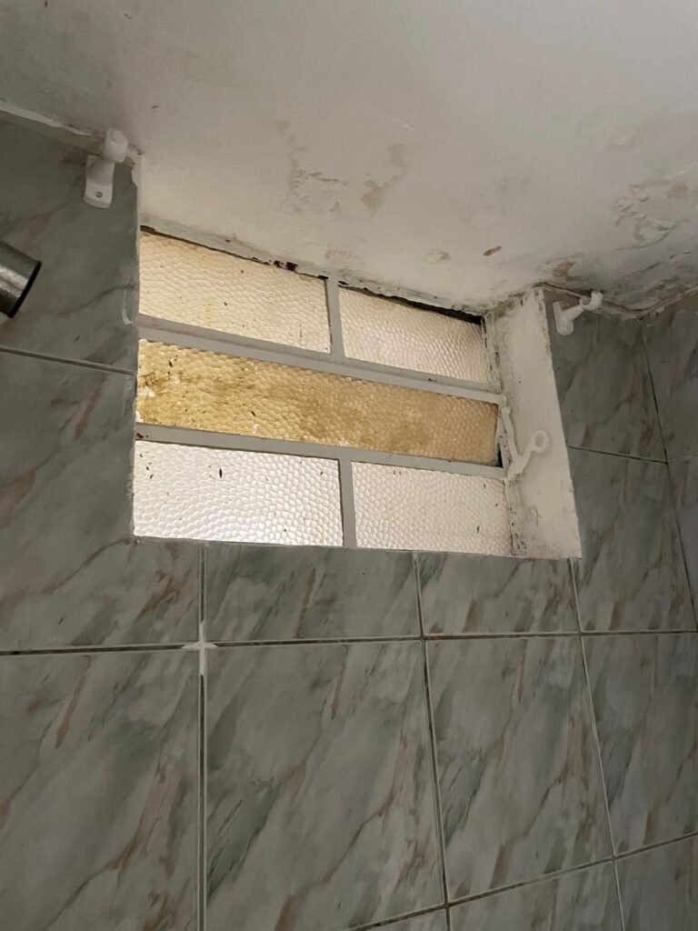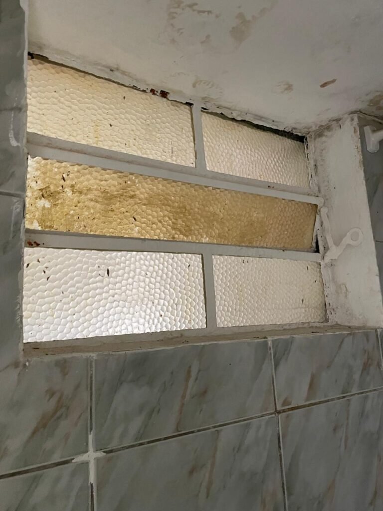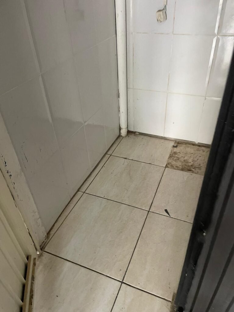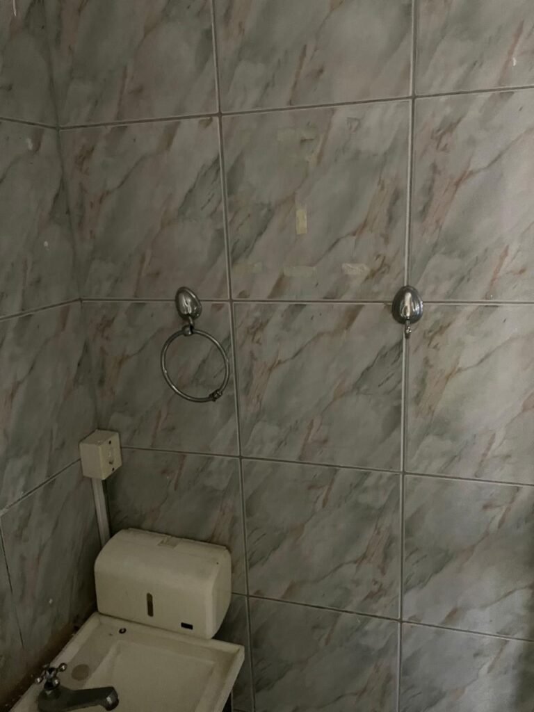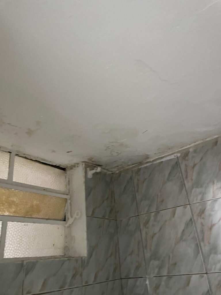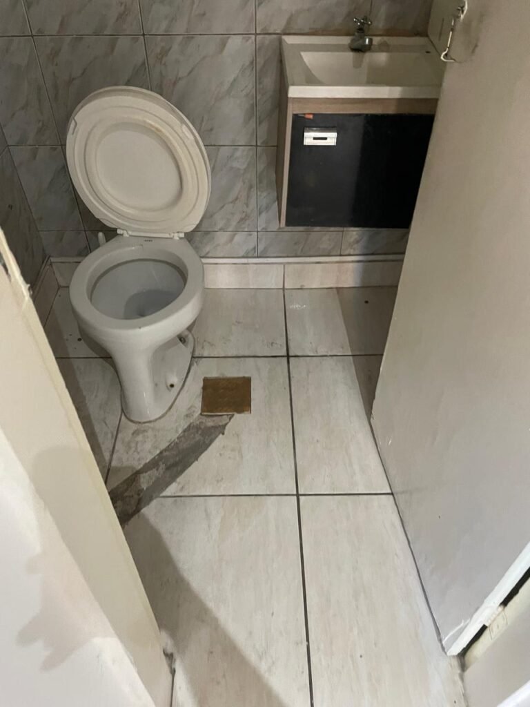 WC-: 01 porta de madeira com pintura na cor branco com desgastes naturais, fechadura com gancho em ordem, 01 fechadura ferrolho em ordem, piso e rodapé revestido detritos frios cerâmicos com desgastes naturais e restante em ordem, zero um ralo de plástico cor branco interditado, paredes revestidas de pisos cerâmicos até o teto com desgastes naturais e restante em ordem, 02 espelhos de luz, 01 com 02 interruptores, 01 vaso de cerâmica marca Icasa, na cor branco, com tampa e assento em ordem, 01 suporte de papel higiênico, 01 spot sem lâmpada, 01 gabinete com desgastes naturais, 01 torneira inox com desgastes naturais, 01 sifão sanfonado, 01 manopla de descarga em ordem, 02 suportes para toalhas de inox com desgastes naturais, 01 vitrô basculante com esquadrias de ferro, com 05 vidros canelados com desgastes naturais e com manchas de tinta, 02 suportes de varões em ordem, 01 suporte de sabonete líquido marca Premisse Velox em ordem, 01 manopla de registro em ordem, teto com pintura na cor branco neve com desgastes naturais e com manchas de infiltrações.