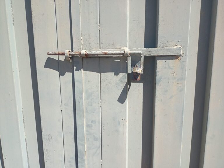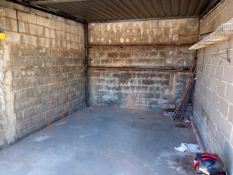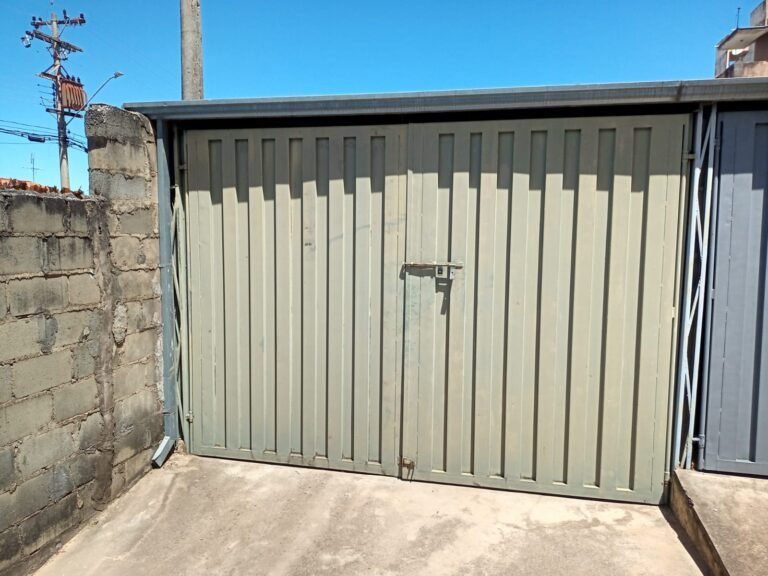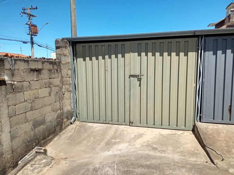 GARAGEM:- 01 Portão fechado com pintura antiga e desgastada na cor verde claro, 01 trinco com cadeado e chave em ordem, paredes de blocos aparentes em ordem.