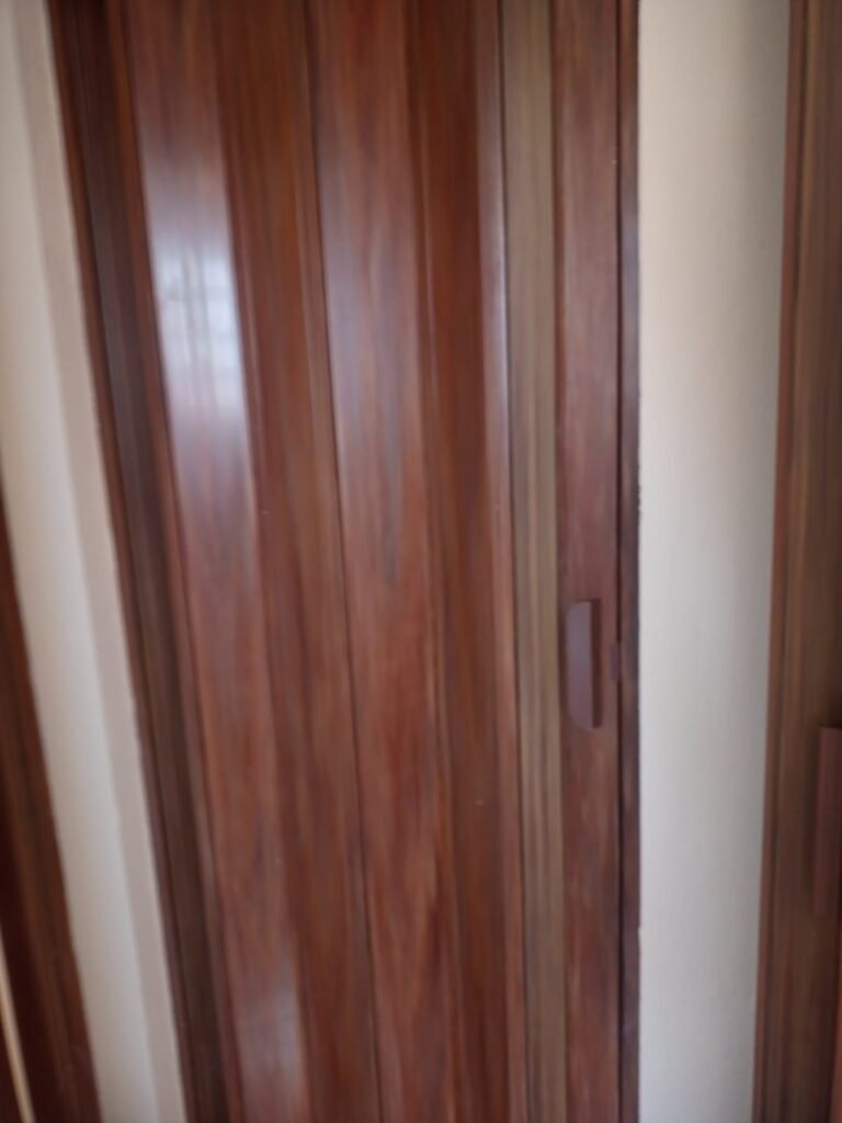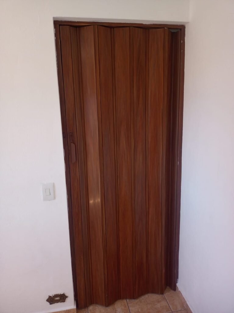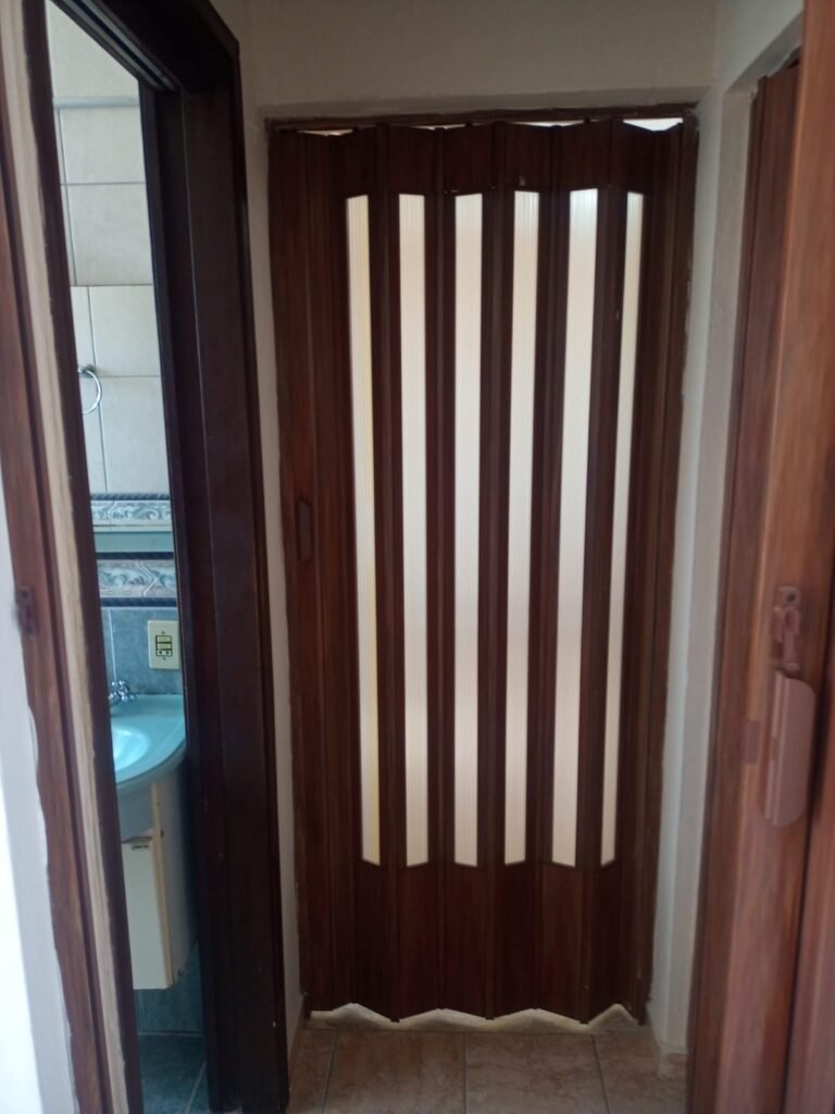 QUARTO 01:- 01 Porta sanfonada marrom em ordem, paredes e teto com pintura na cor branco em ordem, pisos e rodapés revestido de pisos frios cerâmico em ordem, 01 espelho de luz com interruptor em ordem, 02 tomadas em ordem, 01 janela com 06 vidros em ordem, fechadura da janela em ordem.
