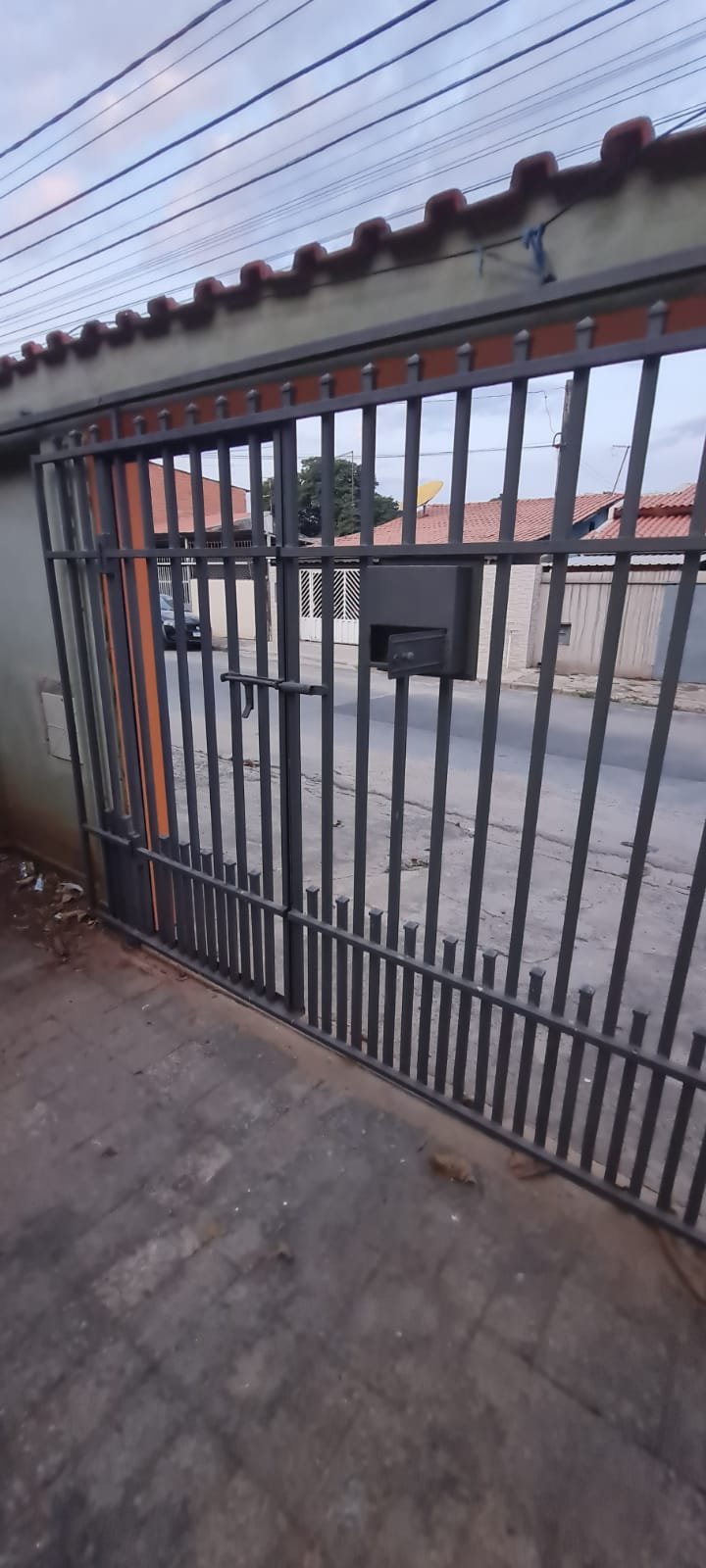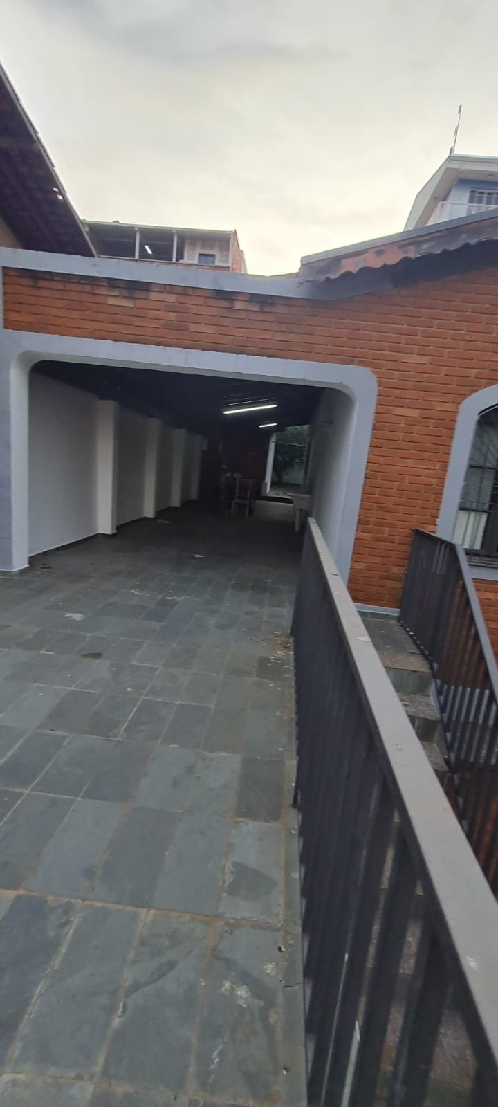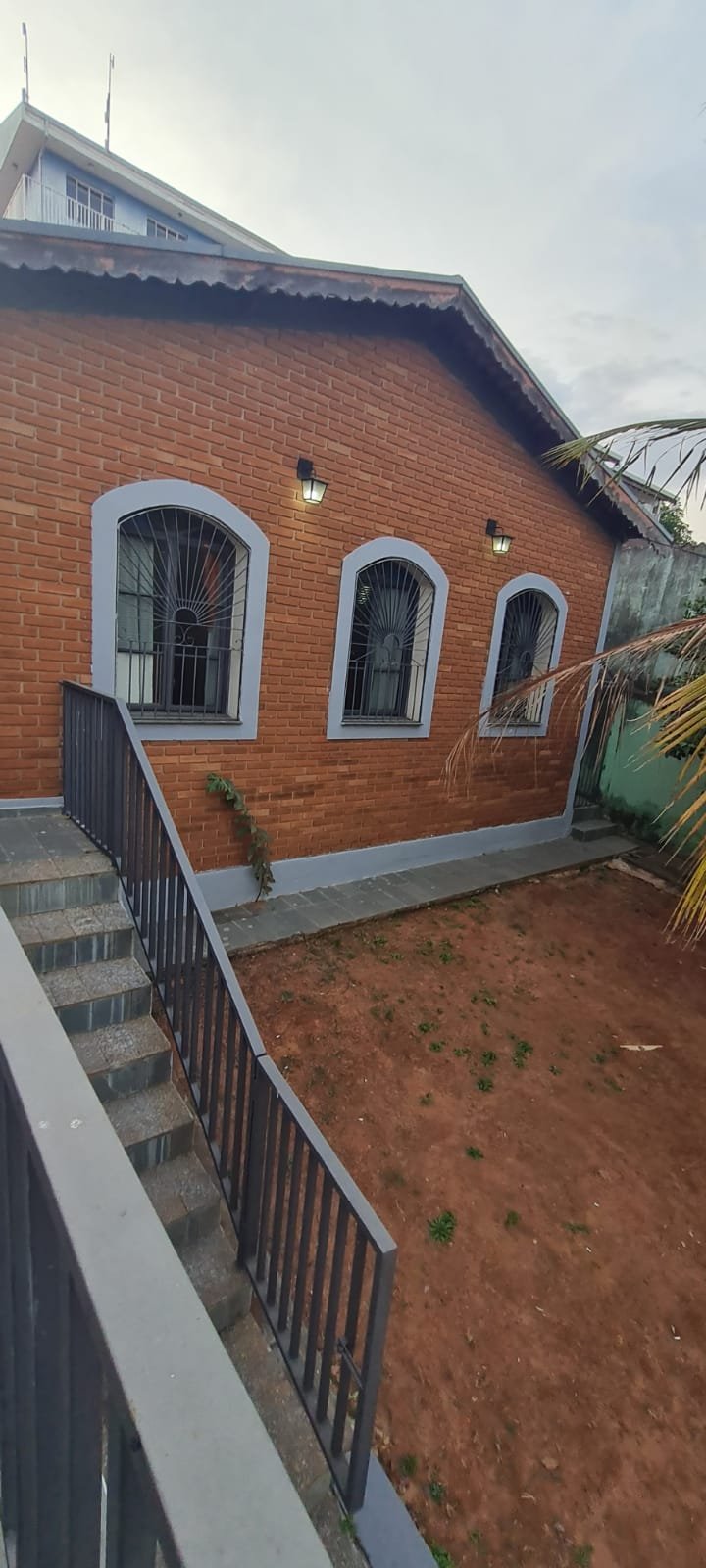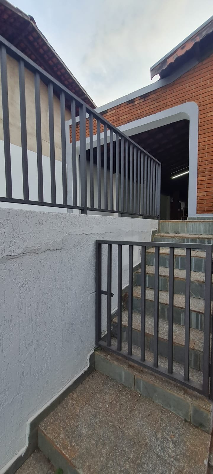 FACHADA:- Calçada com concreto com pequenos buracos, bueiro Sanasa com rachaduras o restante em ordem, muro com filetes recém-pintados de laranja em ordem, pintura na cor marrom com manchas e desgaste, restante em ordem, 01 interfone quebrado, 01 parelho de interfone em ordem, detalhes de telhas sendo 07 telhas romanas quebradas o restante em ordem, 01 portão de grade com a manutenção em ordem, portão social com fechadura cadeado em ordem, todos os portões com pintura na cor cinza com desgaste natural o restante em ordem, piso de ardósia na garagem e entrada da casa com desgaste natural do tempo o restante em ordem, paredes com a pintura na cor cinza recém-pintados em ordem, garagem para 02 veículos pequenos coberta parede na cor branco com sinais de desgaste restante em ordem, 01 lâmpada de led em ordem, escada de acesso piso área de lazer em ardósia em ordem, jardim em ordem, paredes frontal da casa de tijolo a vista com desgaste natural do tempo o restante em ordem, 03 janelas com grades em ordem, 02 arandelas de ferro com vidros e com lâmpadas de led em ordem,