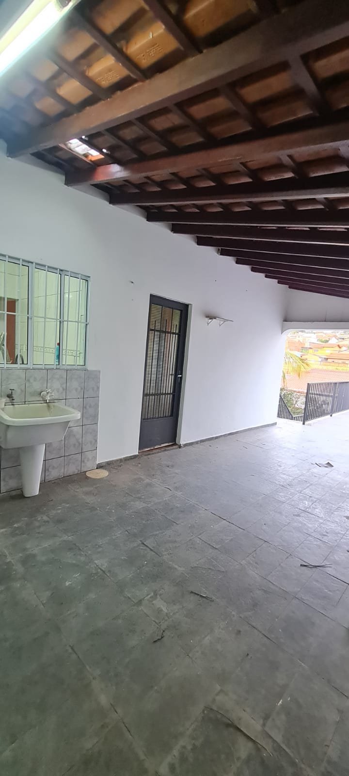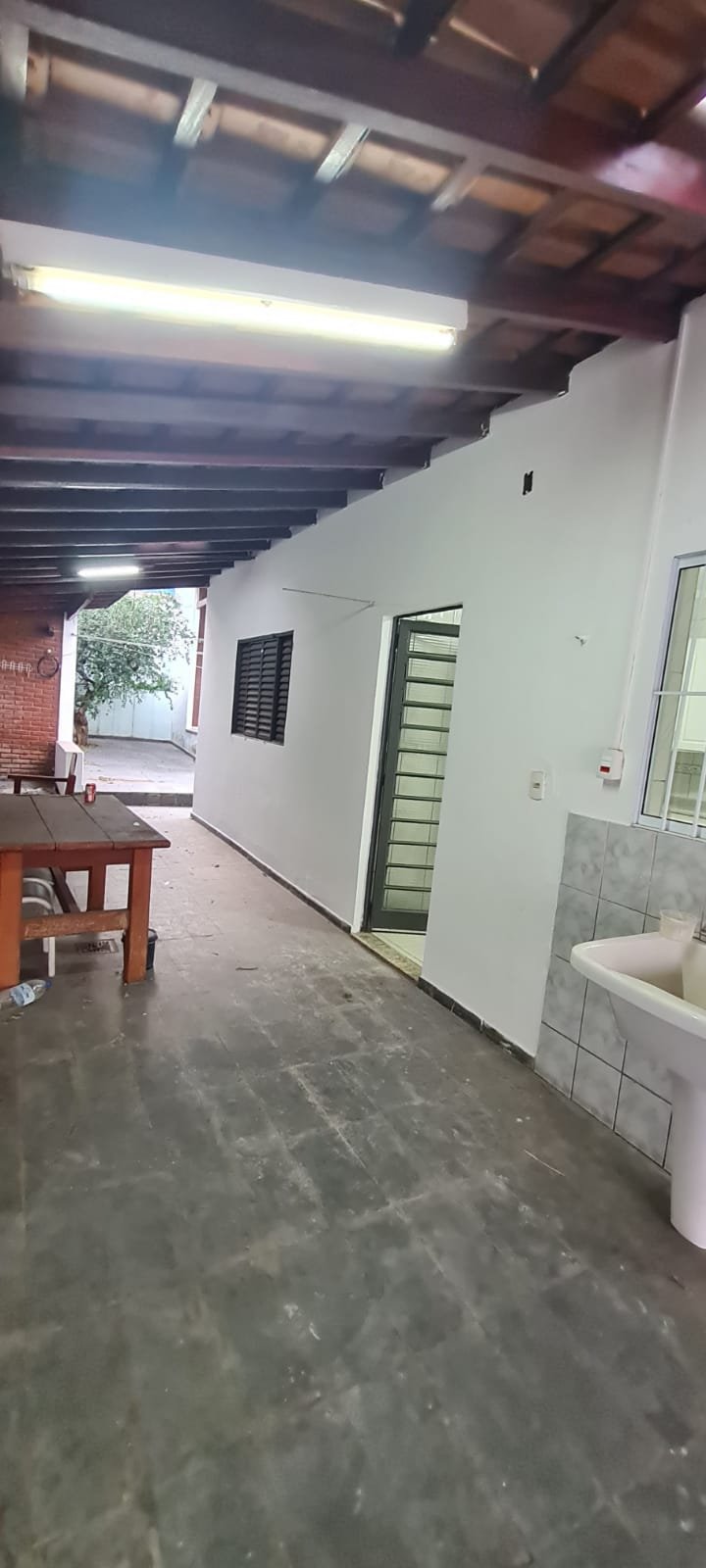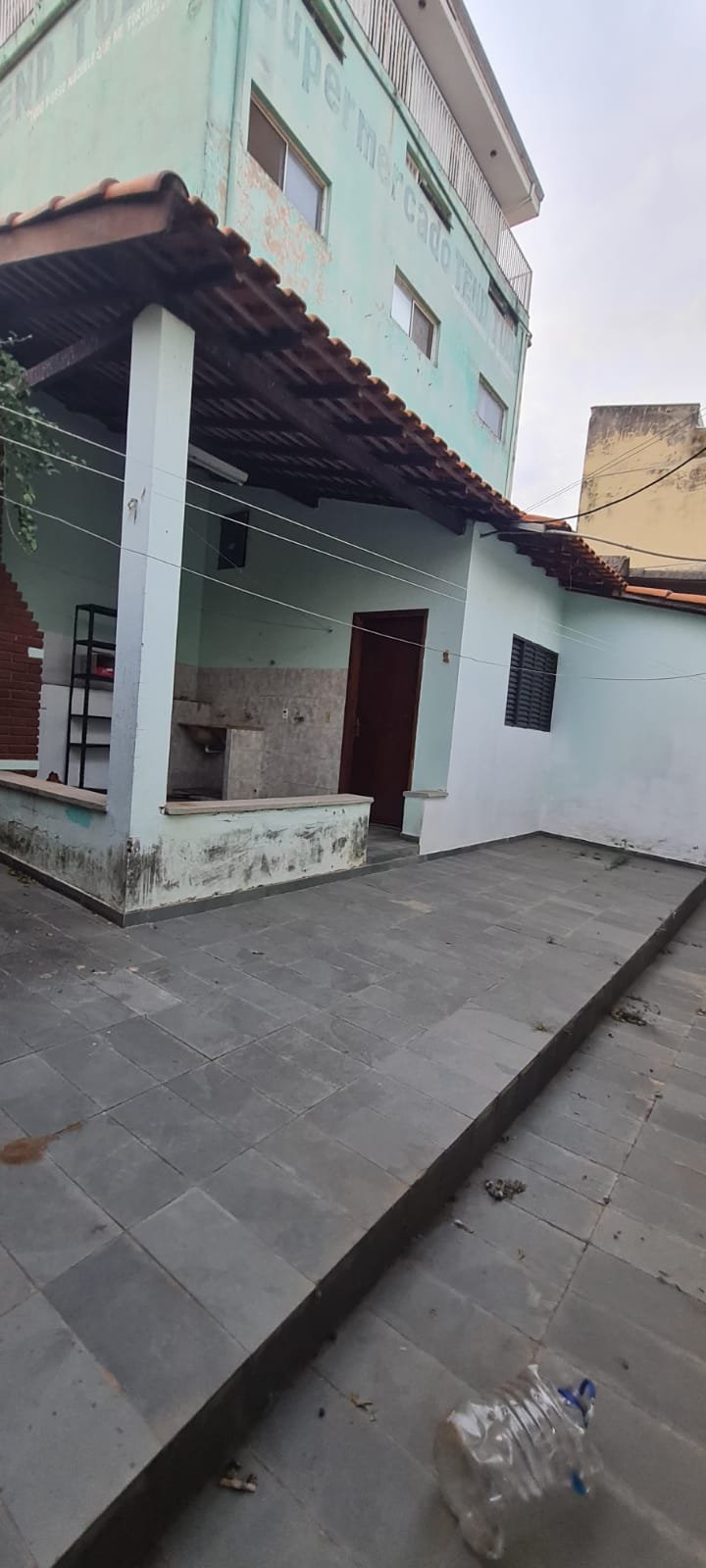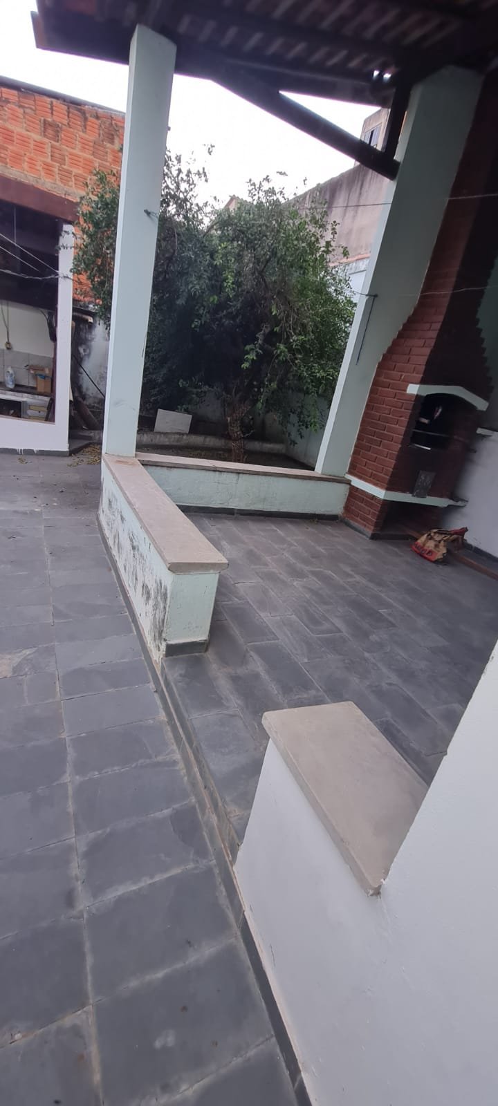 Área da edícula:- Piso ardósia com alguns soltos demais em ordem, paredes com pintura látex na cor verde com marcas de umidade e descascando na parte inferior e desgaste natural, telhado com vigas madeira envernizado com desgaste natural e telhas em ordem, 01 luminária tubular florescente em ordem, 01 porta de madeira na cor marrom com desgaste natural, 01 tanque duplo em ordem, 02 torneiras em ordem, parede do tanque com revestimento cerâmico em ordem, 01 churrasqueira de tijolinhos a vista com desgaste natural do tempo restante em ordem, 01 grelha enferrujada, 01 porta de madeira fechadura e maçaneta chave em ordem, 01 janela veneziana em ordem, 01 janela de banheiro com vidros canelados em ordem, interior da edícula não faz parte da locação.