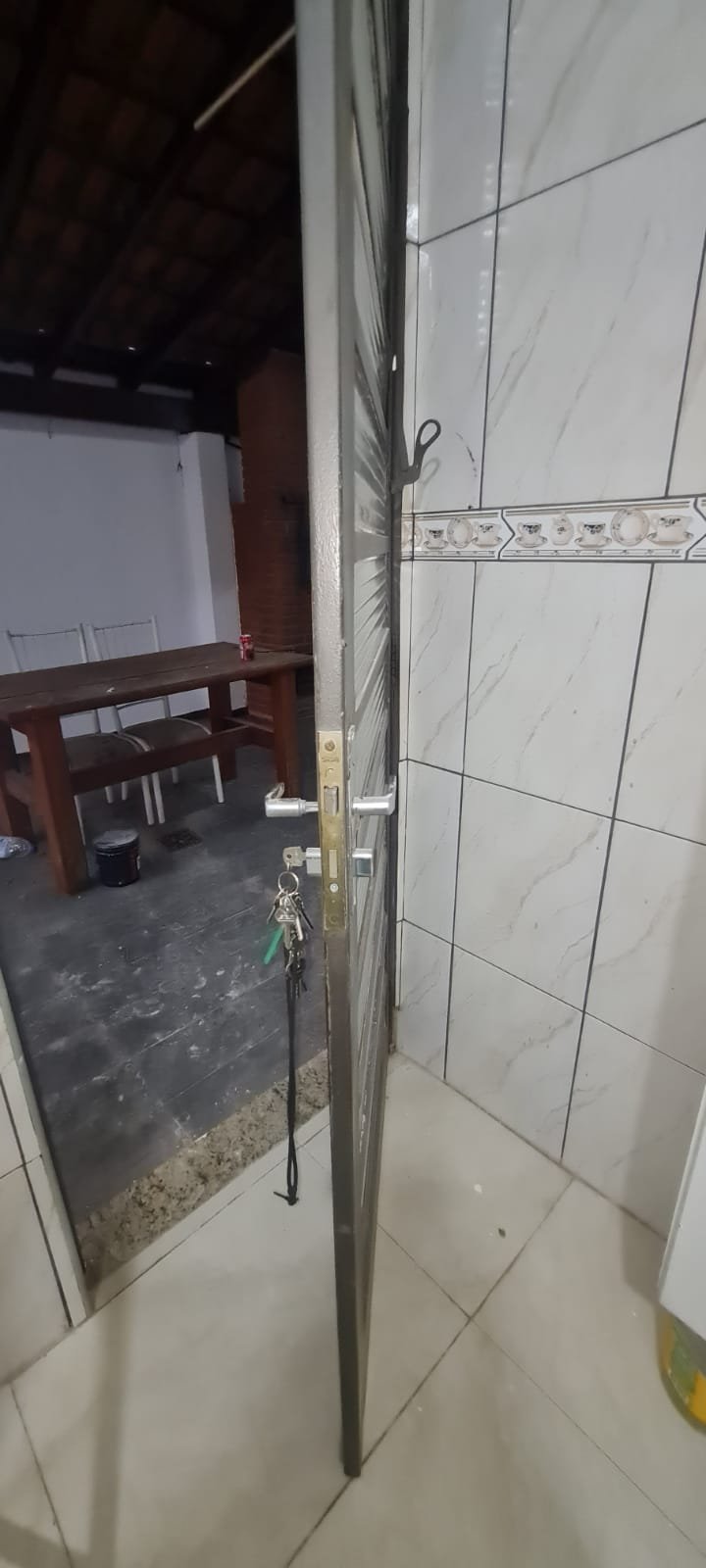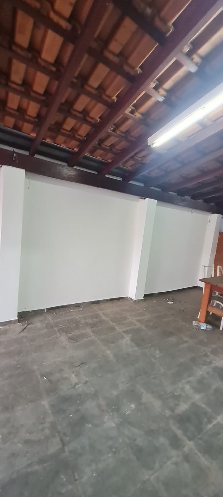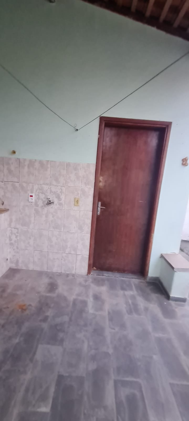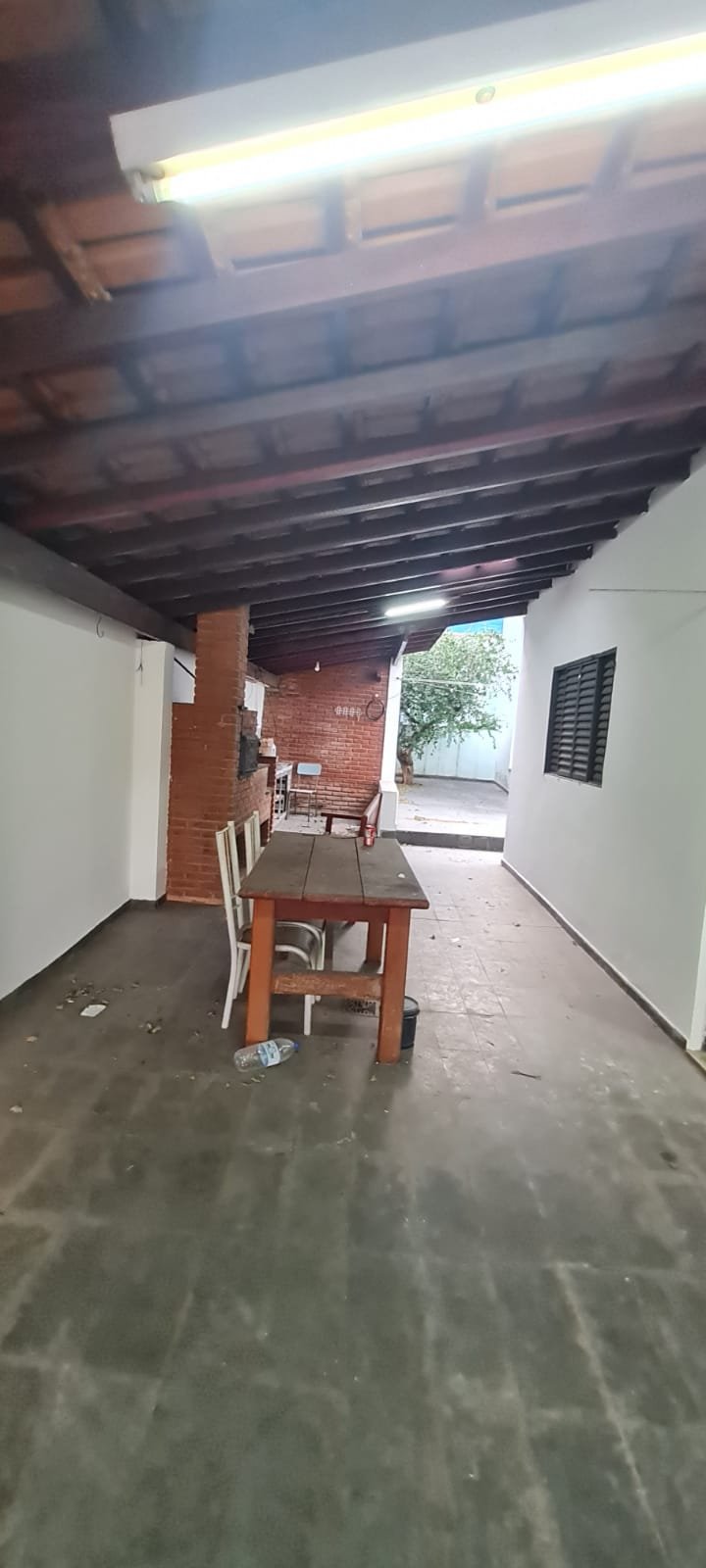 Área da edícula:- Piso ardósia com alguns soltos demais em ordem, paredes com pintura látex na cor verde com marcas de umidade e descascando na parte inferior e desgaste natural, telhado com vigas madeira envernizado com desgaste natural e telhas em ordem, 01 luminária tubular florescente em ordem, 01 porta de madeira na cor marrom com desgaste natural, 01 tanque duplo em ordem, 02 torneiras em ordem, parede do tanque com revestimento cerâmico em ordem, 01 churrasqueira de tijolinhos a vista com desgaste natural do tempo restante em ordem, 01 grelha enferrujada, 01 porta de madeira fechadura e maçaneta chave em ordem, 01 janela veneziana em ordem, 01 janela de banheiro com vidros canelados em ordem, interior da edícula não faz parte da locação.