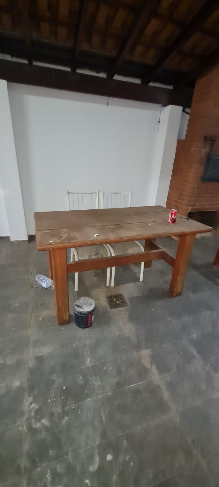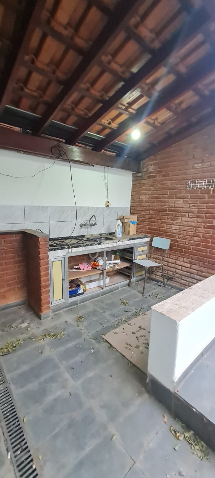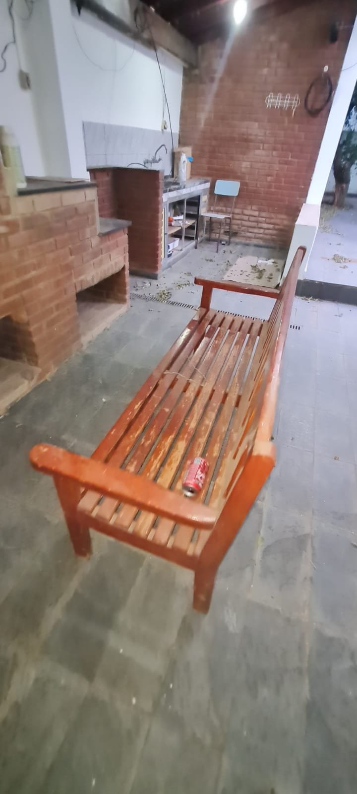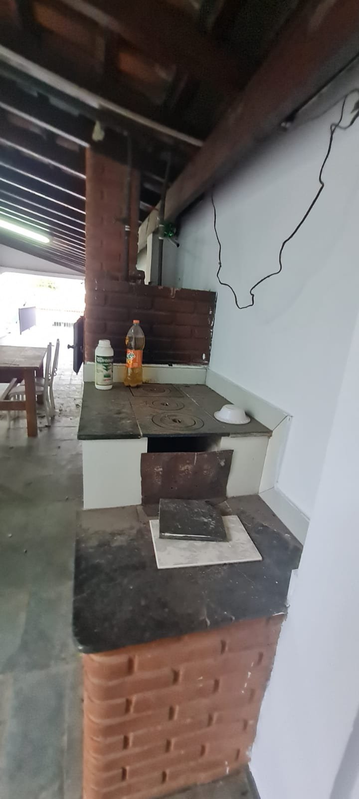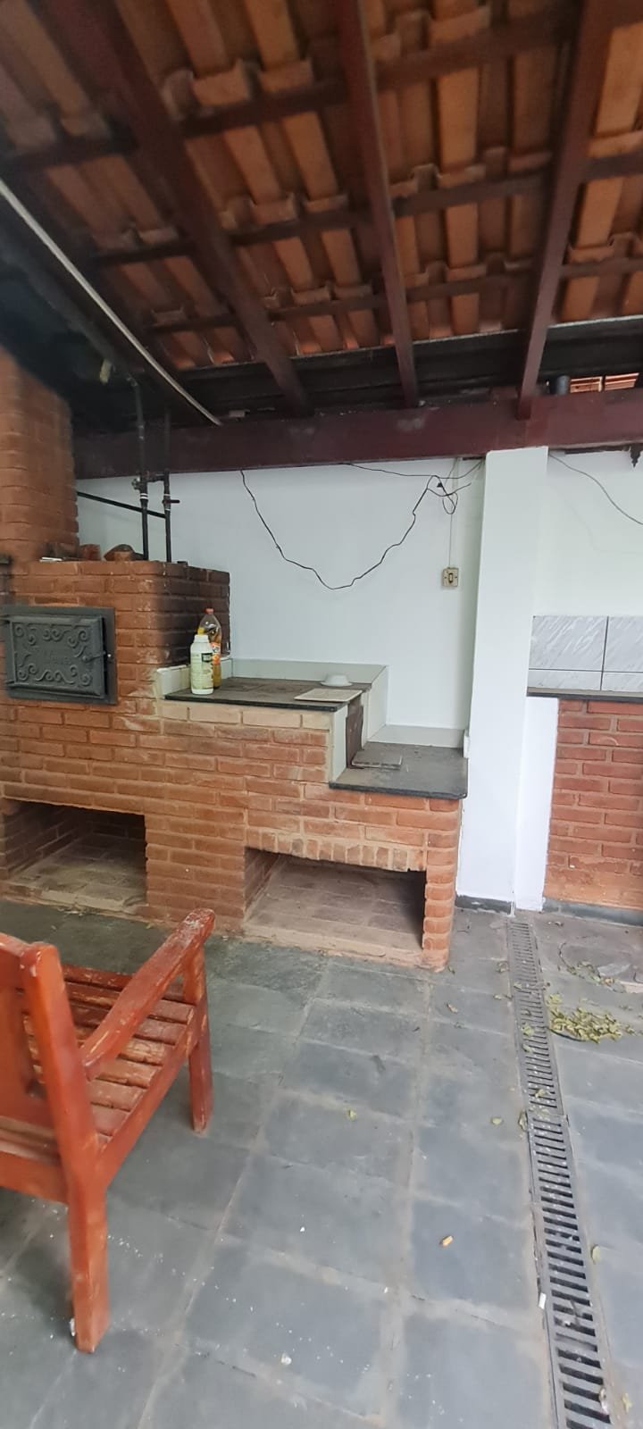 Área de lazer:- Piso ardósia em ordem, paredes com pintura na cor branco recém-pintadas em ordem, fachada da área de lazer com guarda corpo da sacada de ferro pintado na cor cinza em ordem, telhado de madeira com vigas envernizada com desgaste natural do tempo o restante em ordem, telhas de barro e de vidro com desgaste natural do tempo o restante em ordem, 02 guarda corpo de ferro pintado na cor cinza com desgaste natural o restante em ordem, 02 lâmpadas fluorescentes compactas em ordem, tanque de roupa com um rachado o restante em ordem, torneira sifão sem marca em ordem, caixa de gordura em ordem, 01 pia de cozinha em granito em ordem, 01 torneira bica móvel com desgaste natural, 01 gabinete de pia com portas e gavetas quebradas de acrílico quebradas, 01 forno a lenha de tijolo a vista com 01 pedra de granito quebrada, refratário em ordem, bocas do fogão de ferro em ordem, aquecedor e fogão a lenha não funciona sem marca em ordem, parede do fundo da área de lazer de tijolo a vista com marcas de umidade e desgaste natural o restante em ordem, 01 banco de madeira maciça em ordem, 01 mesa de madeira maciça em ordem.
