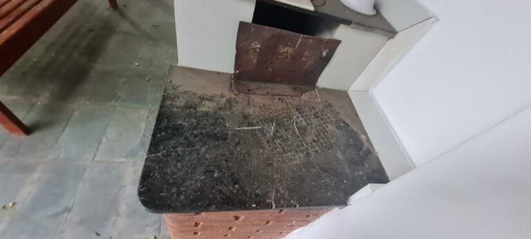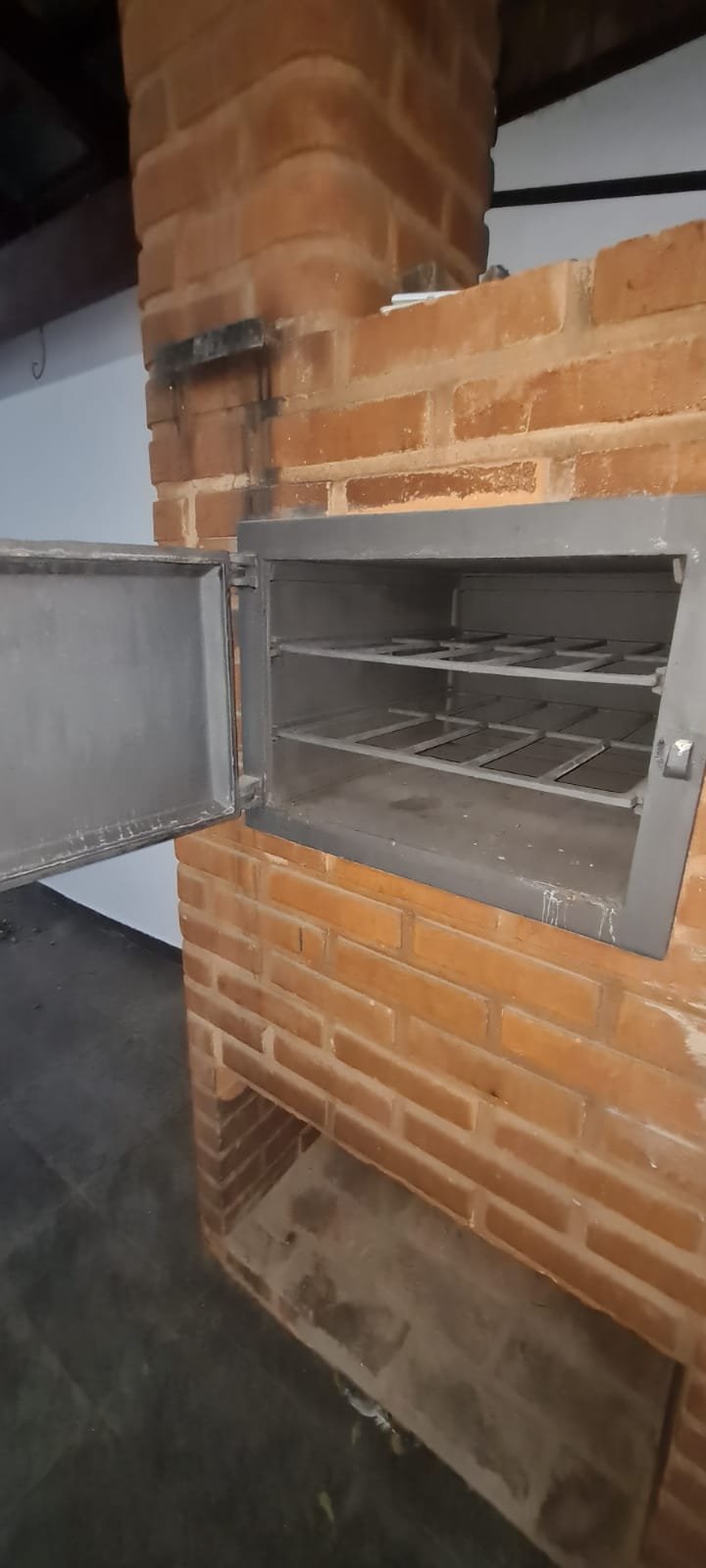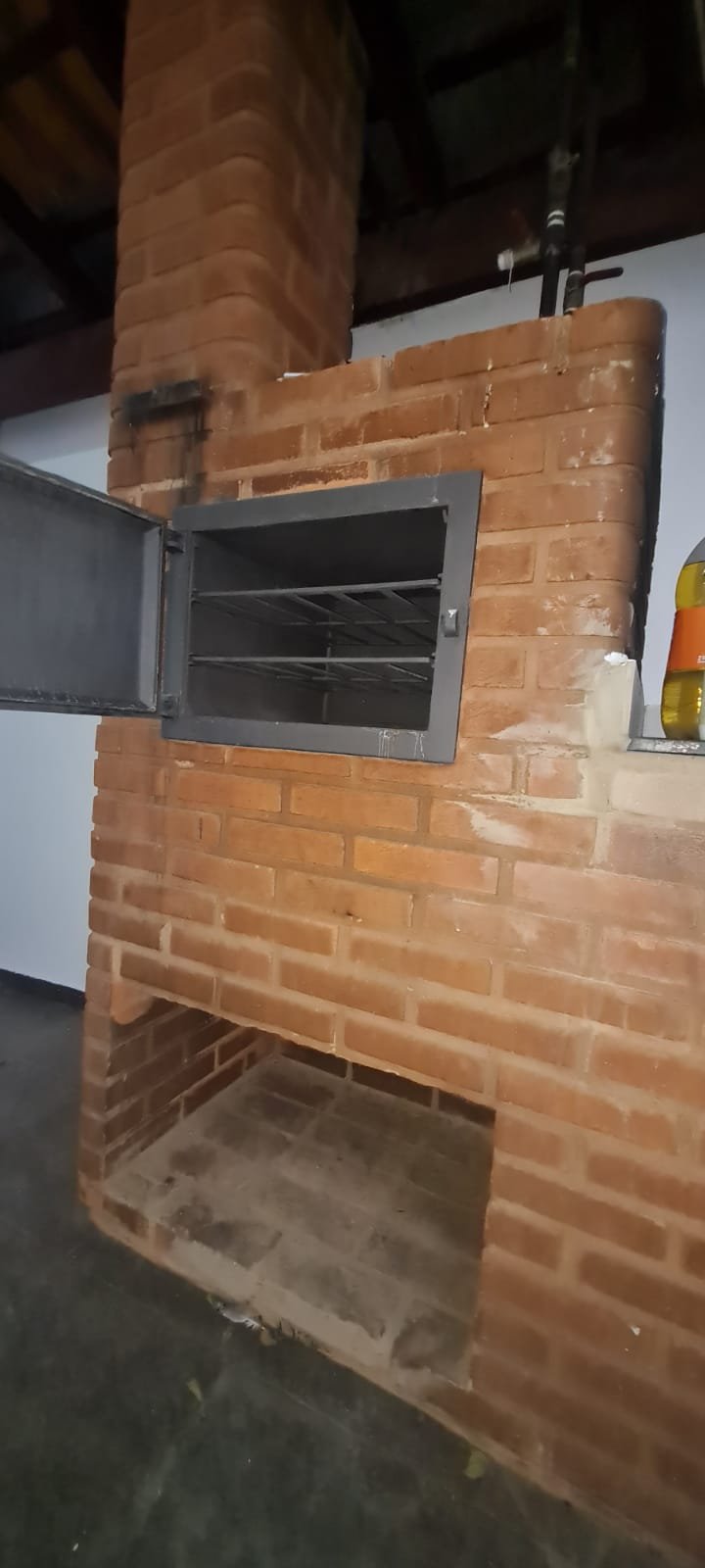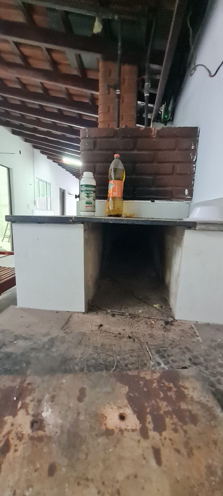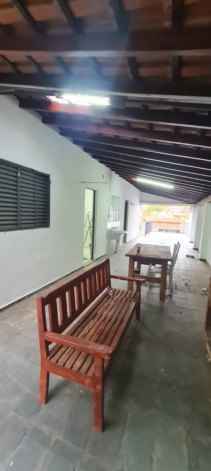 Área de lazer:- Piso ardósia em ordem, paredes com pintura na cor branco recém-pintadas em ordem, fachada da área de lazer com guarda corpo da sacada de ferro pintado na cor cinza em ordem, telhado de madeira com vigas envernizada com desgaste natural do tempo o restante em ordem, telhas de barro e de vidro com desgaste natural do tempo o restante em ordem, 02 guarda corpo de ferro pintado na cor cinza com desgaste natural o restante em ordem, 02 lâmpadas fluorescentes compactas em ordem, tanque de roupa com um rachado o restante em ordem, torneira sifão sem marca em ordem, caixa de gordura em ordem, 01 pia de cozinha em granito em ordem, 01 torneira bica móvel com desgaste natural, 01 gabinete de pia com portas e gavetas quebradas de acrílico quebradas, 01 forno a lenha de tijolo a vista com 01 pedra de granito quebrada, refratário em ordem, bocas do fogão de ferro em ordem, aquecedor e fogão a lenha não funciona sem marca em ordem, parede do fundo da área de lazer de tijolo a vista com marcas de umidade e desgaste natural o restante em ordem, 01 banco de madeira maciça em ordem, 01 mesa de madeira maciça em ordem.