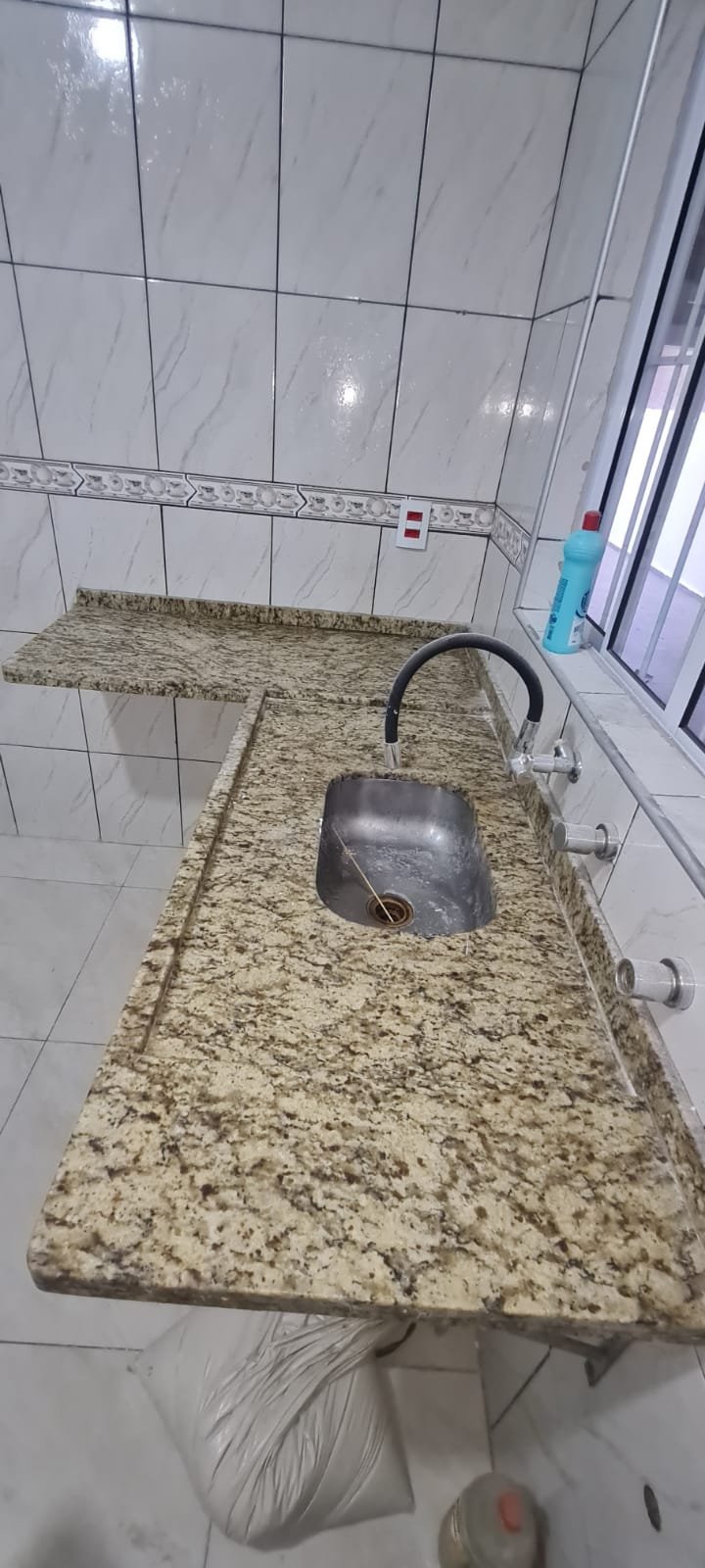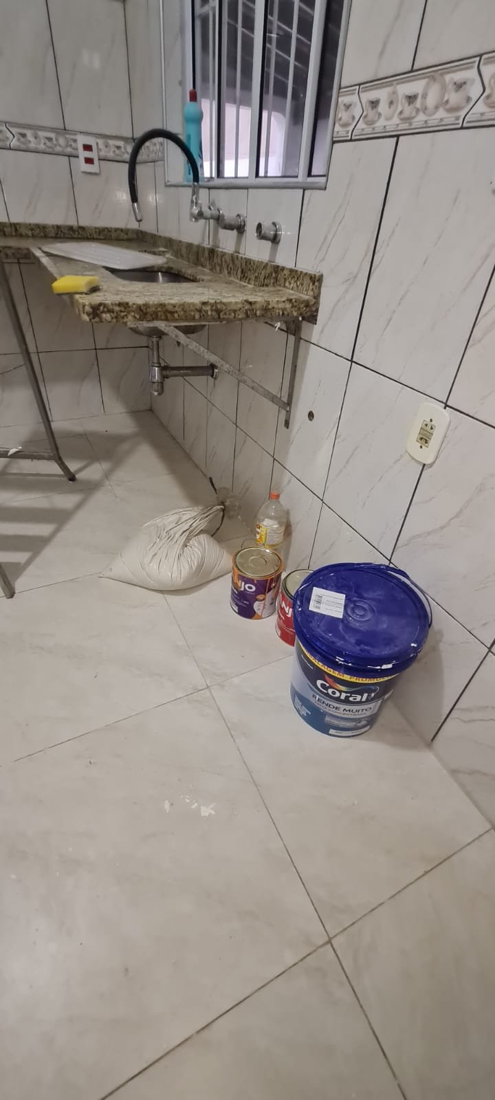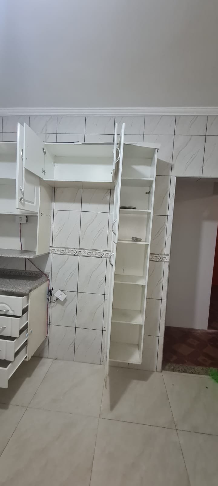 Cozinha:- Porta de ferro com vidro canelado com fechadura e chave em ordem, janela de correr com vidro em ordem, azulejo até o teto na cor branco com faixa com desenhos em ordem, teto com pintura na cor branco recém-pintado em ordem, 01 suporte com 01 lâmpada led em ordem, 06 tomadas em ordem, 03 interruptores em ordem, pia de granito em L com uma marca de ferrugem próxima a cuba o restante em ordem, sifão em ordem, torneira gourmet em ordem, cuba de inox e ralo desentupido em ordem, armário sem marca com 11 portas sendo 03 com vidro transparente na cor branca em ordem, piso cerâmico com desgaste natural do tempo o restante em ordem.